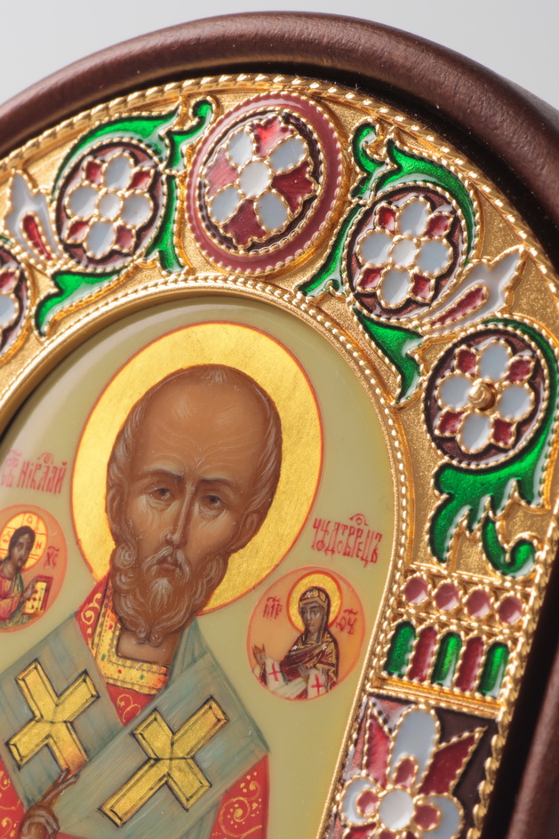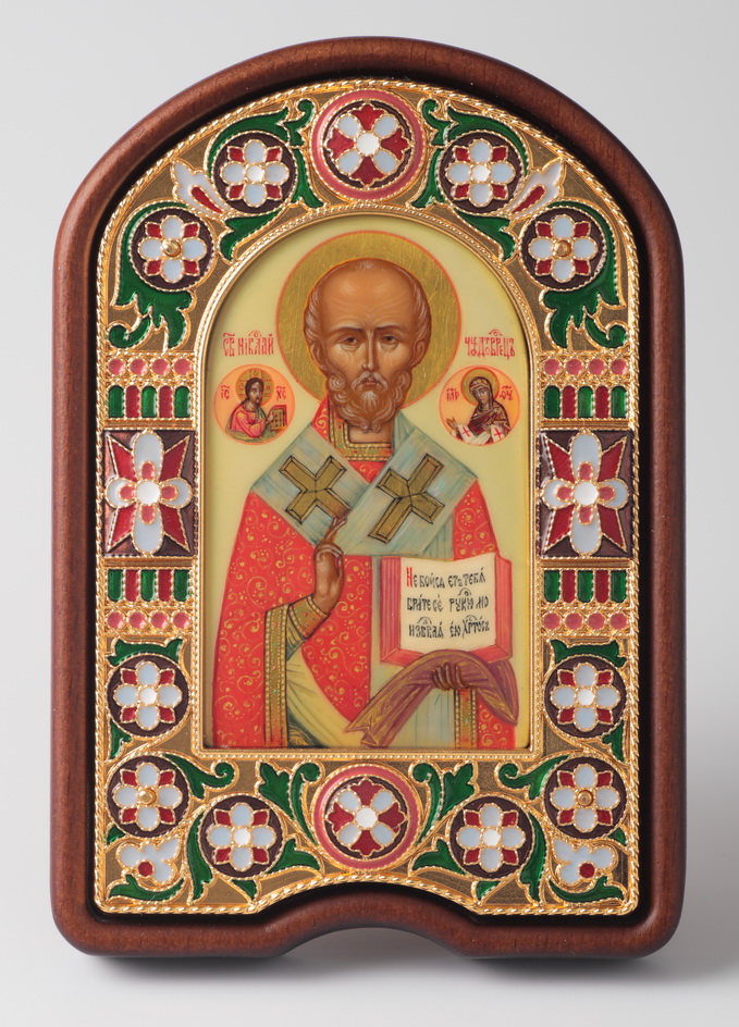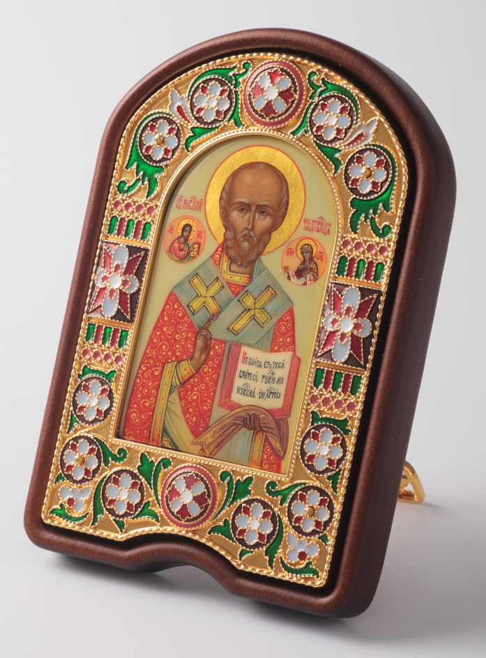 Икона именная №2 гальванопластика, эмаль, финифть, в деревянной рамке / золочение, электрофорез / Николай Чудотворец