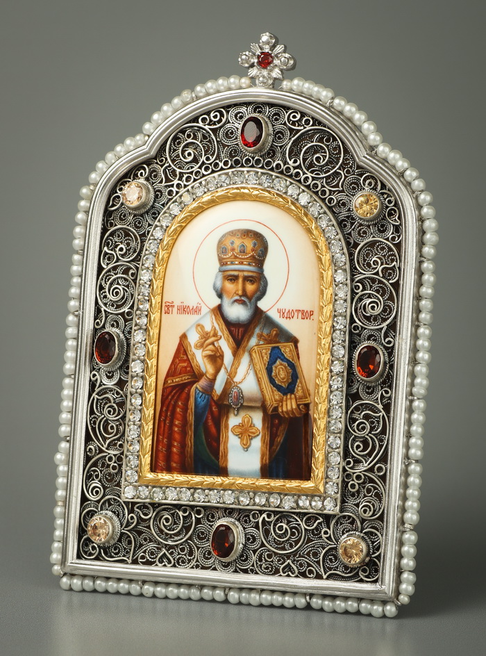 Икона именная №26 финифть, филигрань в деревянной рамке / золочение / серебро Николай Чудотворец (УИН)