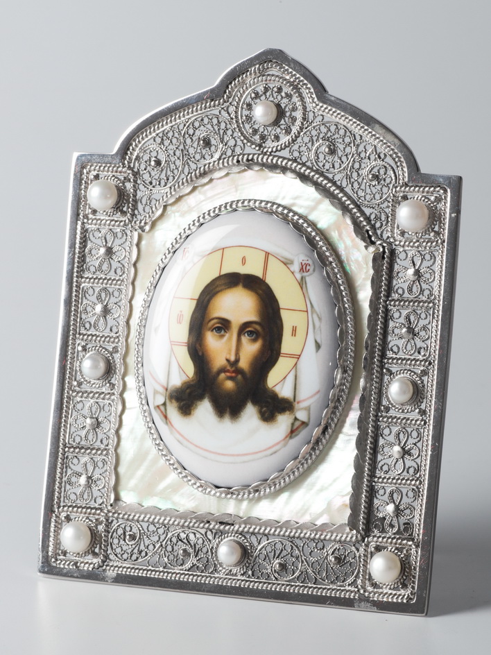 Икона именная №29 деколь, филигрань серебро Спас Нерукотворный (УИН)