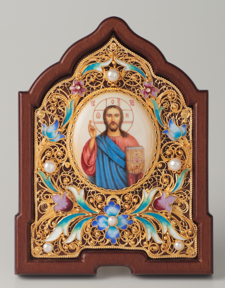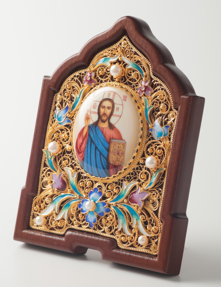 Икона именная №30 финифть, филигрань, эмалевые накладки в деревянной рамке / золочение