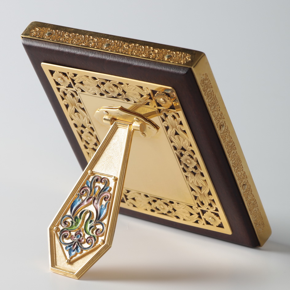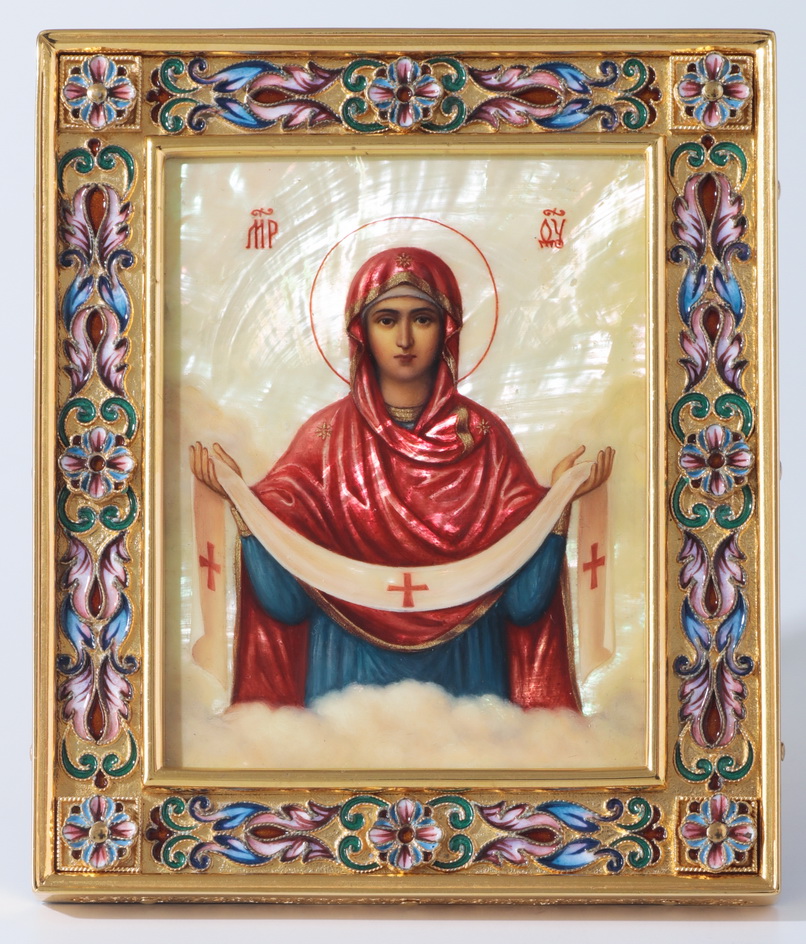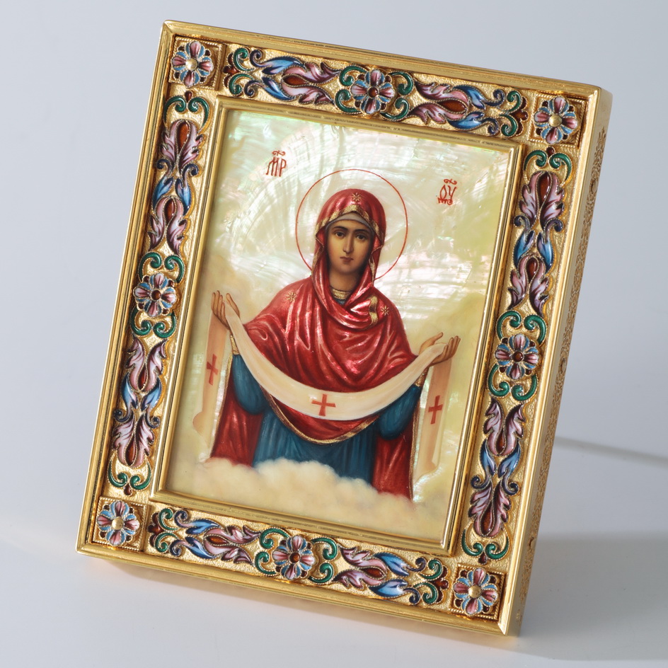 Икона именная №32 живопись, филигрань, эмаль, роспись, деревянная рамка серебро / золочение / Покров Пресвятой БМ (УИН)