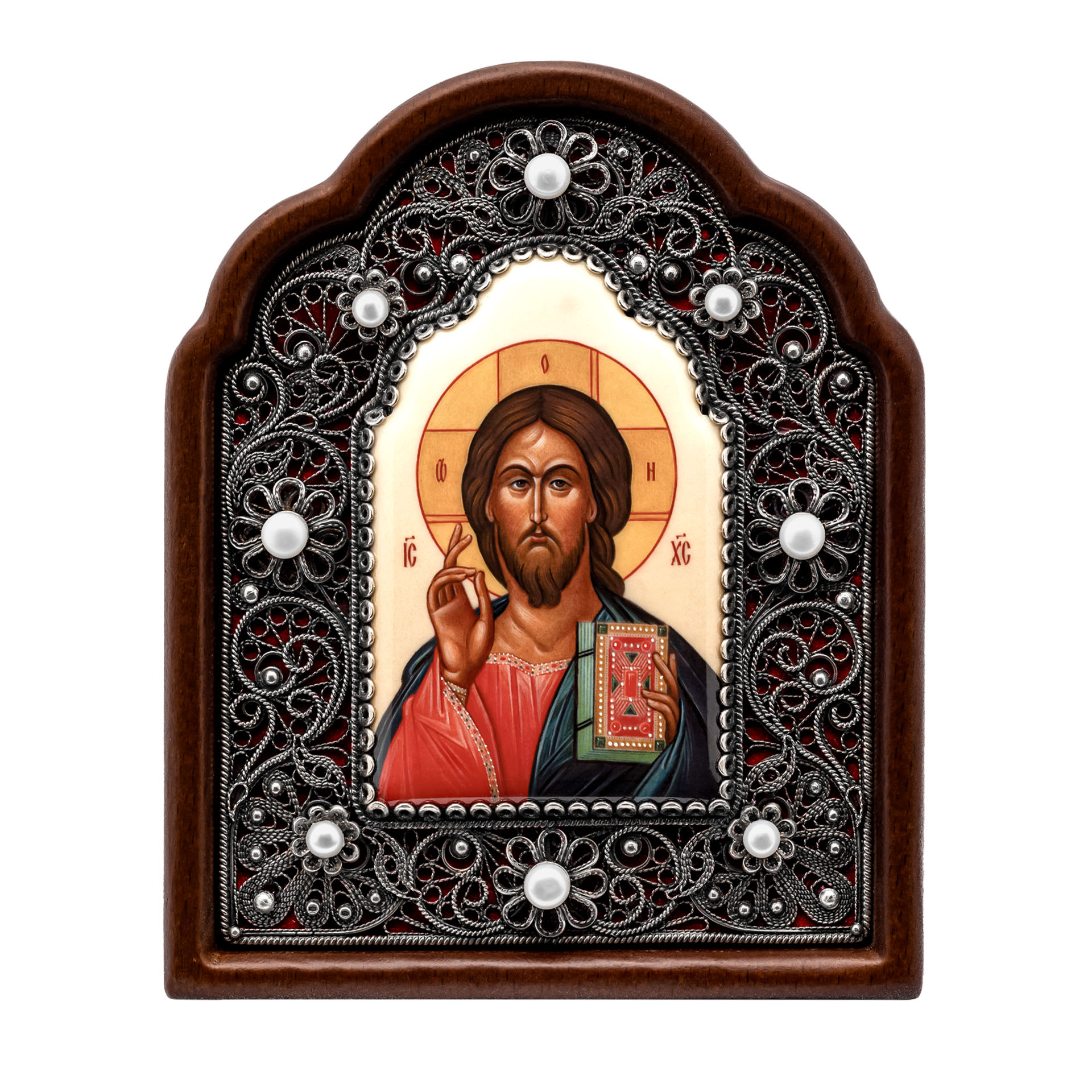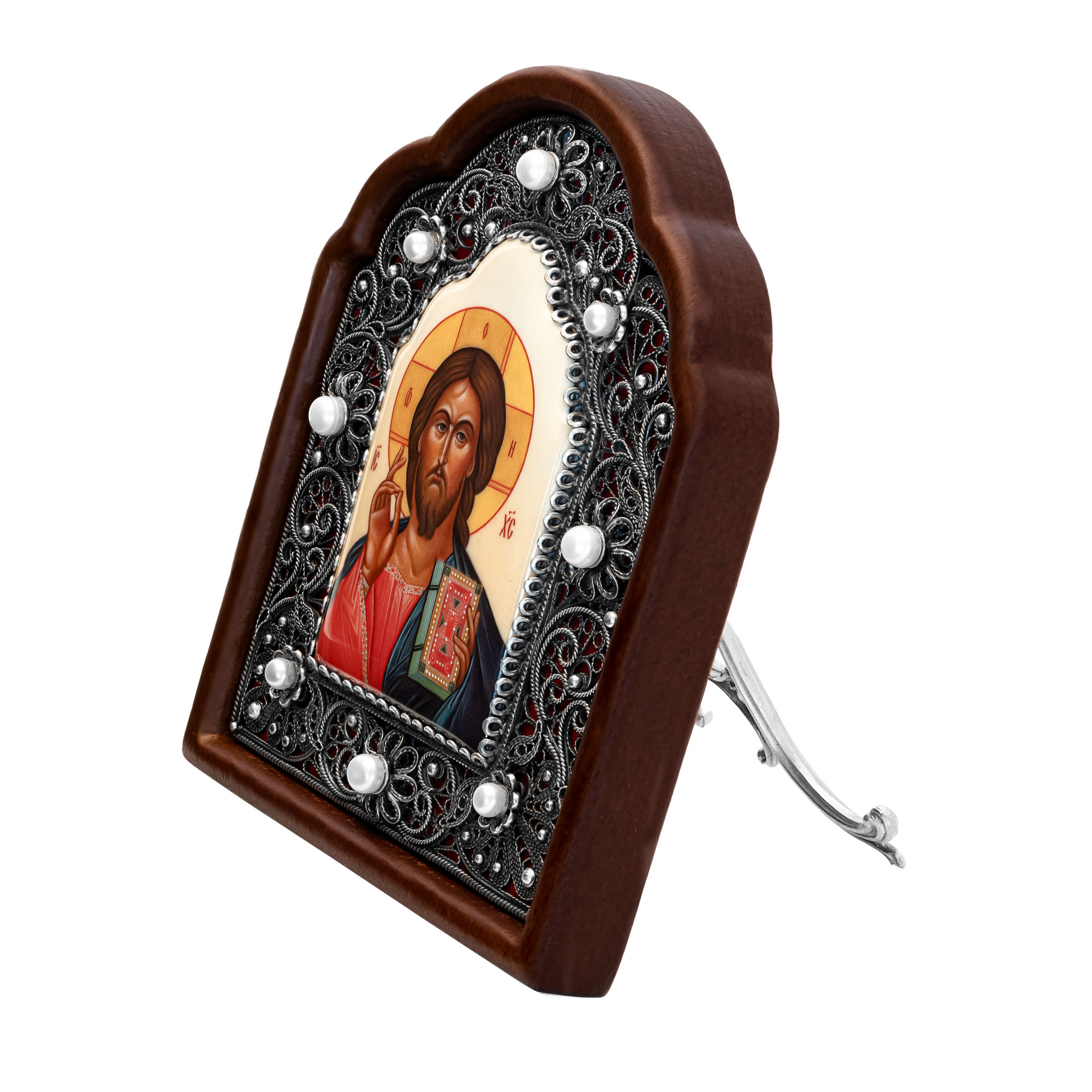 Икона именная №62 деколь филигрань, в деревянной рамке серебро Господь Вседержитель (УИН)
