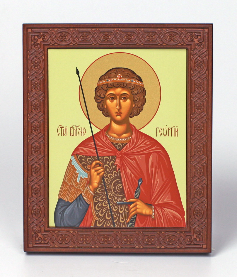 Икона на дереве 18х22 прокат, ковчег с резным обрамлением, упаковка Георгий Победоносец