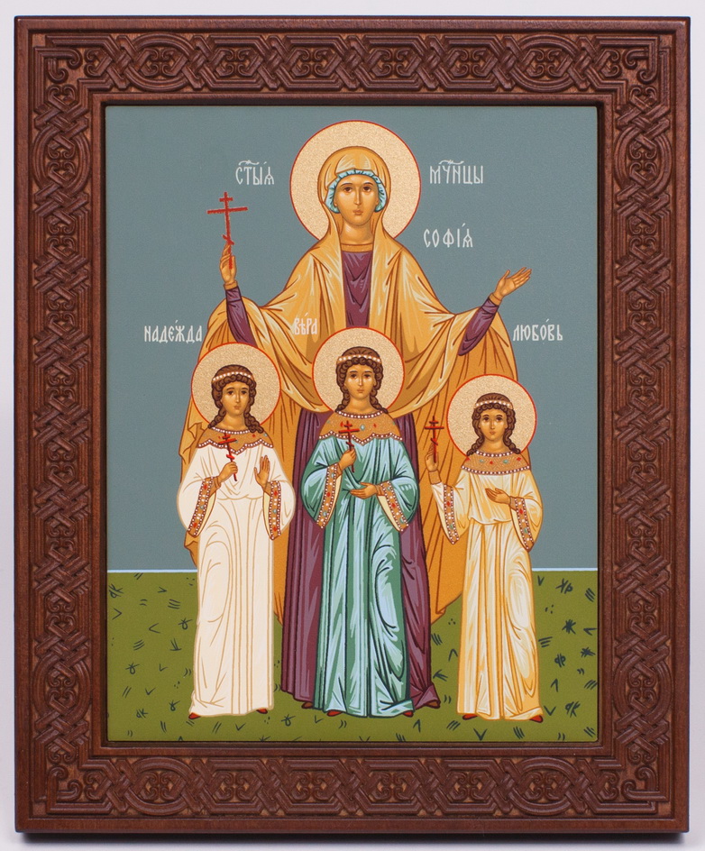 Икона на дереве 18х22 прокат, ковчег с резным обрамлением, упаковка Вера Надежда Любовь
