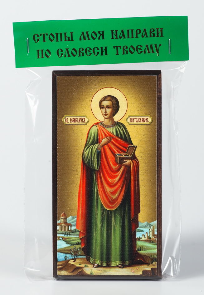 Икона на дереве 6х12 канвас, упаковка, ярлык Пантелеимон