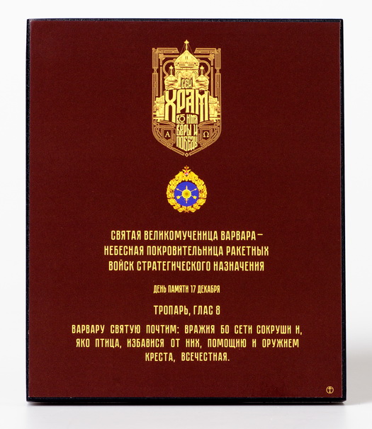 Данная икона была изготовлена ко дню Великого Освящения Святейшим Патриархом Московским и Всея Руси Кириллом Главного Храма Вооруженных Сил Российской Федерации и станет замечательным, памятным подарком человеку, связанному с военной службой.