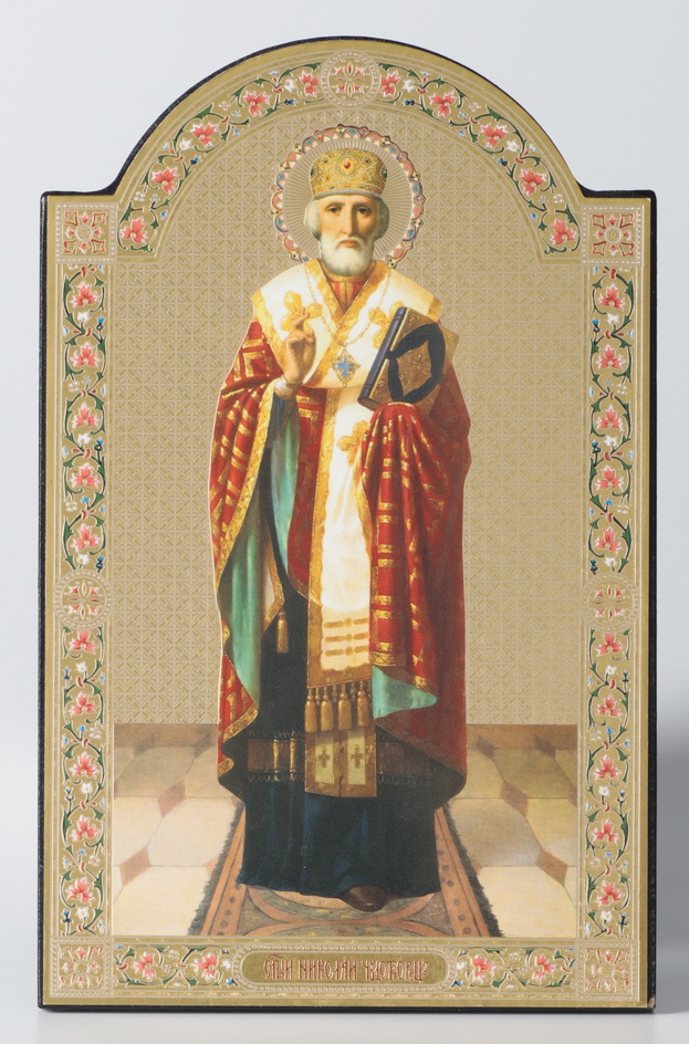 Икона на деревянном планшете 11х13 двойное тиснение, арочная Николай Чудотворец 14 (ростовой)