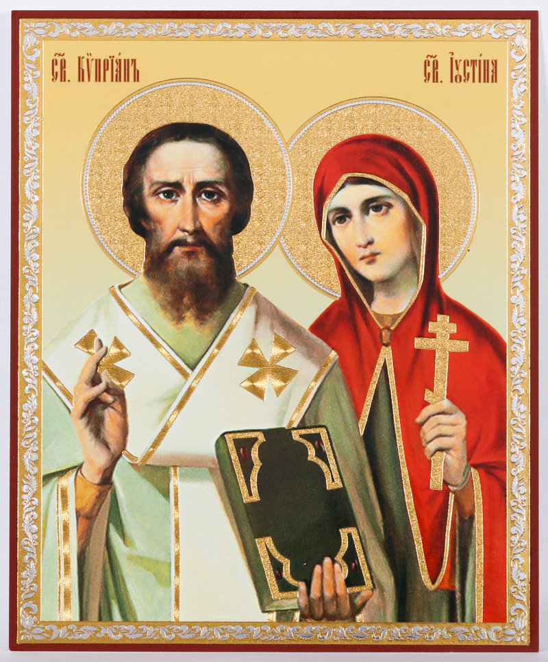 Икона на деревянном планшете 11х13 двойное тиснение Киприан и Иустина 2