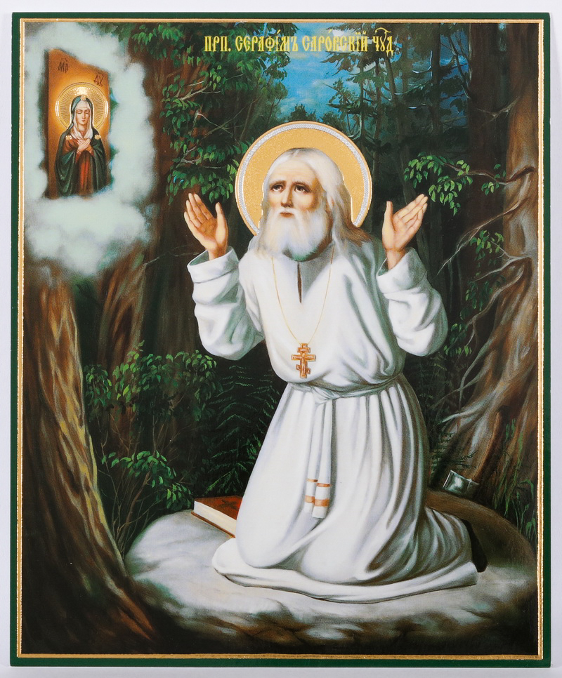 Икона на деревянном планшете 11х13 двойное тиснение Моление Серафима Саровского на камне 2