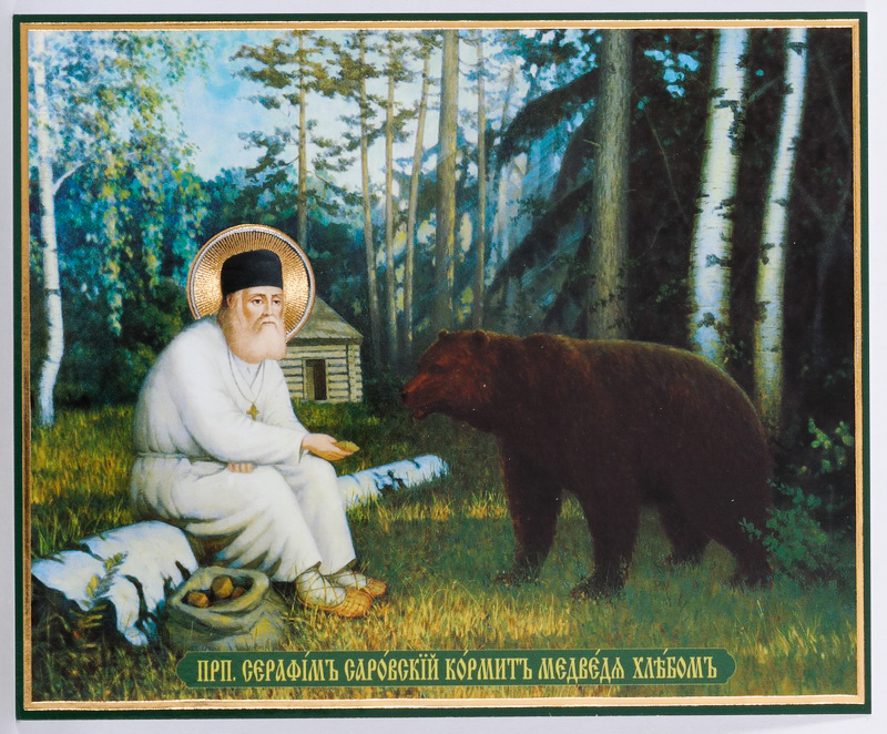 Икона на деревянном планшете 11х13 двойное тиснение Серафим Саровский с медведем