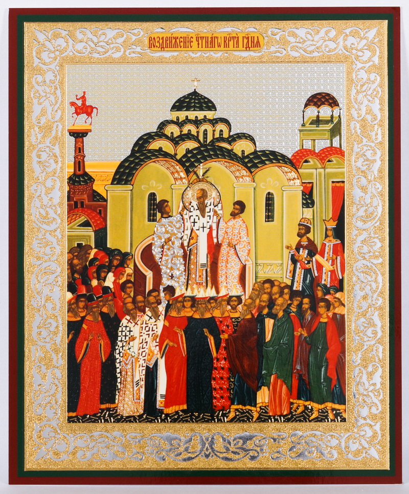Икона на деревянном планшете 11х13 двойное тиснение Воздвижение Креста Господня
