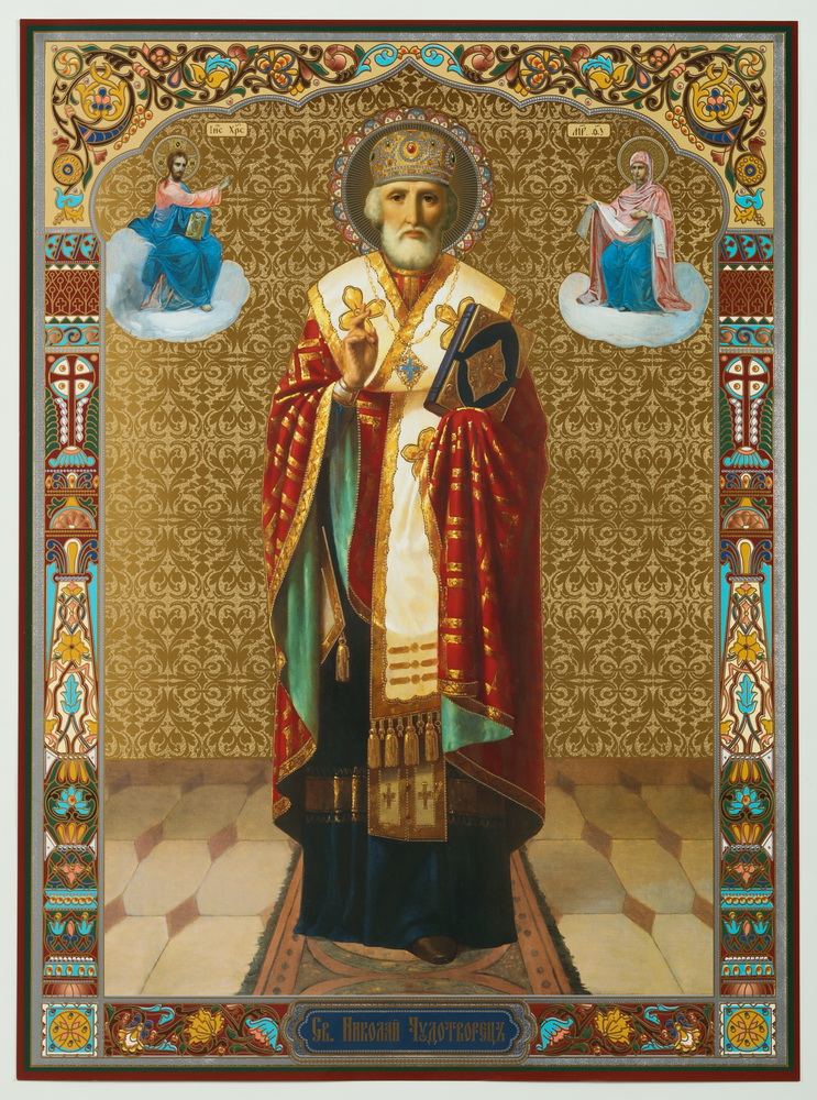 Икона на деревянном планшете 30х40 двойное тиснение, ДСП, ПВХ Николай Чудотворец с предстоящими (рост.)