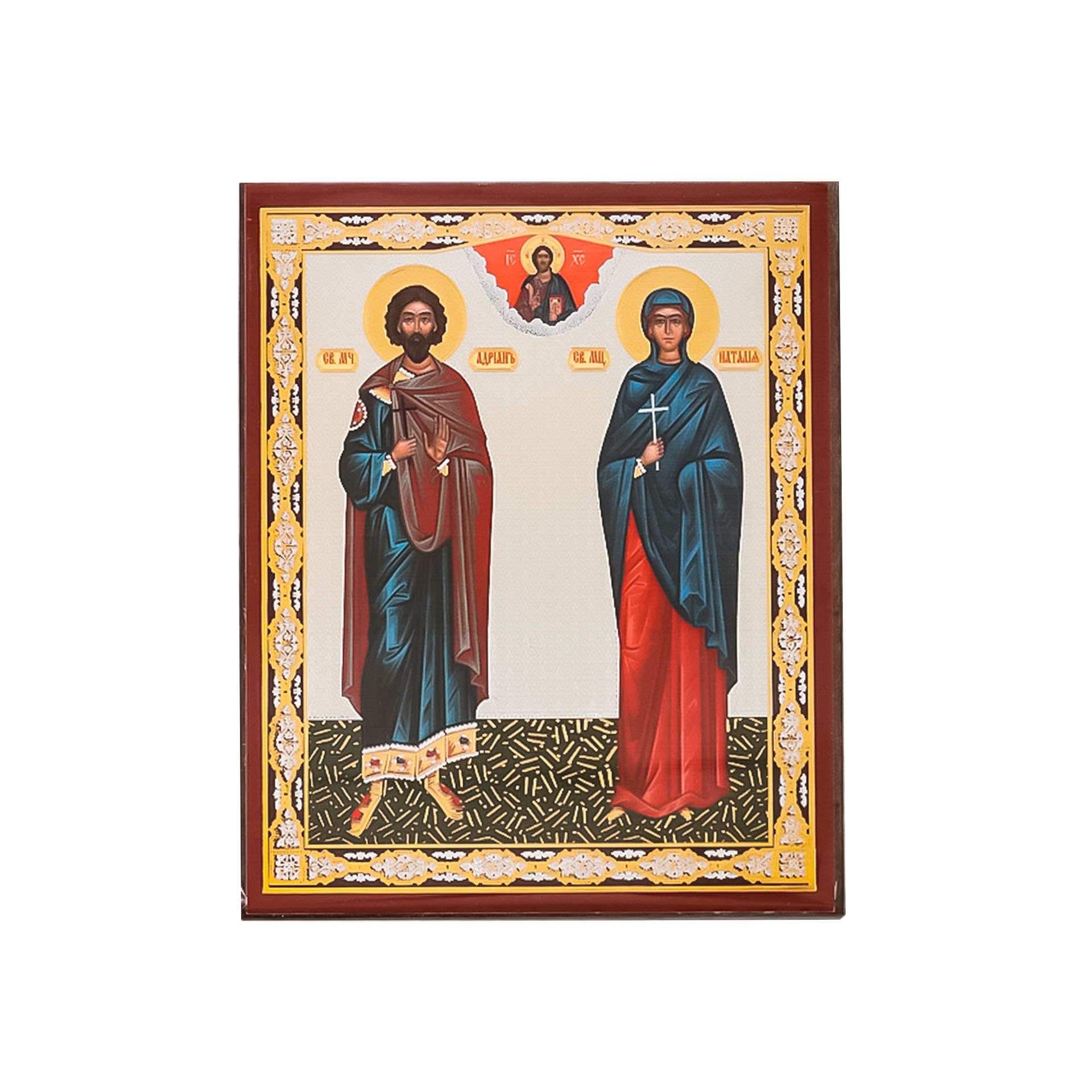 Икона на деревянном планшете 6х9 двойное тиснение, аннотация, упаковка Адриан и Наталия 2