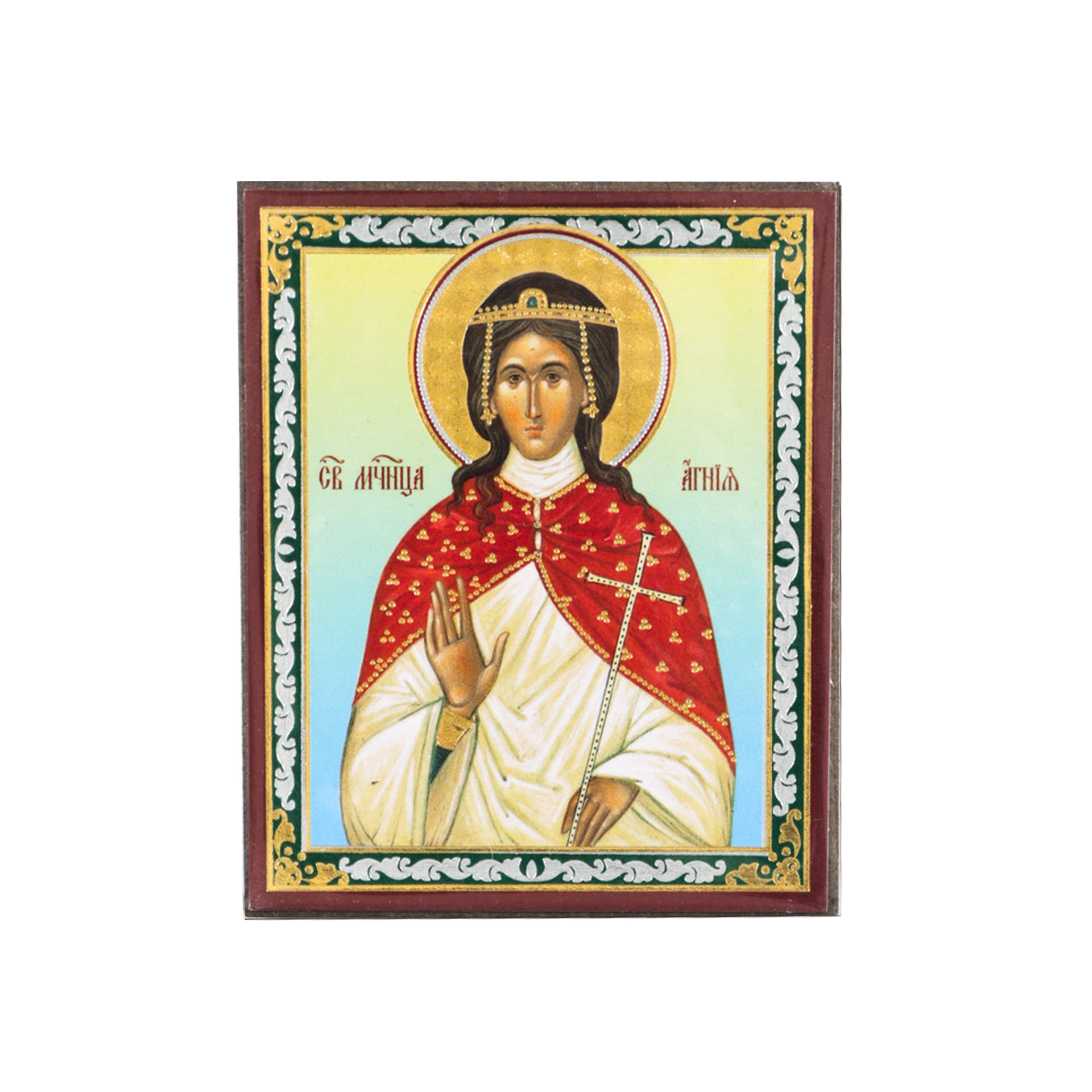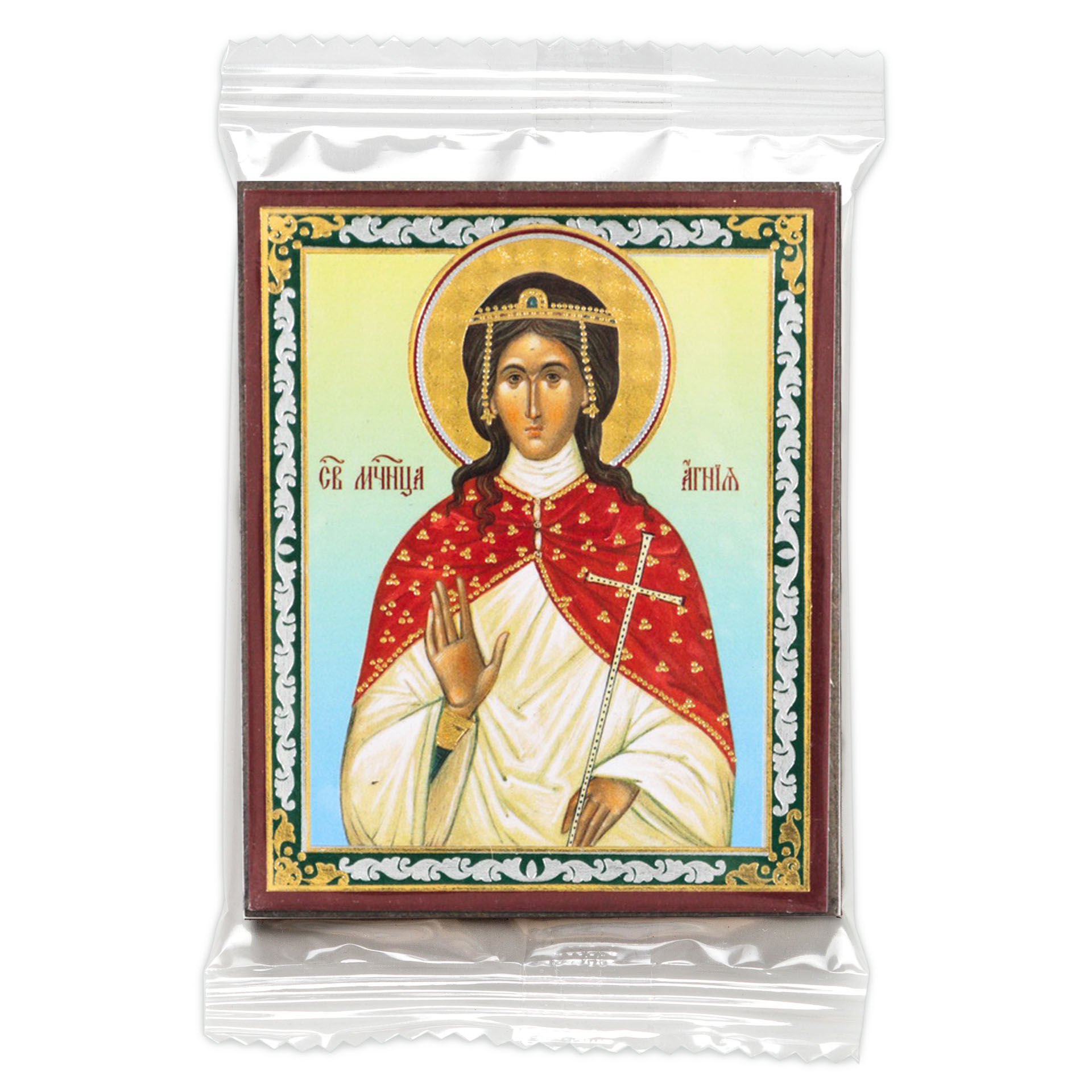 Икона на деревянном планшете 6х9 двойное тиснение, аннотация, упаковка Агния