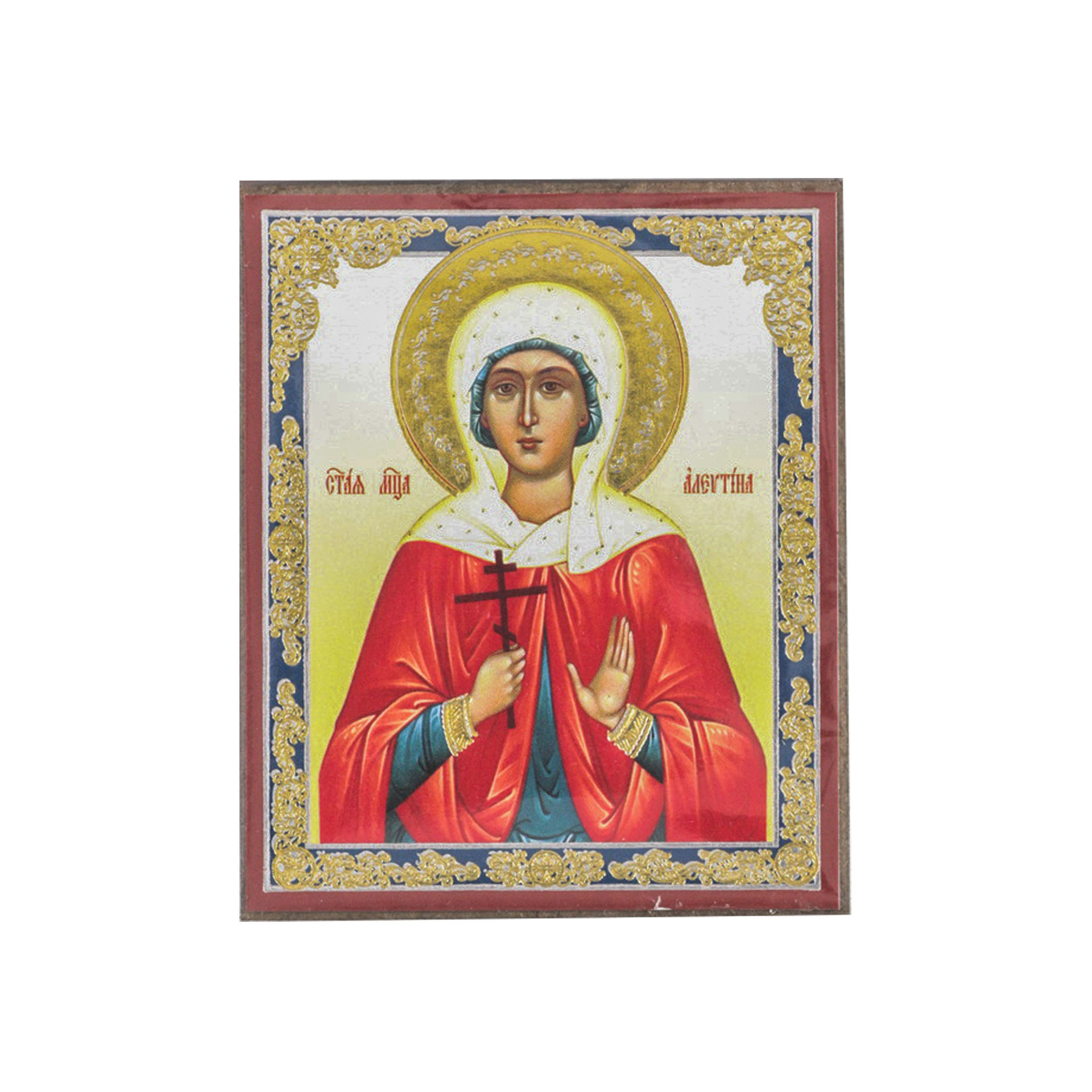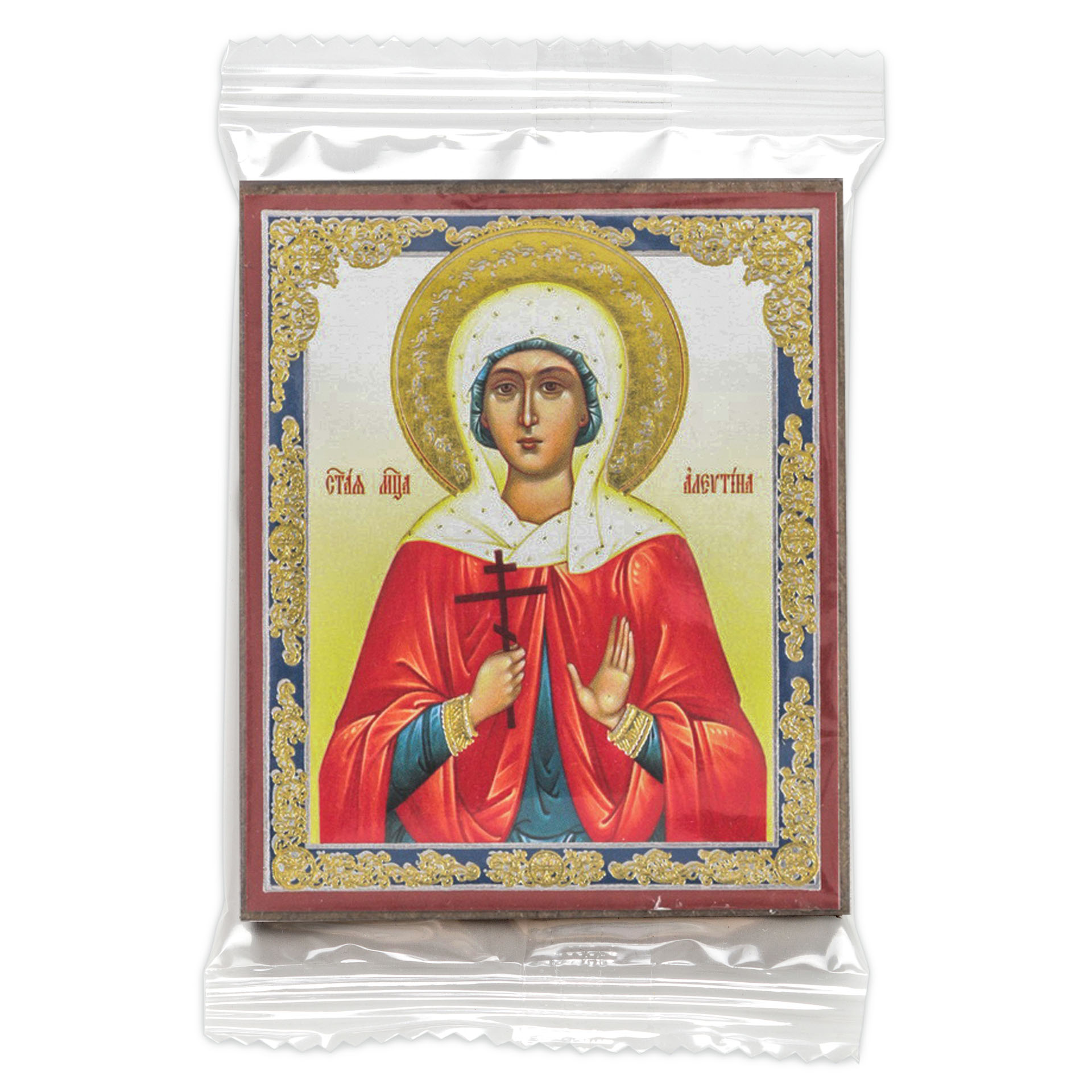 Икона на деревянном планшете 6х9 двойное тиснение, аннотация, упаковка Алевтина Кесарийская, мц. (3)
