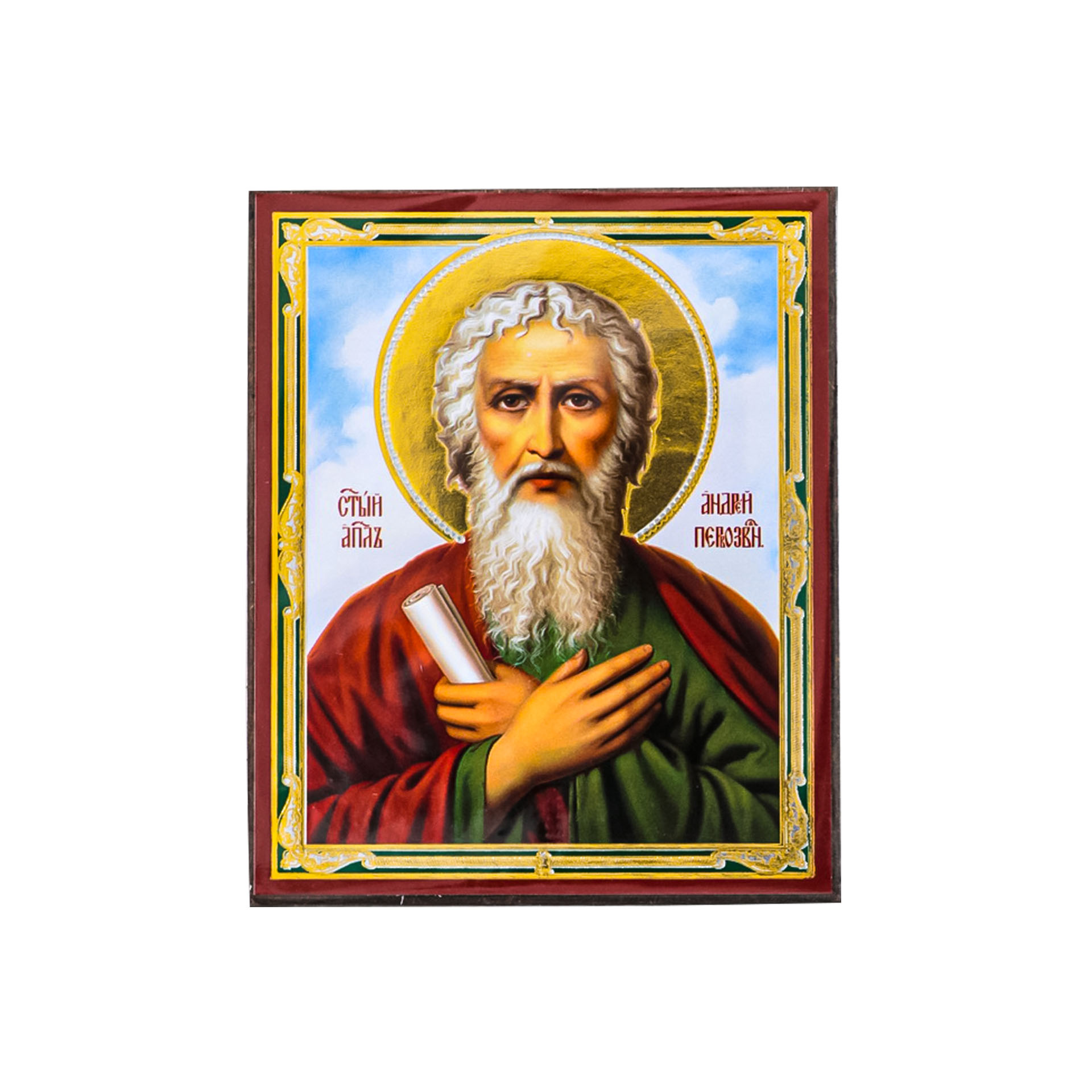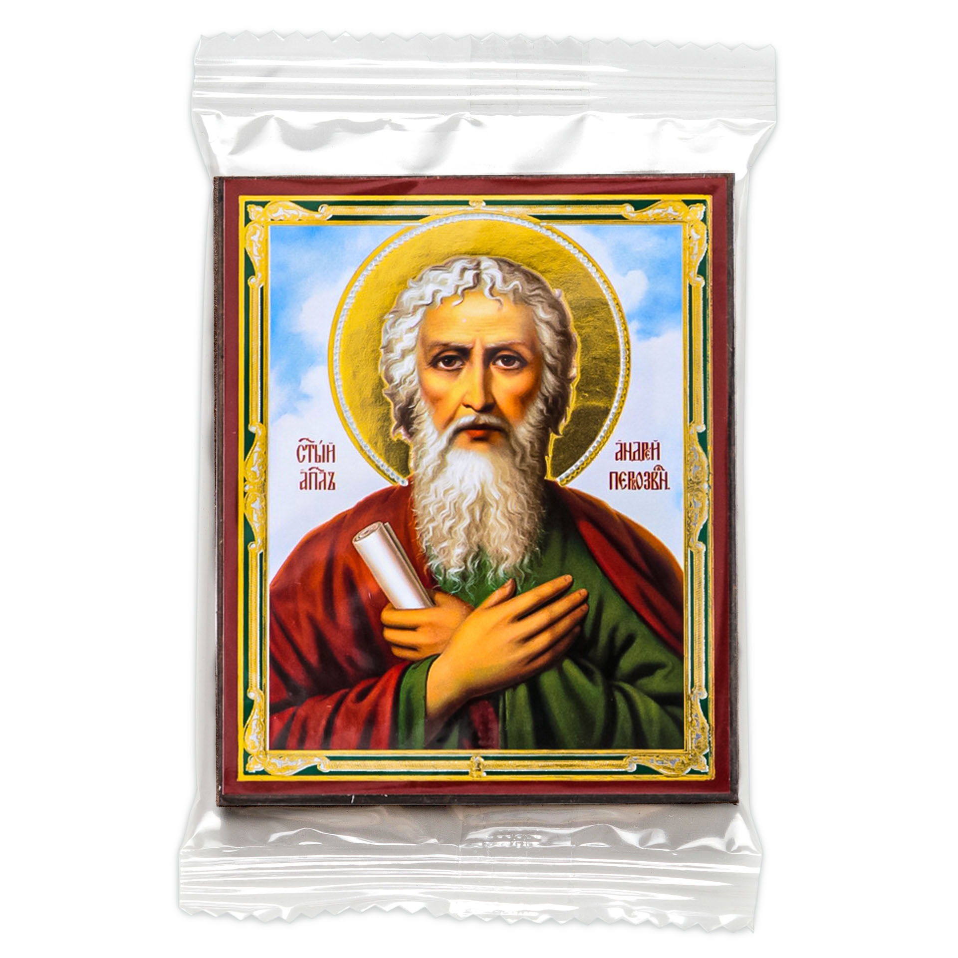 Икона на деревянном планшете 6х9 двойное тиснение, аннотация, упаковка Андрей Первозванный 3
