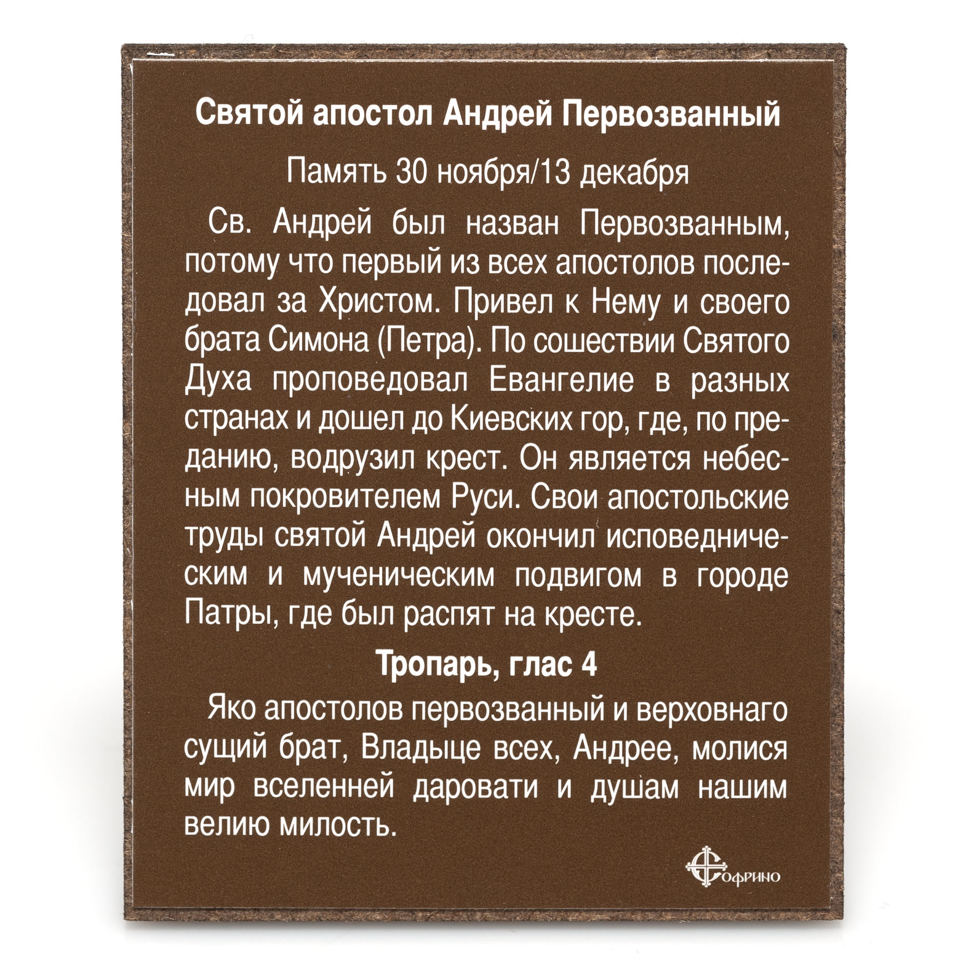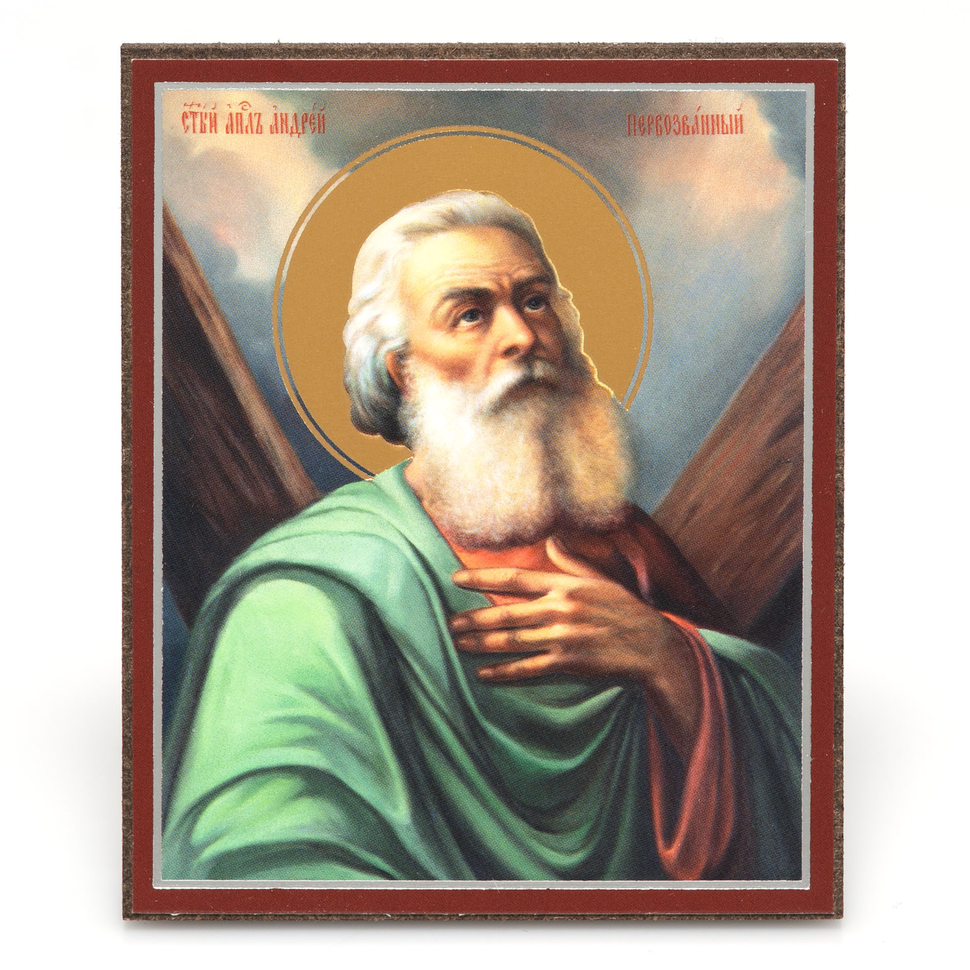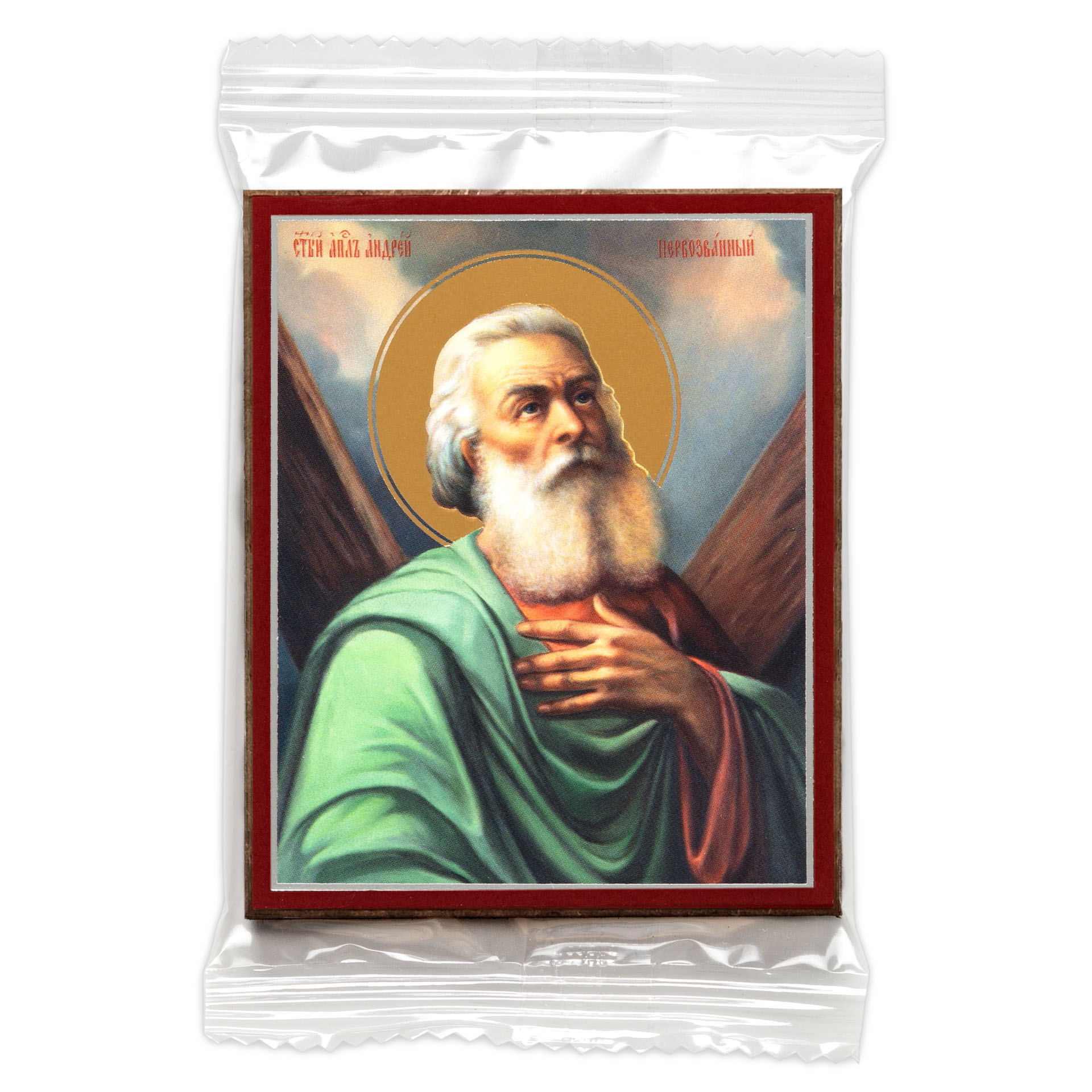 Икона на деревянном планшете 6х9 двойное тиснение, аннотация, упаковка Андрей Первозванный 6