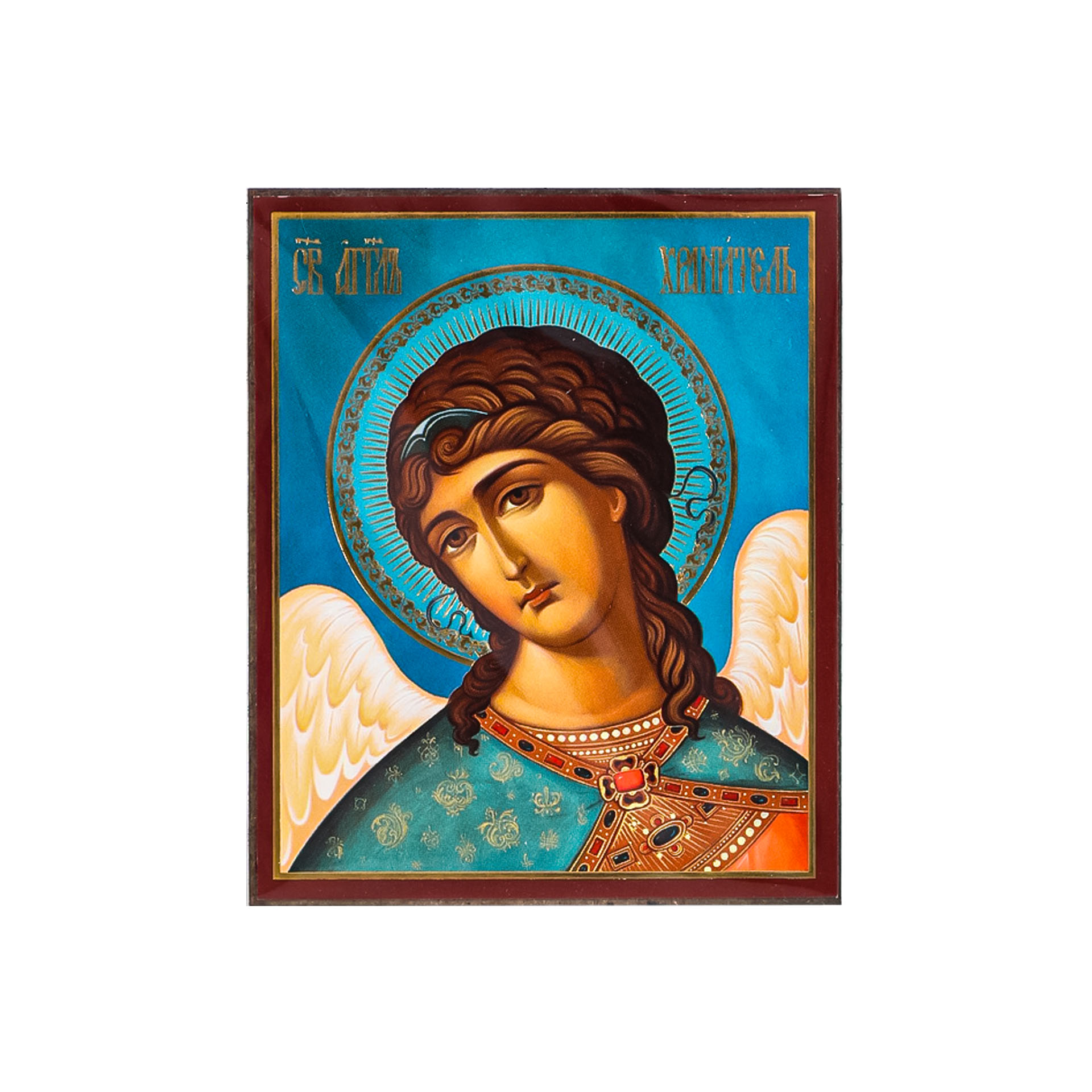 Икона на деревянном планшете 6х9 двойное тиснение, аннотация, упаковка Ангел-Хранитель (поясной) №34
