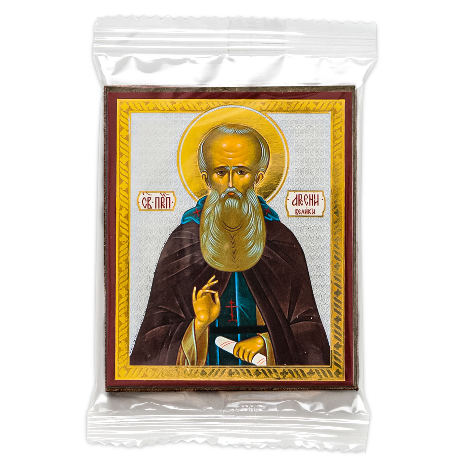 Икона на деревянном планшете 6х9 двойное тиснение, аннотация, упаковка Арсений Великий