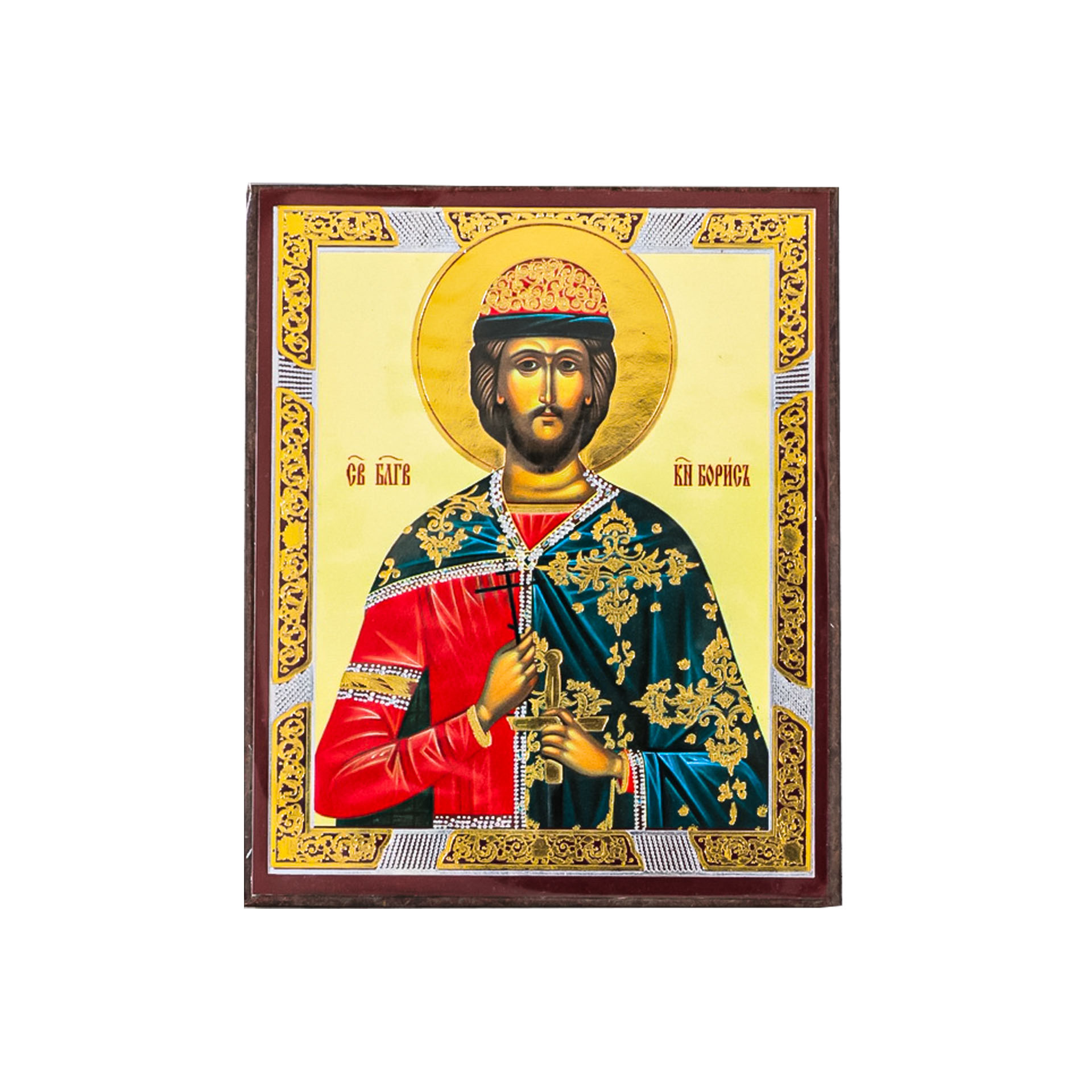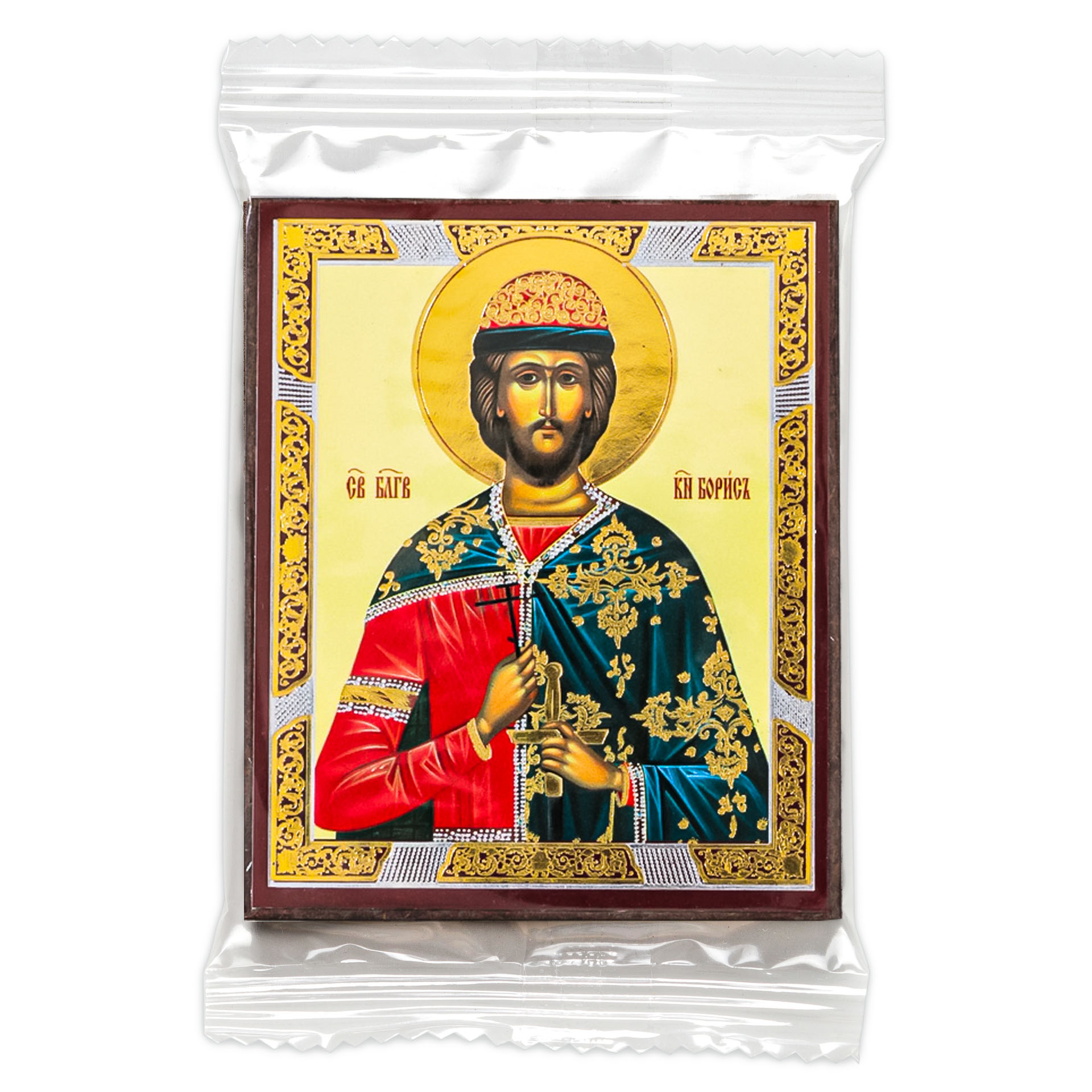 Икона на деревянном планшете 6х9 двойное тиснение, аннотация, упаковка Борис 3