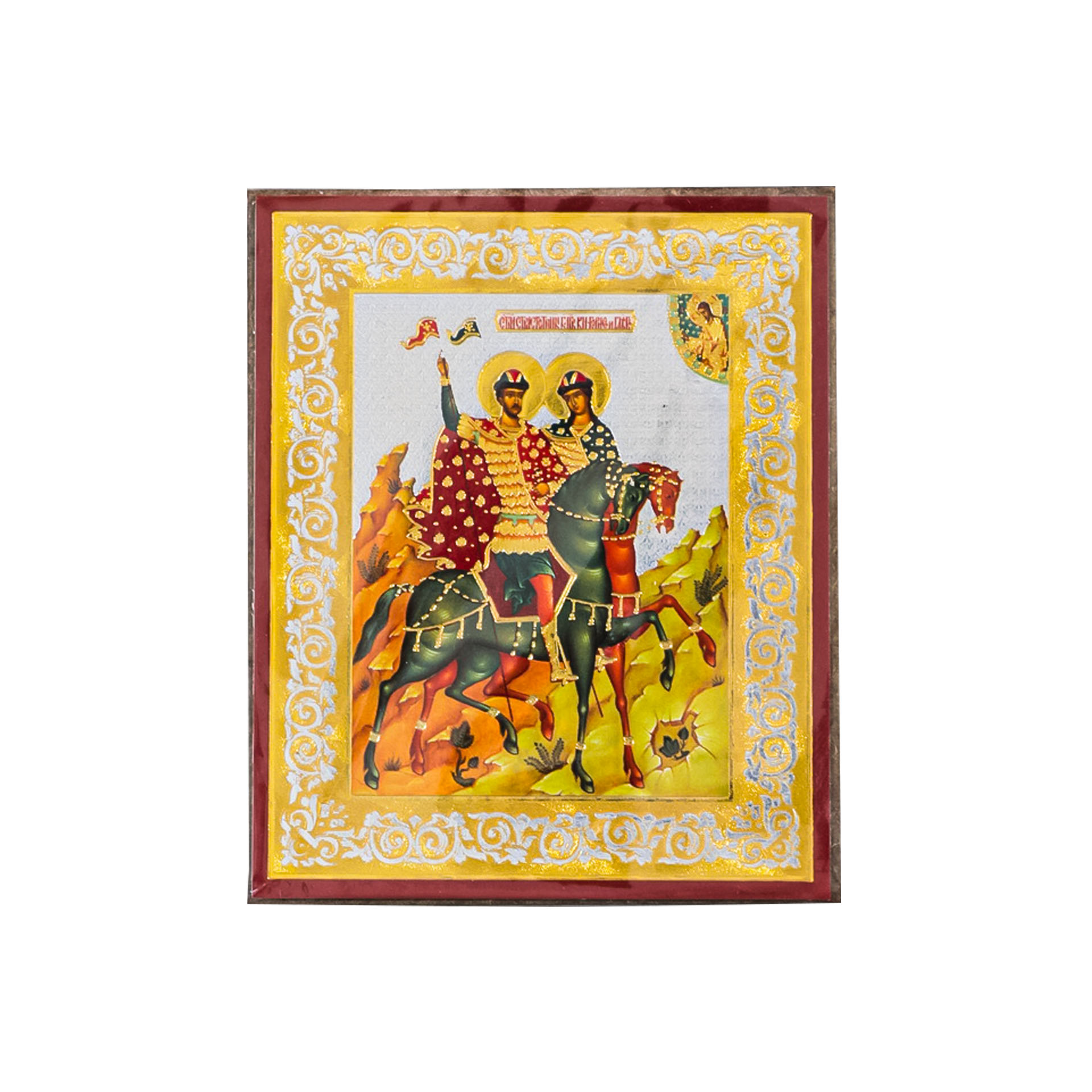 Икона на деревянном планшете 6х9 двойное тиснение, аннотация, упаковка Борис и Глеб