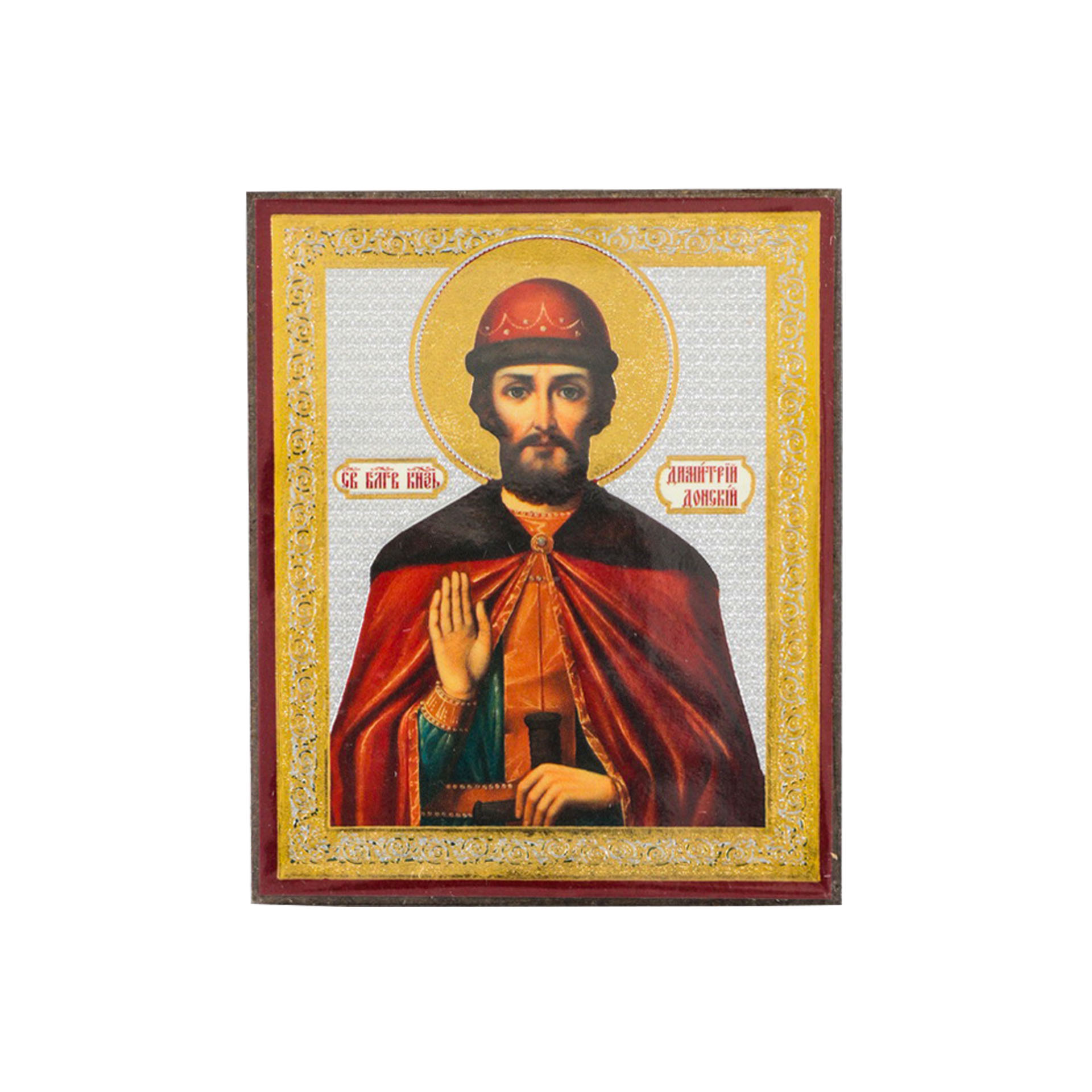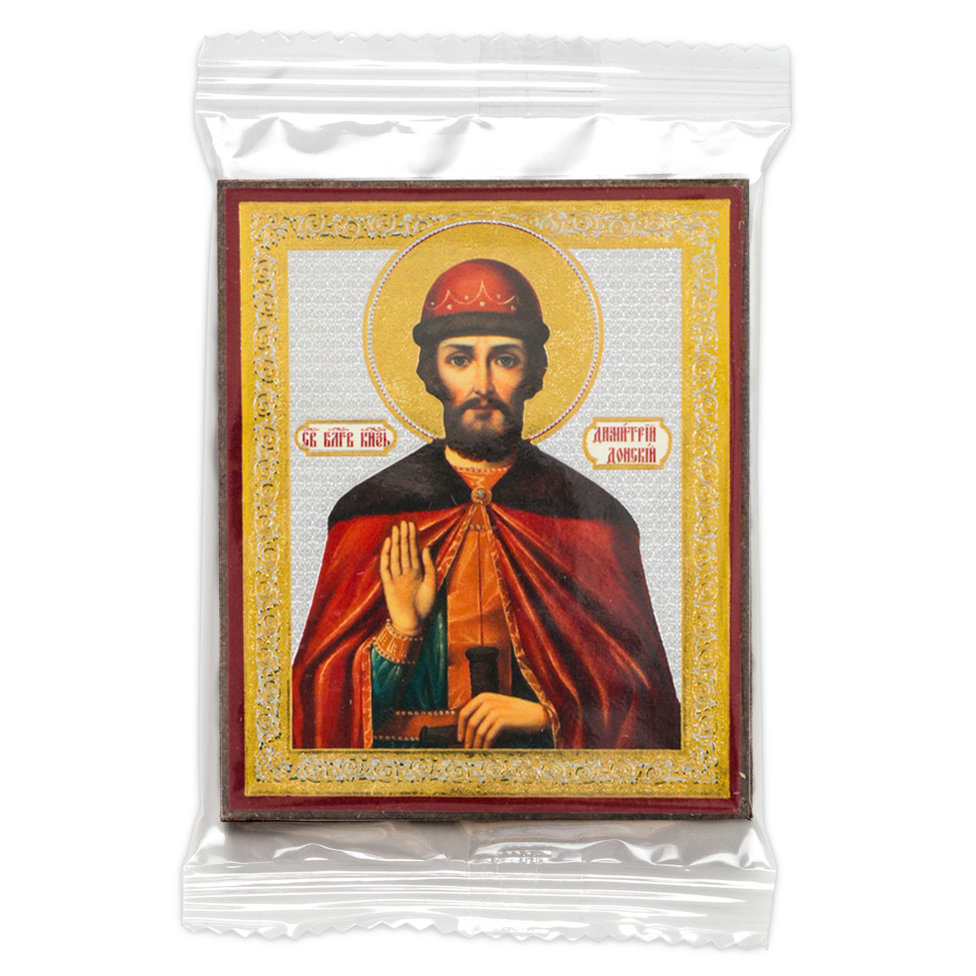 Икона на деревянном планшете 6х9 двойное тиснение, аннотация, упаковка Димитрий Донской 3