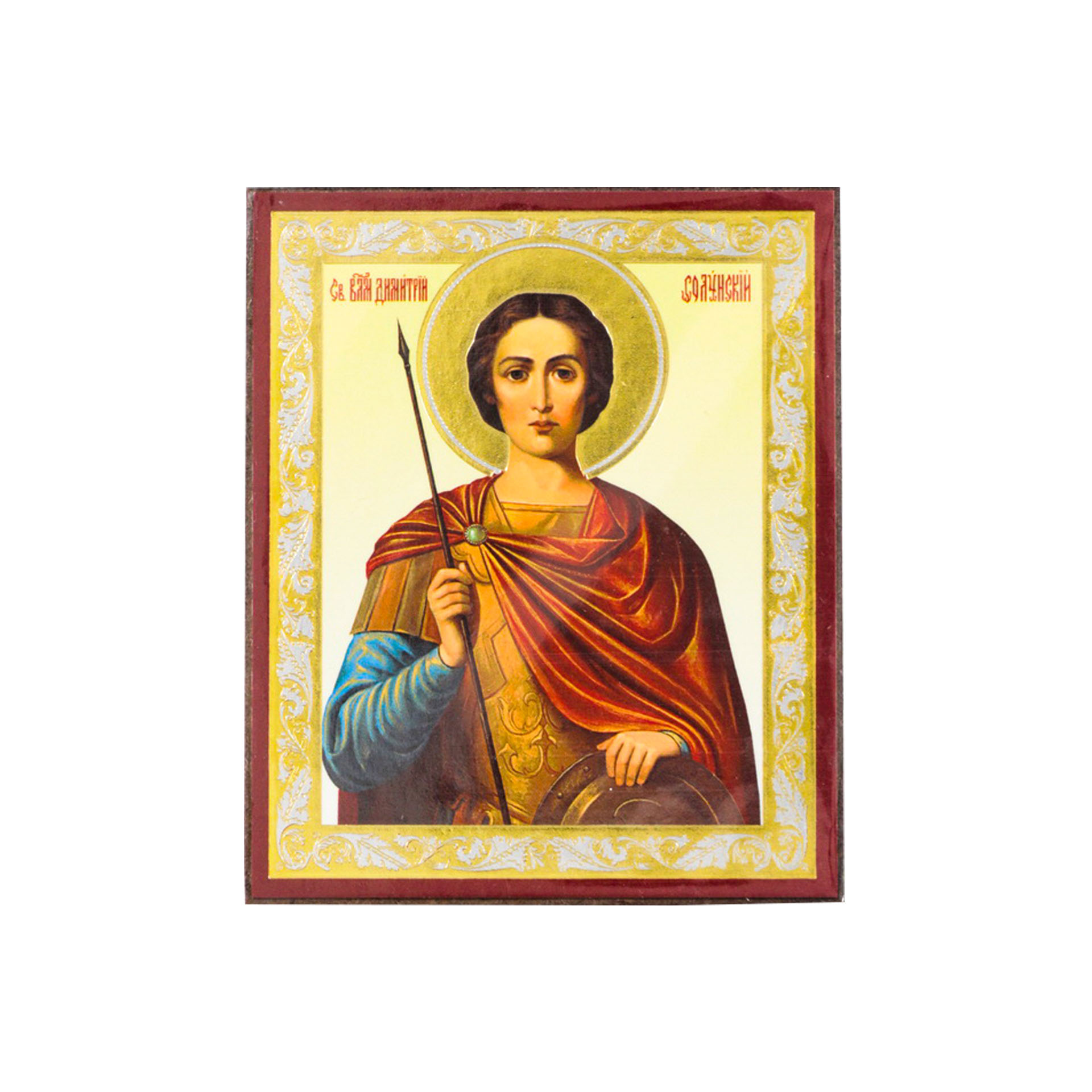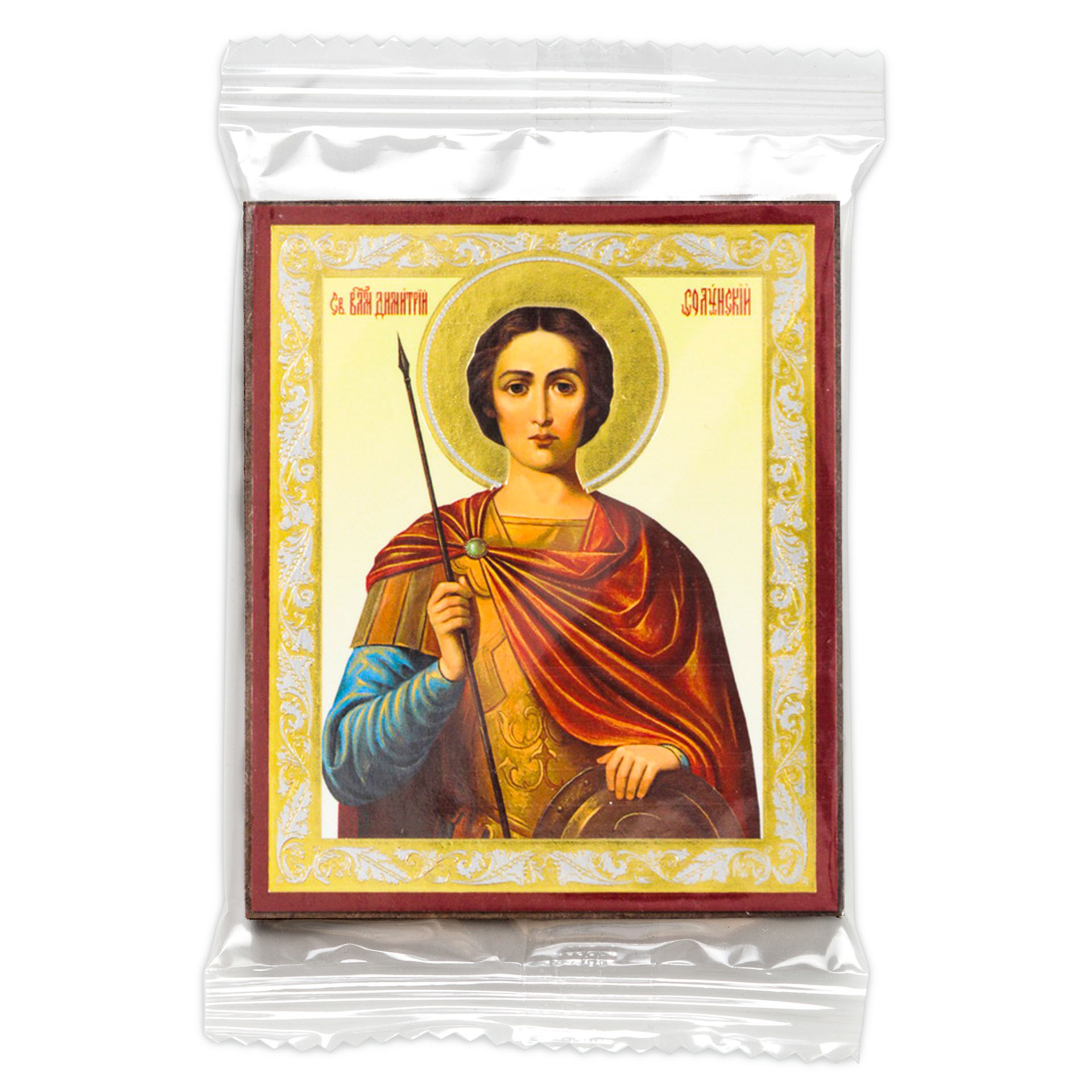 Икона на деревянном планшете 6х9 двойное тиснение, аннотация, упаковка Димитрий Солунский поясной 2
