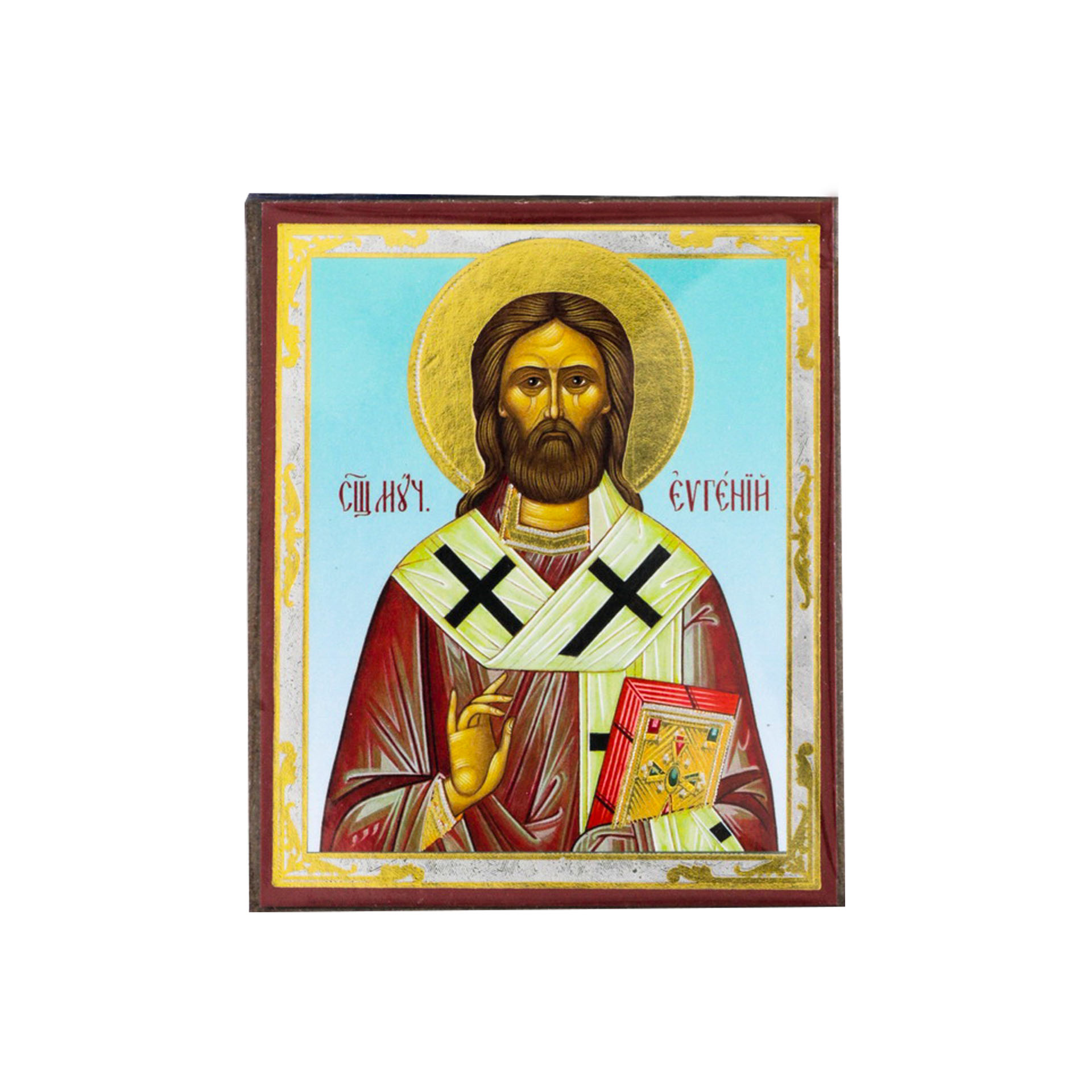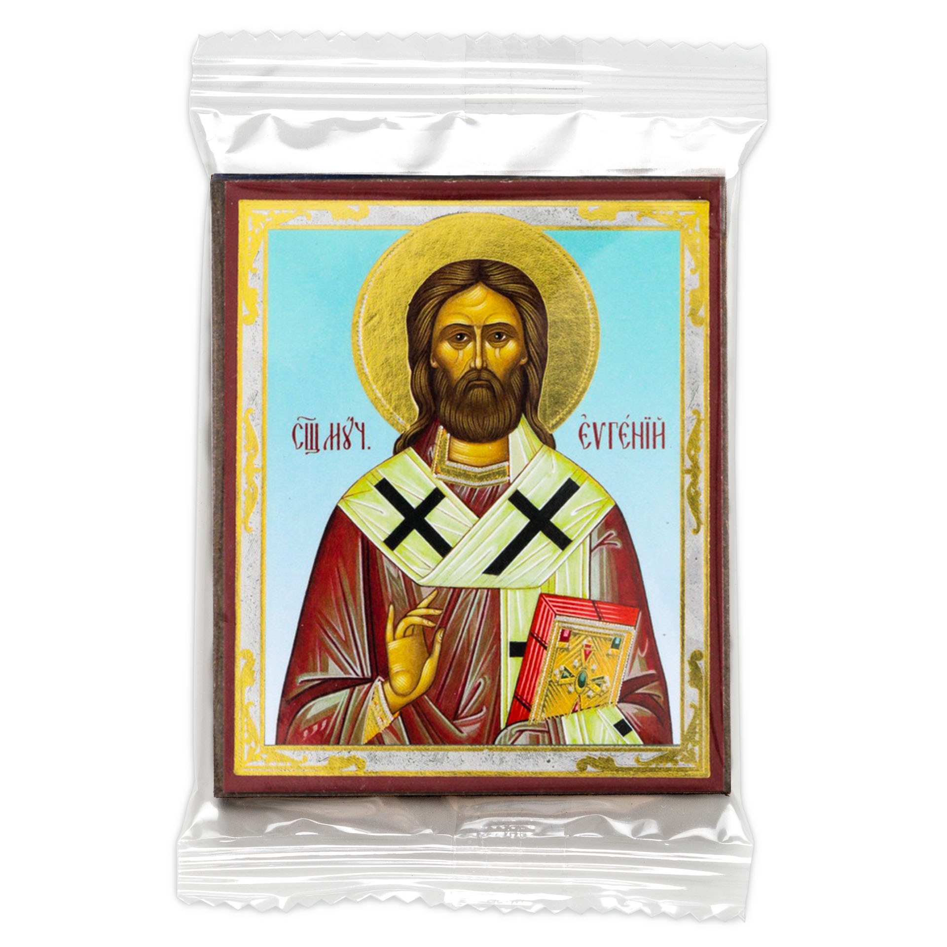 Икона на деревянном планшете 6х9 двойное тиснение, аннотация, упаковка Евгений 3