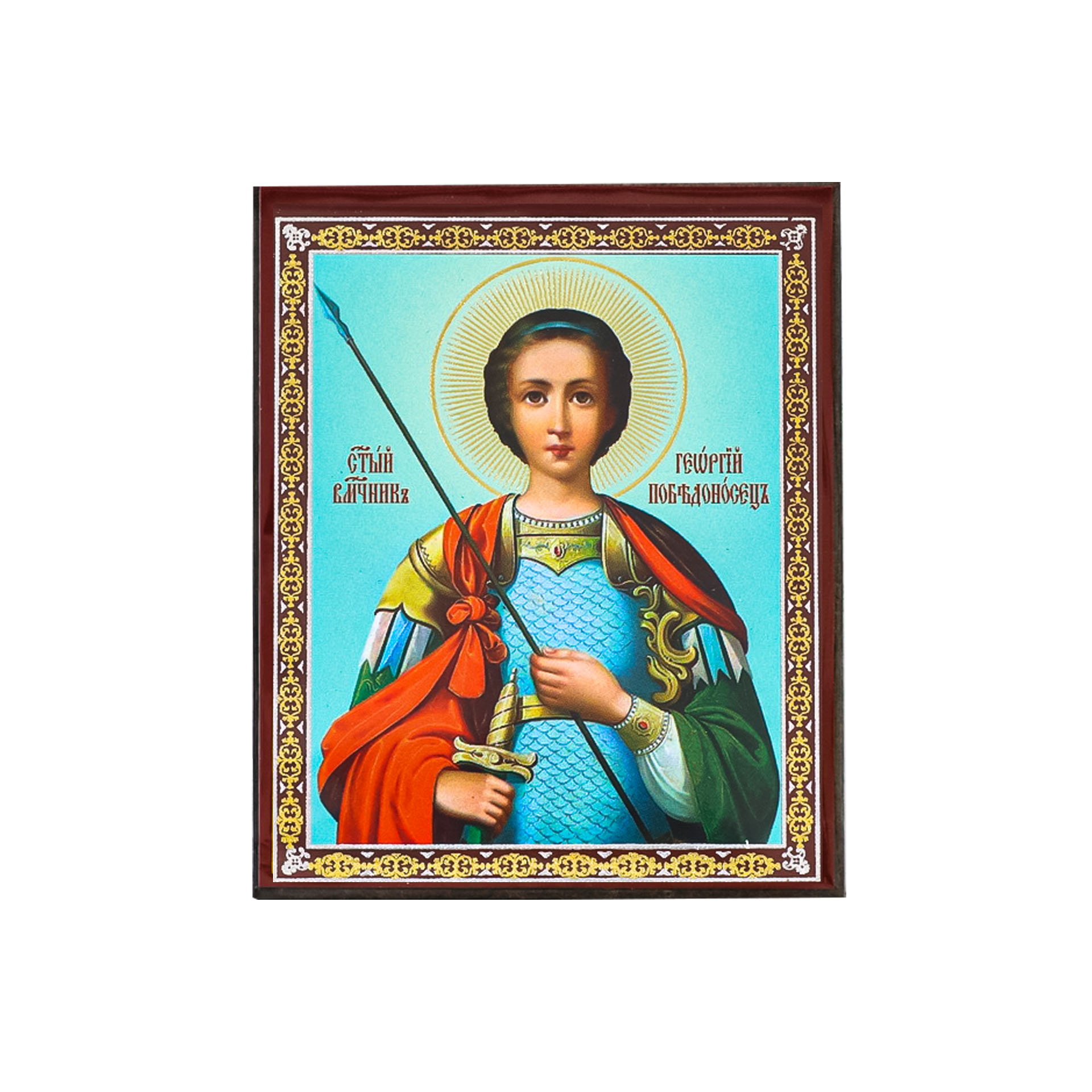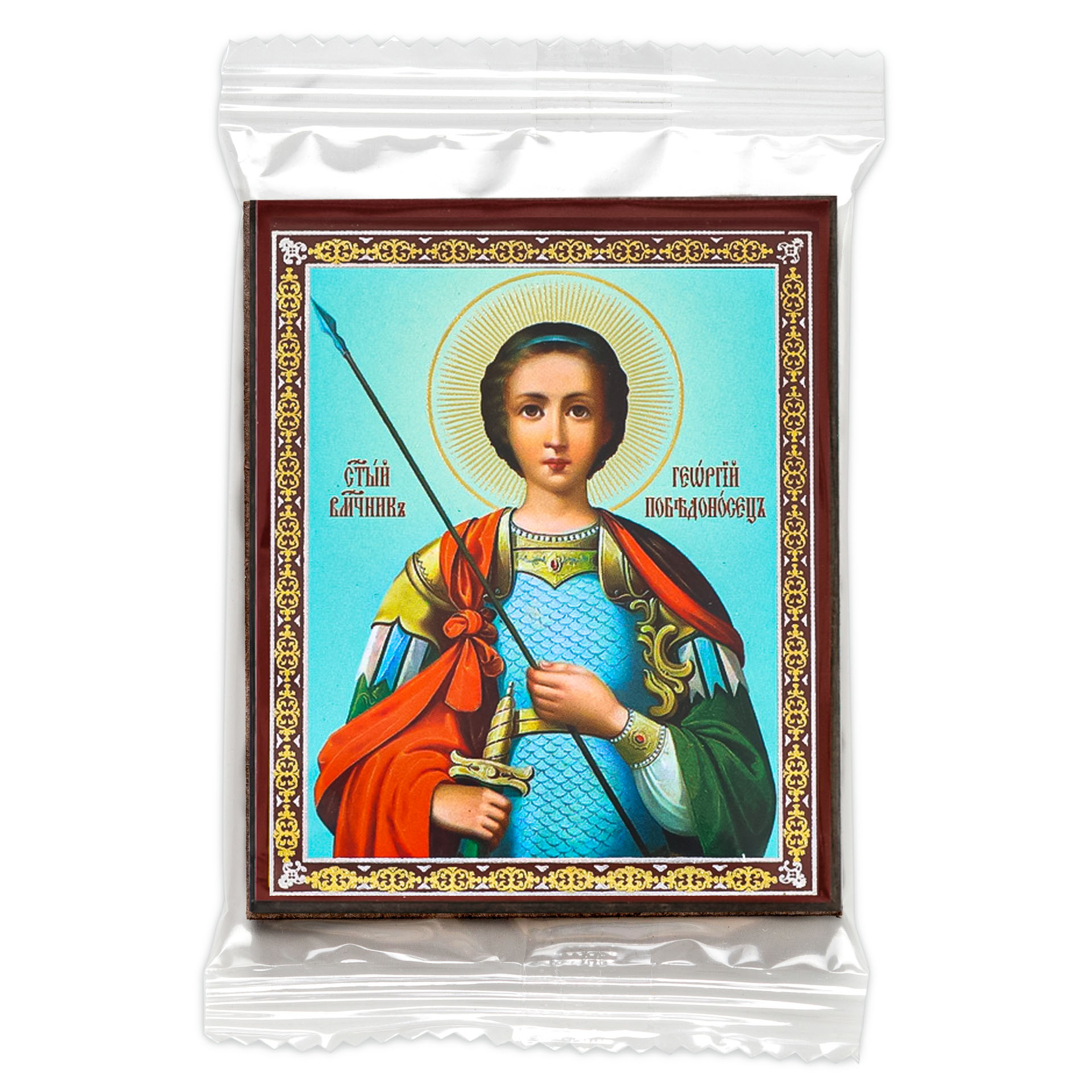 Икона на деревянном планшете 6х9 двойное тиснение, аннотация, упаковка Георгий Победоносец 3