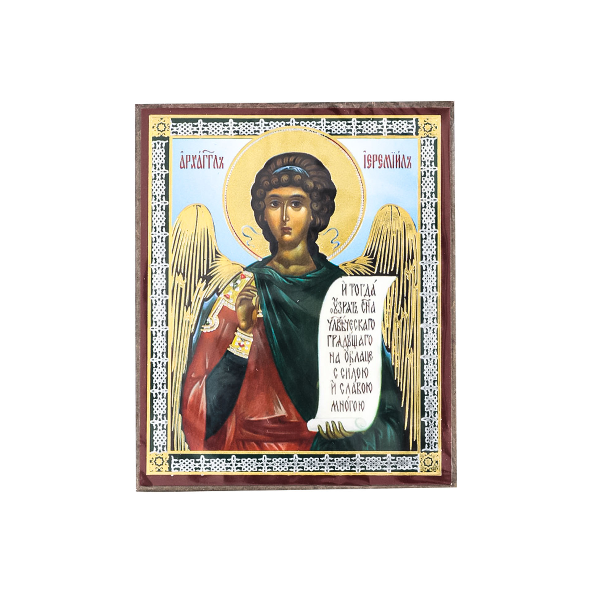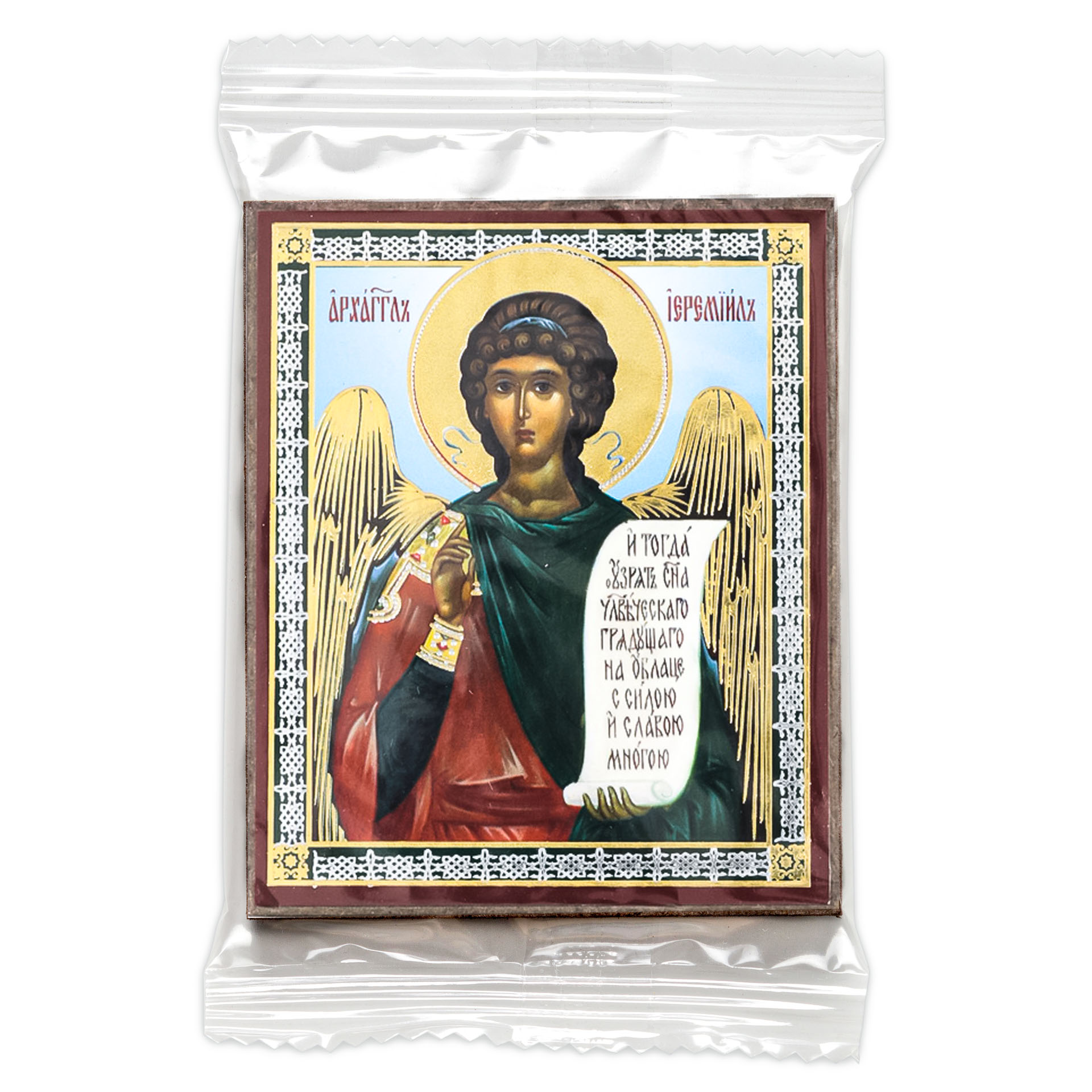 Икона на деревянном планшете 6х9 двойное тиснение, аннотация, упаковка Иеремиил Архангел