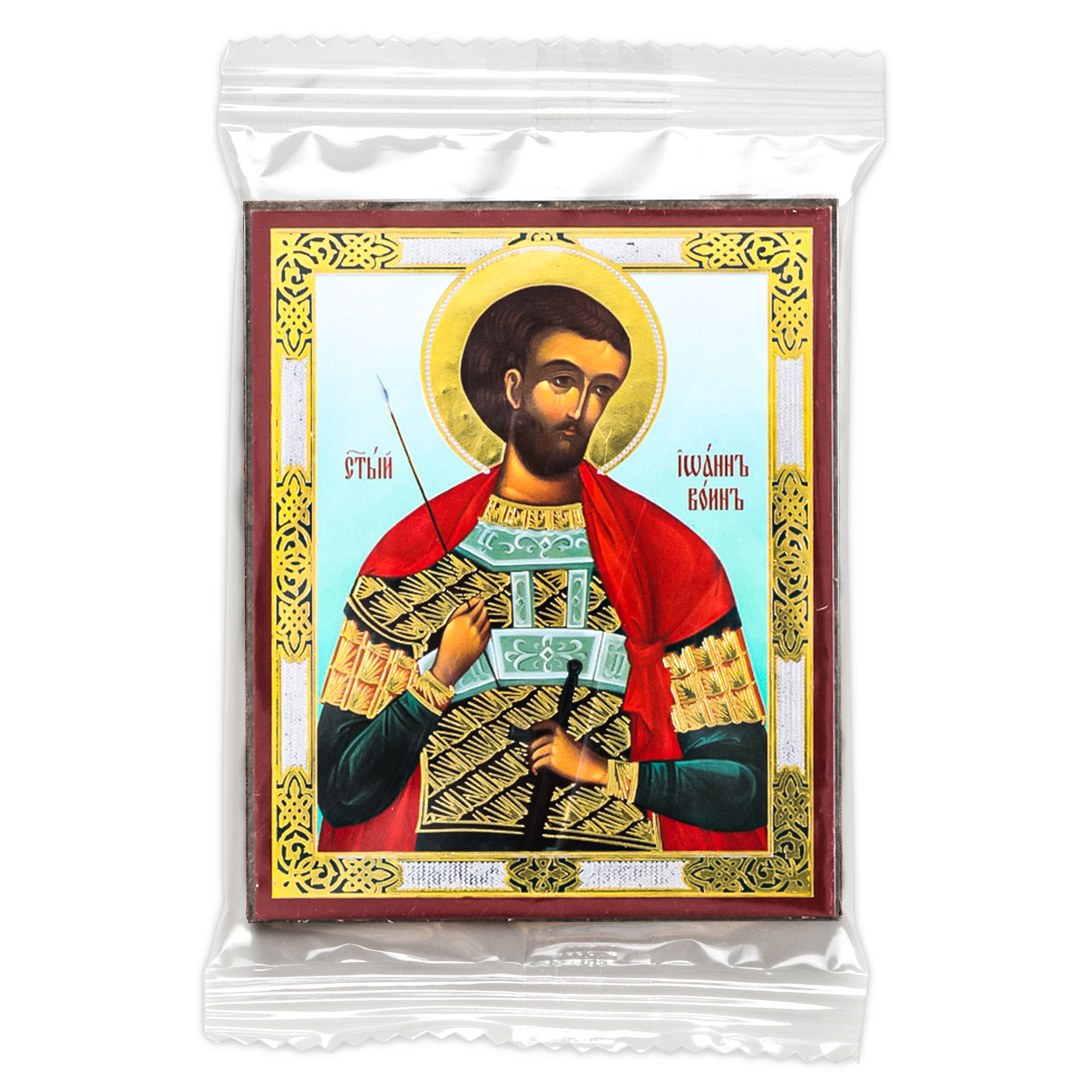 Икона на деревянном планшете 6х9 двойное тиснение, аннотация, упаковка Иоанн Воин 2