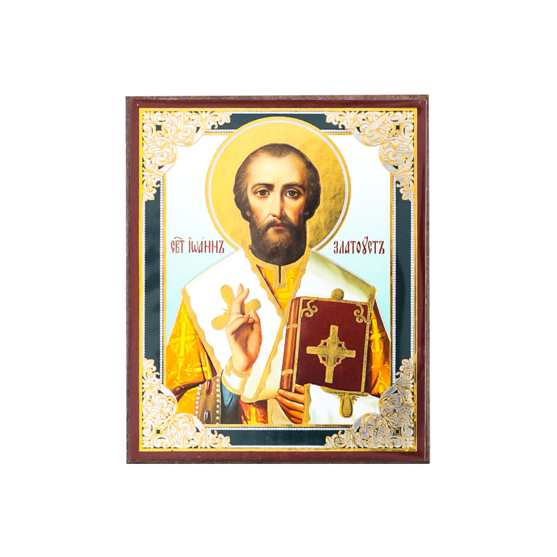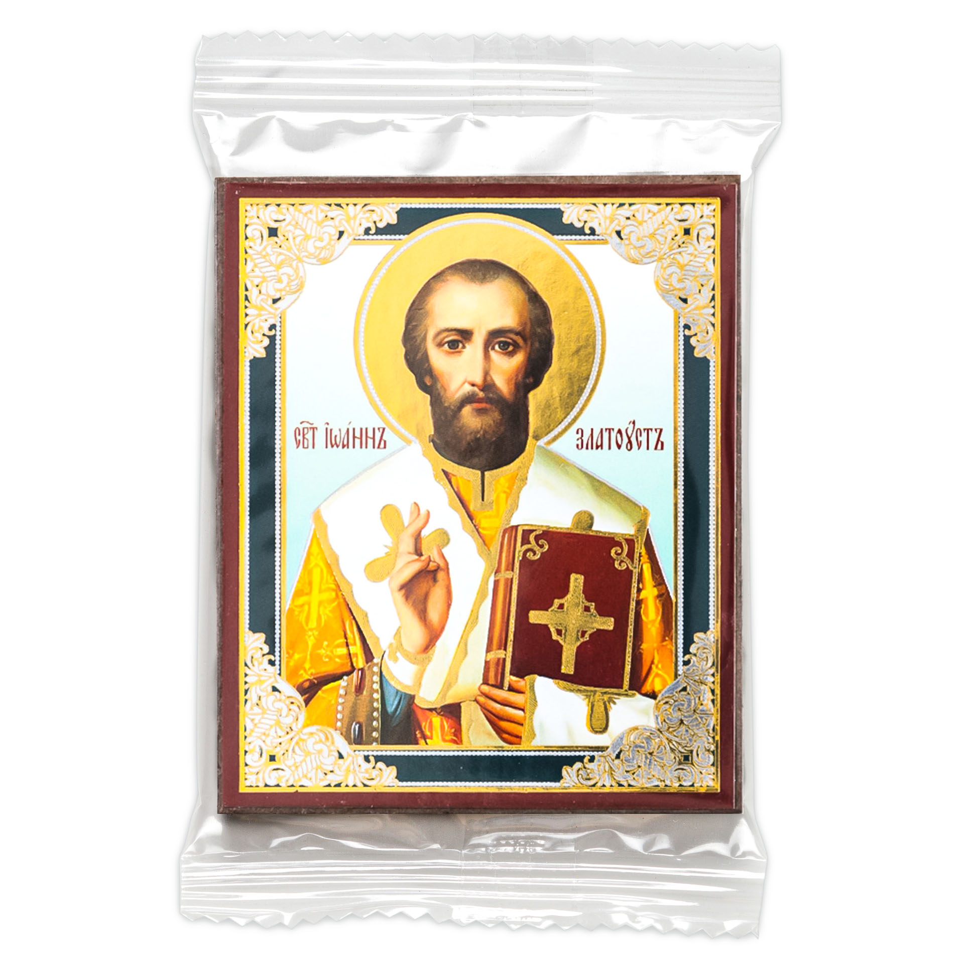 Икона на деревянном планшете 6х9 двойное тиснение, аннотация, упаковка Иоанн Златоуст 2