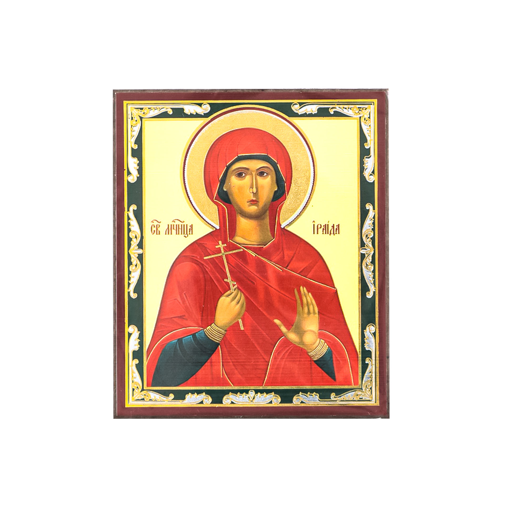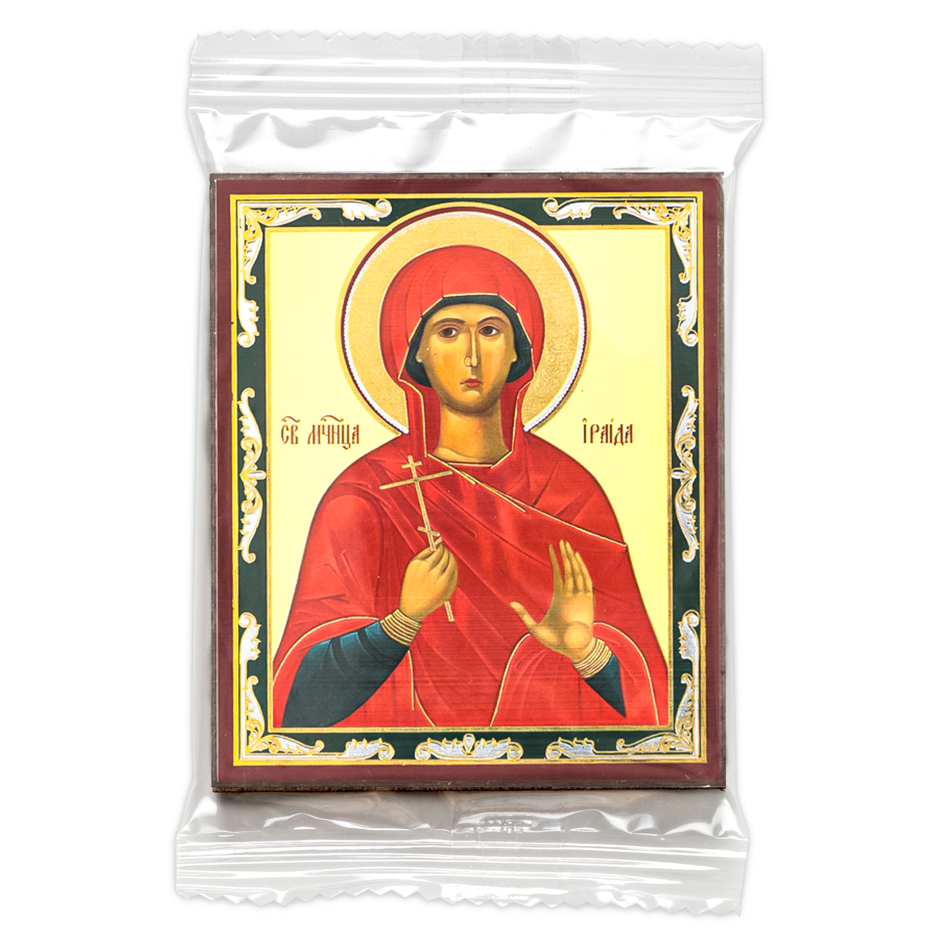 Икона на деревянном планшете 6х9 двойное тиснение, аннотация, упаковка Ираида