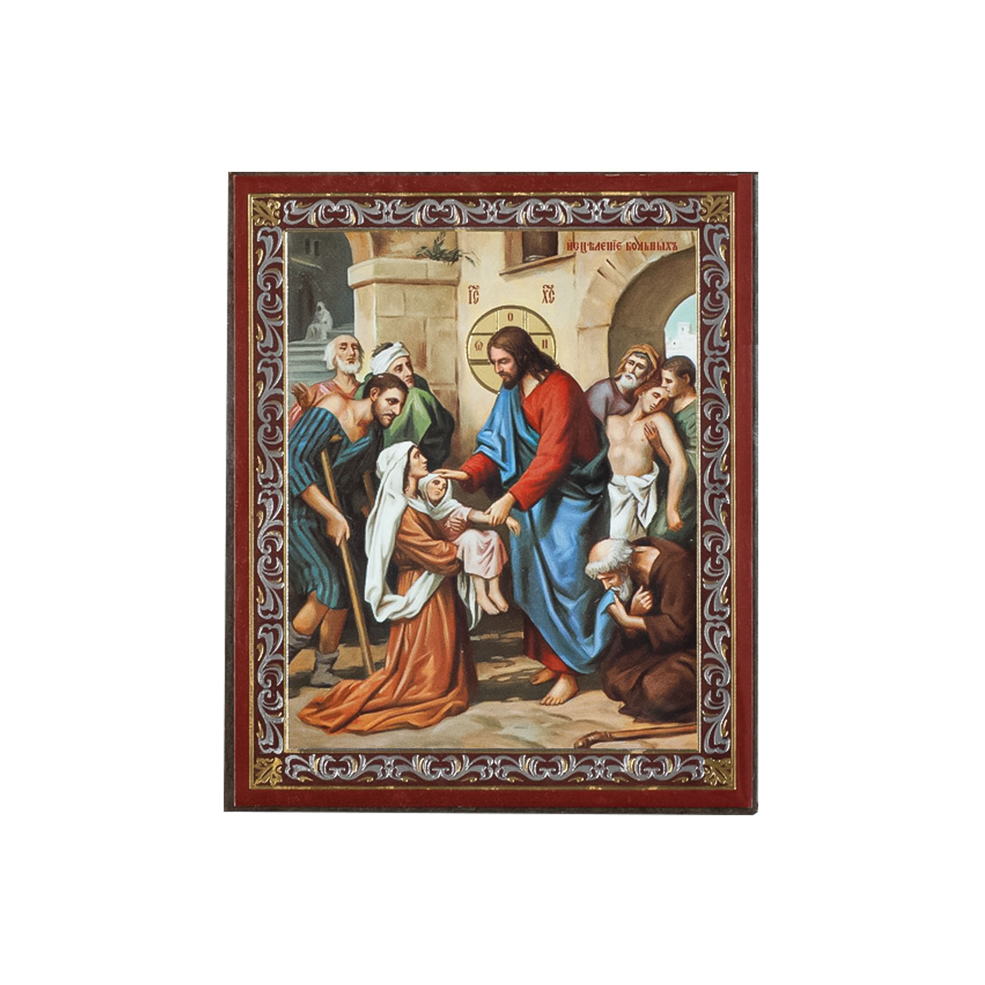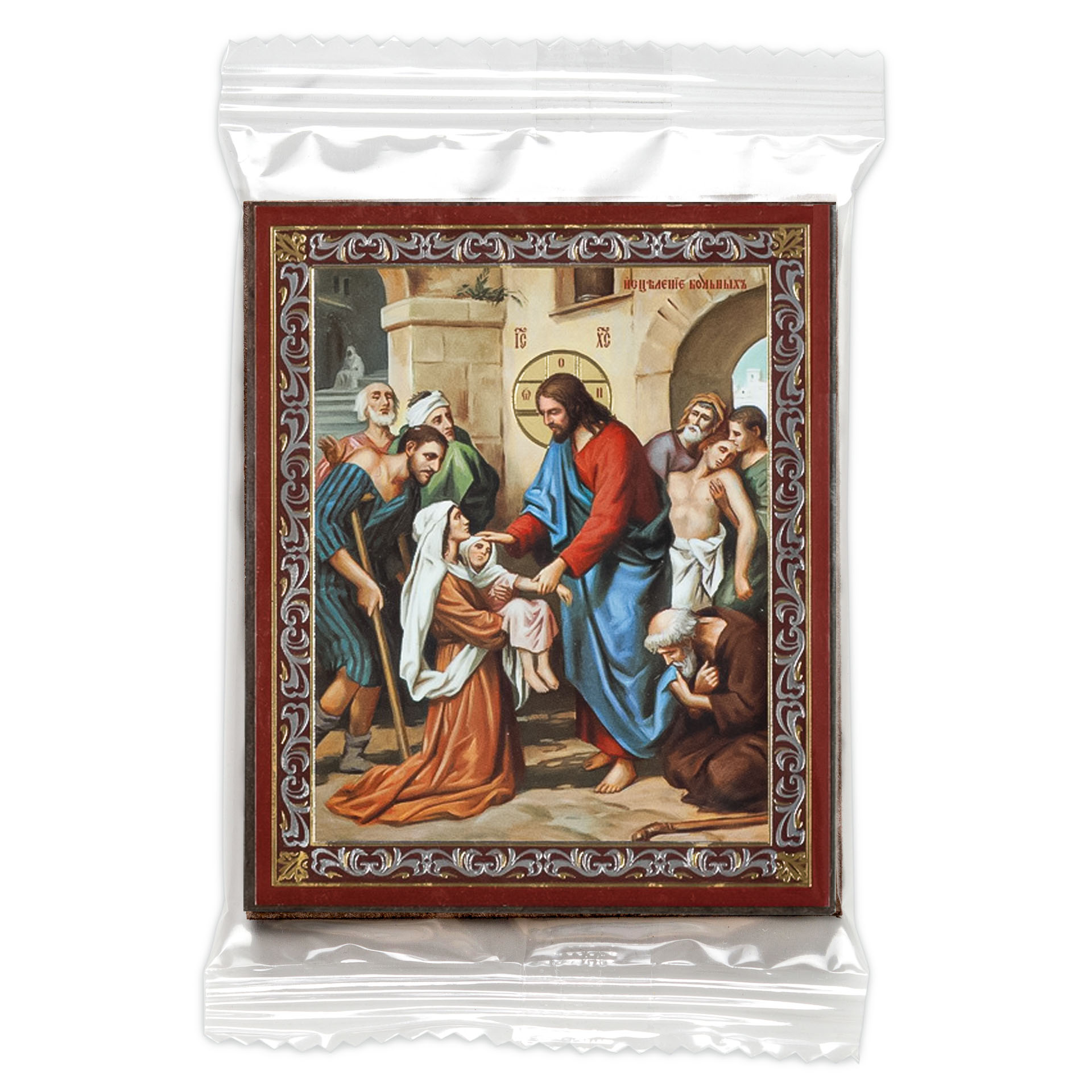 Икона на деревянном планшете 6х9 двойное тиснение, аннотация, упаковка Исцеление больных