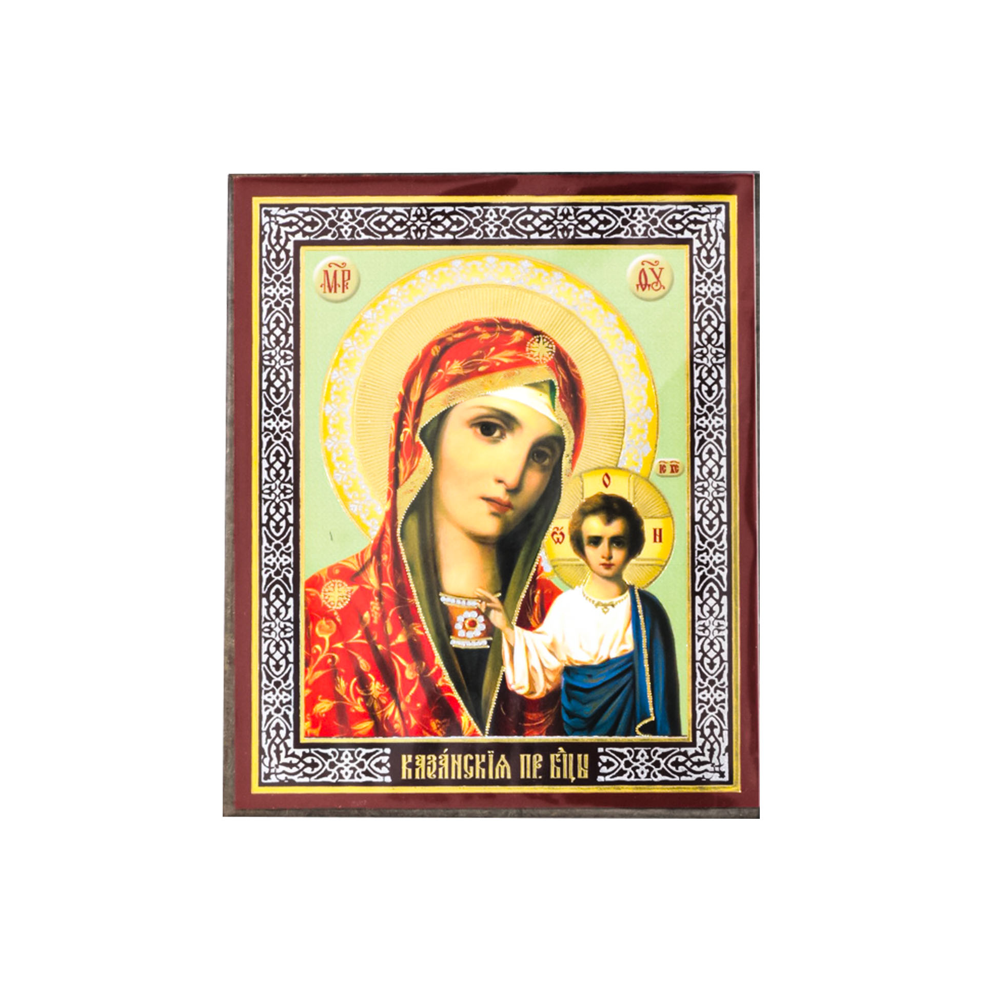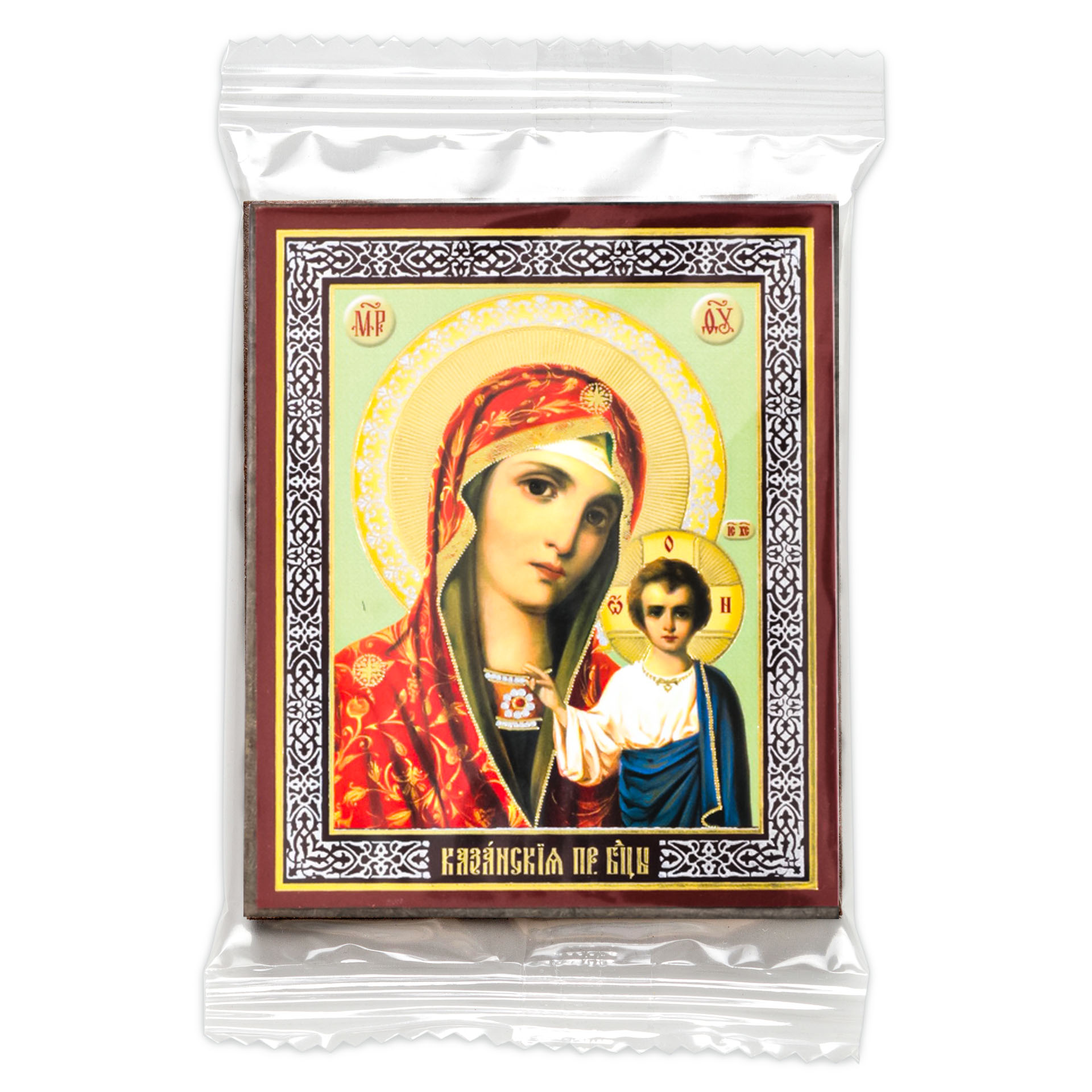 Икона на деревянном планшете 6х9 двойное тиснение, аннотация, упаковка Казанская БМ 31