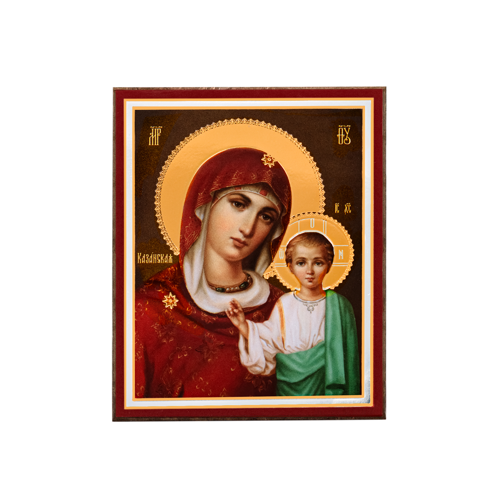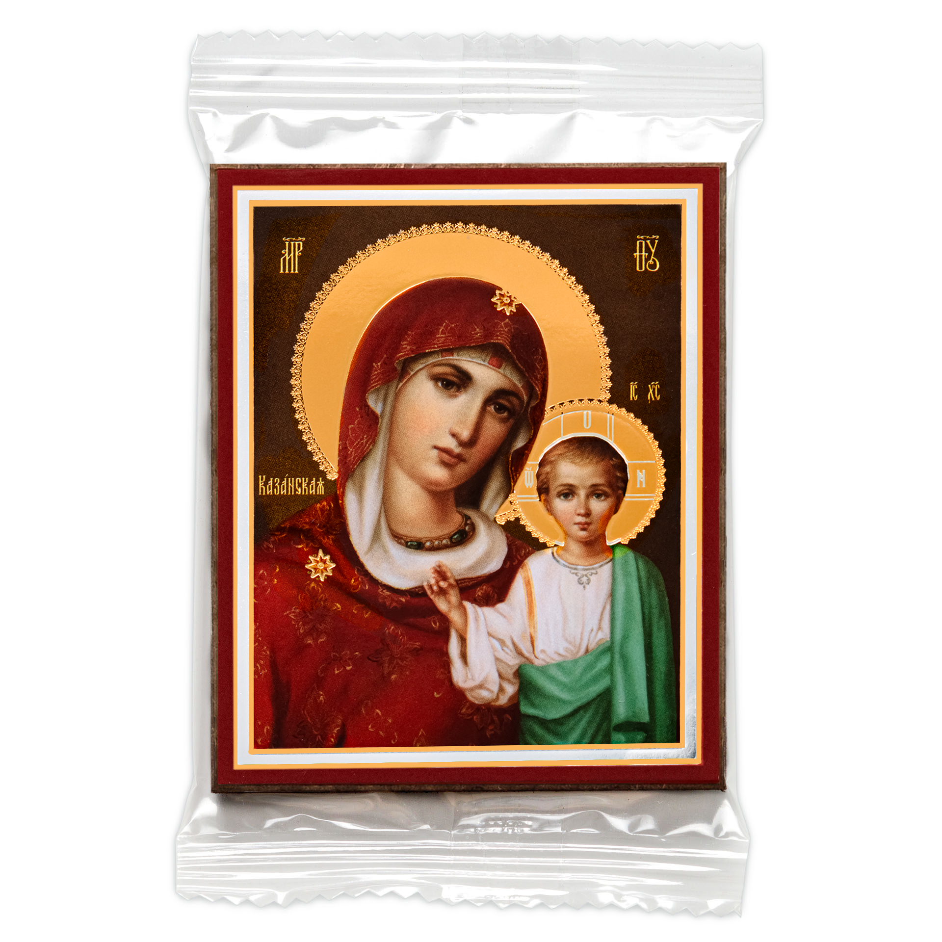 Икона на деревянном планшете 6х9 двойное тиснение, аннотация, упаковка Казанская БМ 38