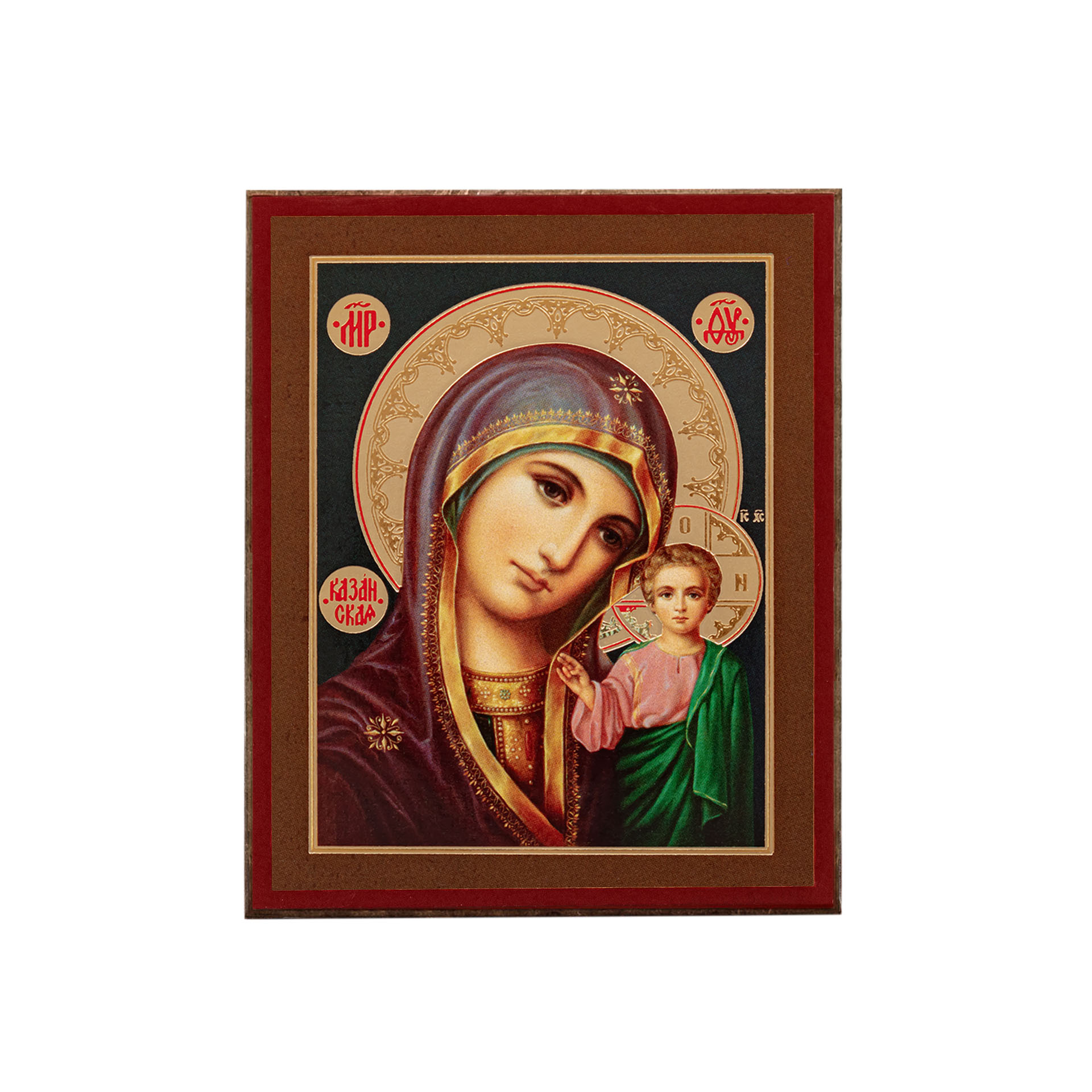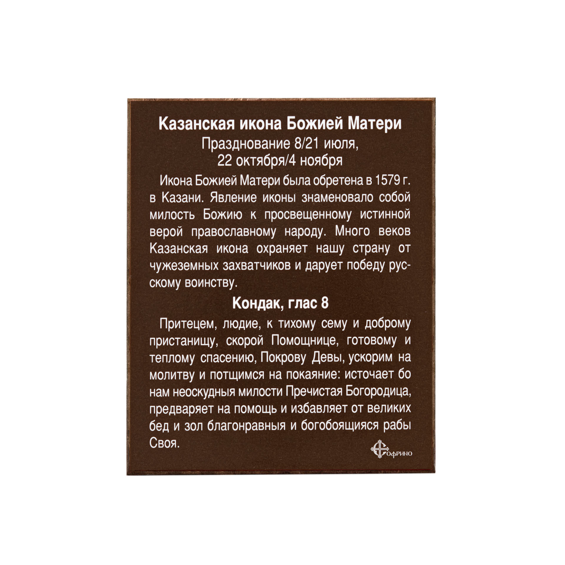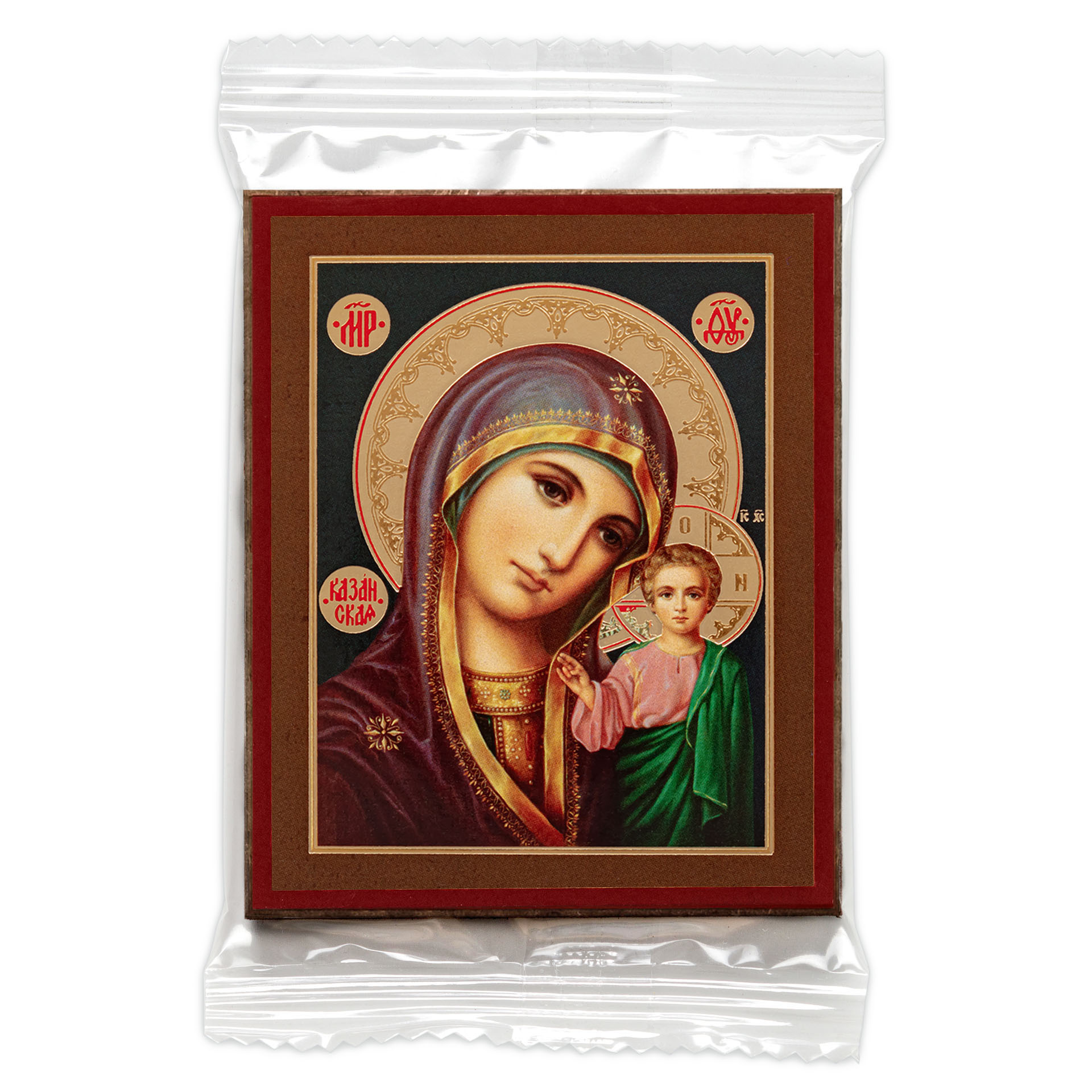 Икона на деревянном планшете 6х9 двойное тиснение, аннотация, упаковка Казанская БМ 39