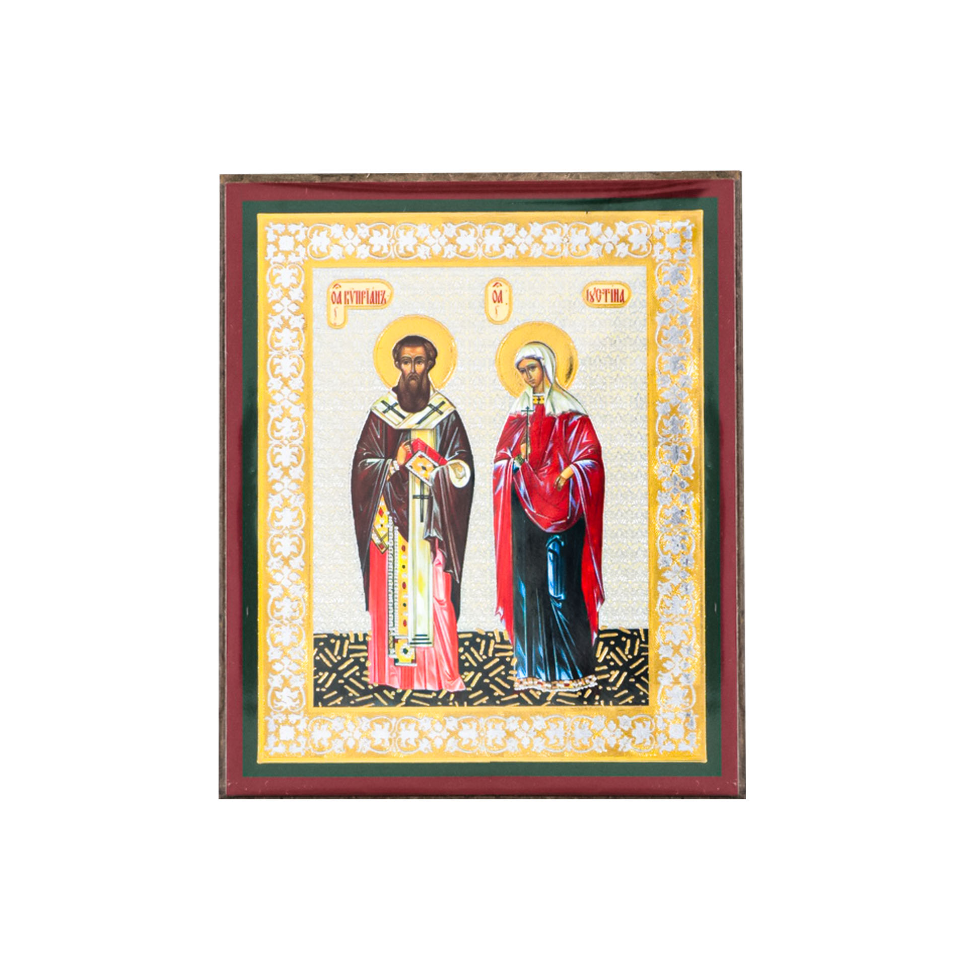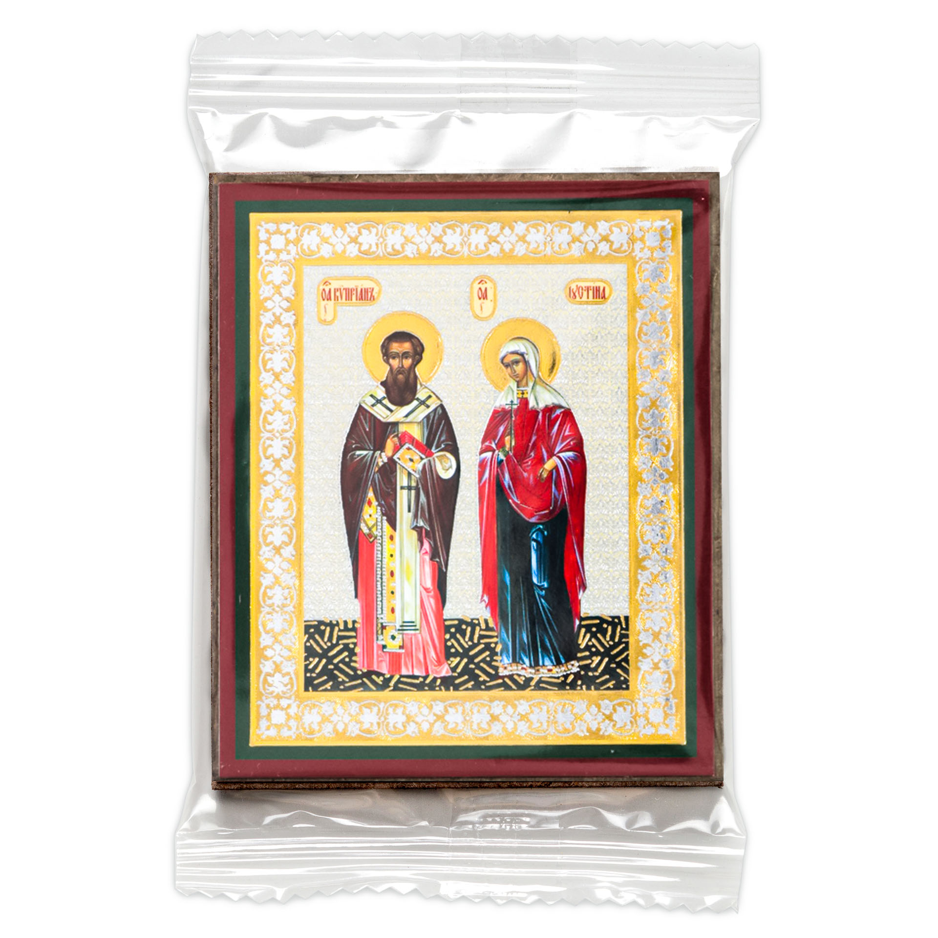 Икона на деревянном планшете 6х9 двойное тиснение, аннотация, упаковка Киприан и Иустина