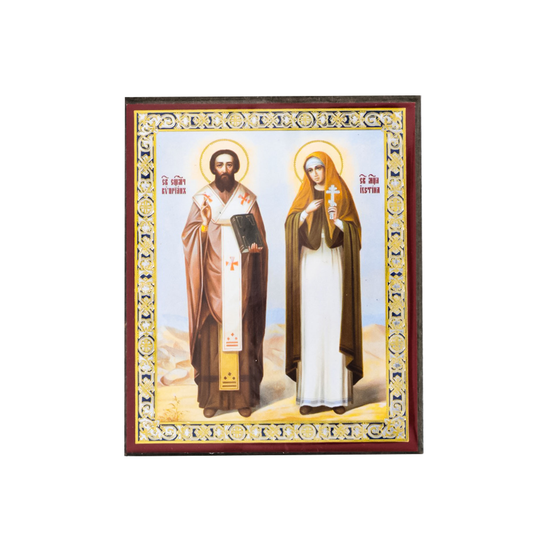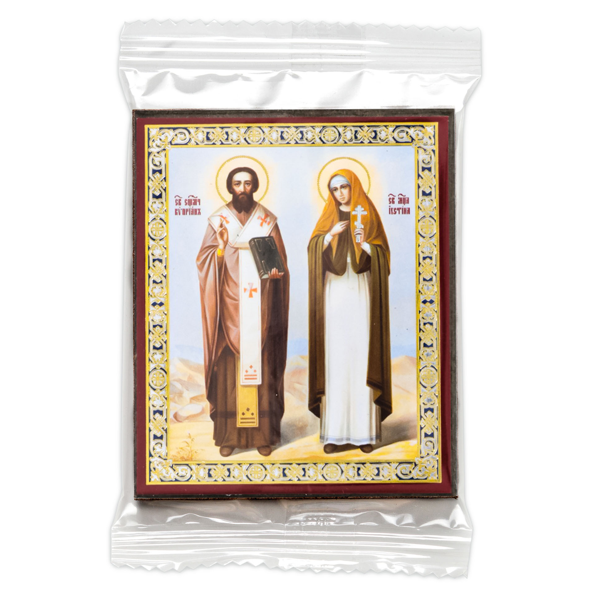 Икона на деревянном планшете 6х9 двойное тиснение, аннотация, упаковка Киприан и Иустина 3