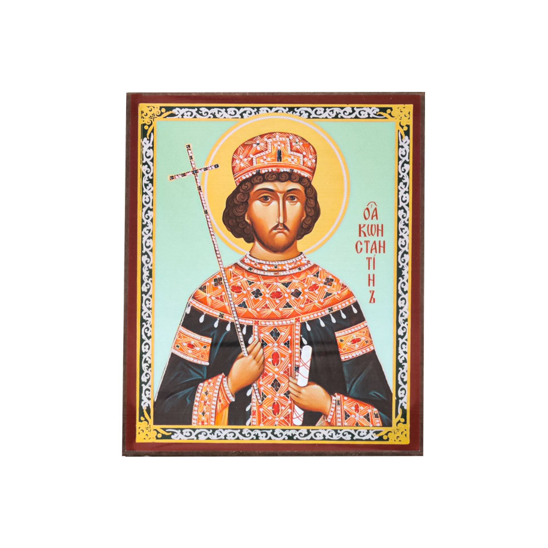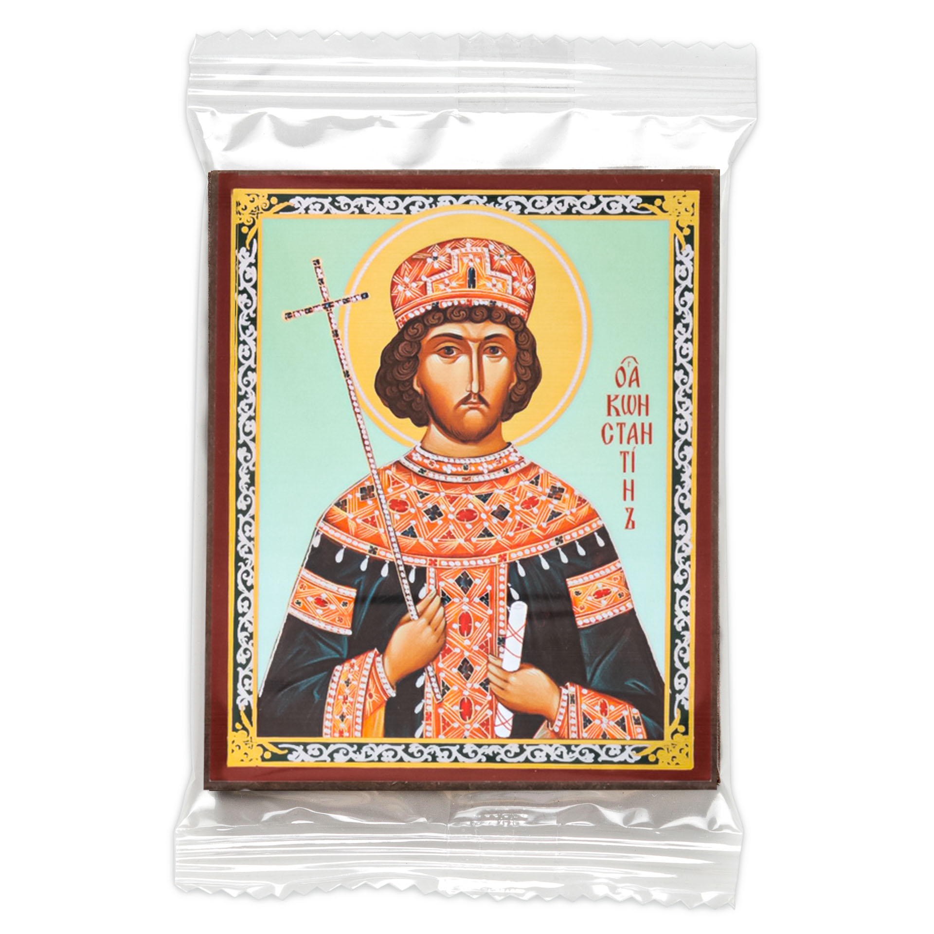 Икона на деревянном планшете 6х9 двойное тиснение, аннотация, упаковка Константин