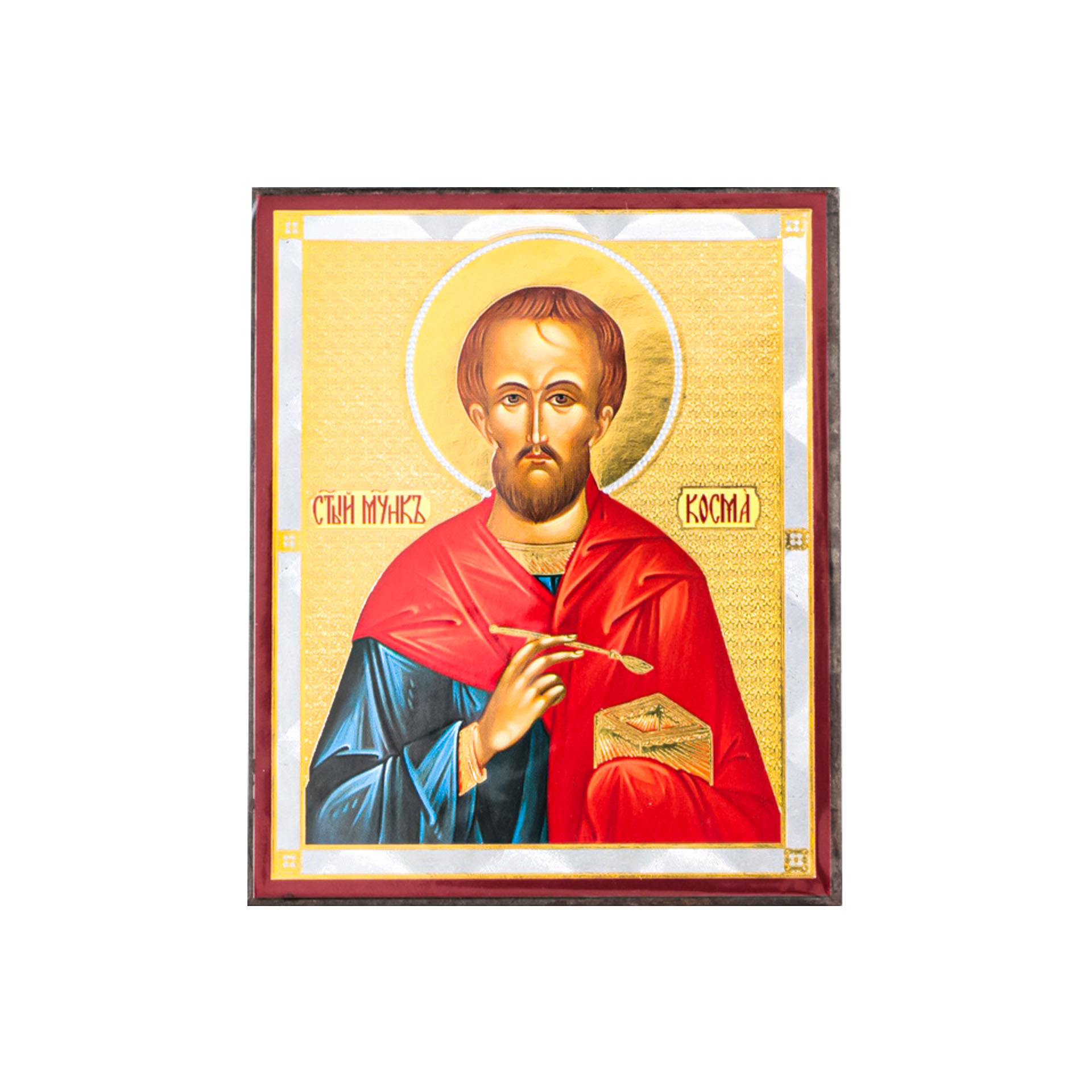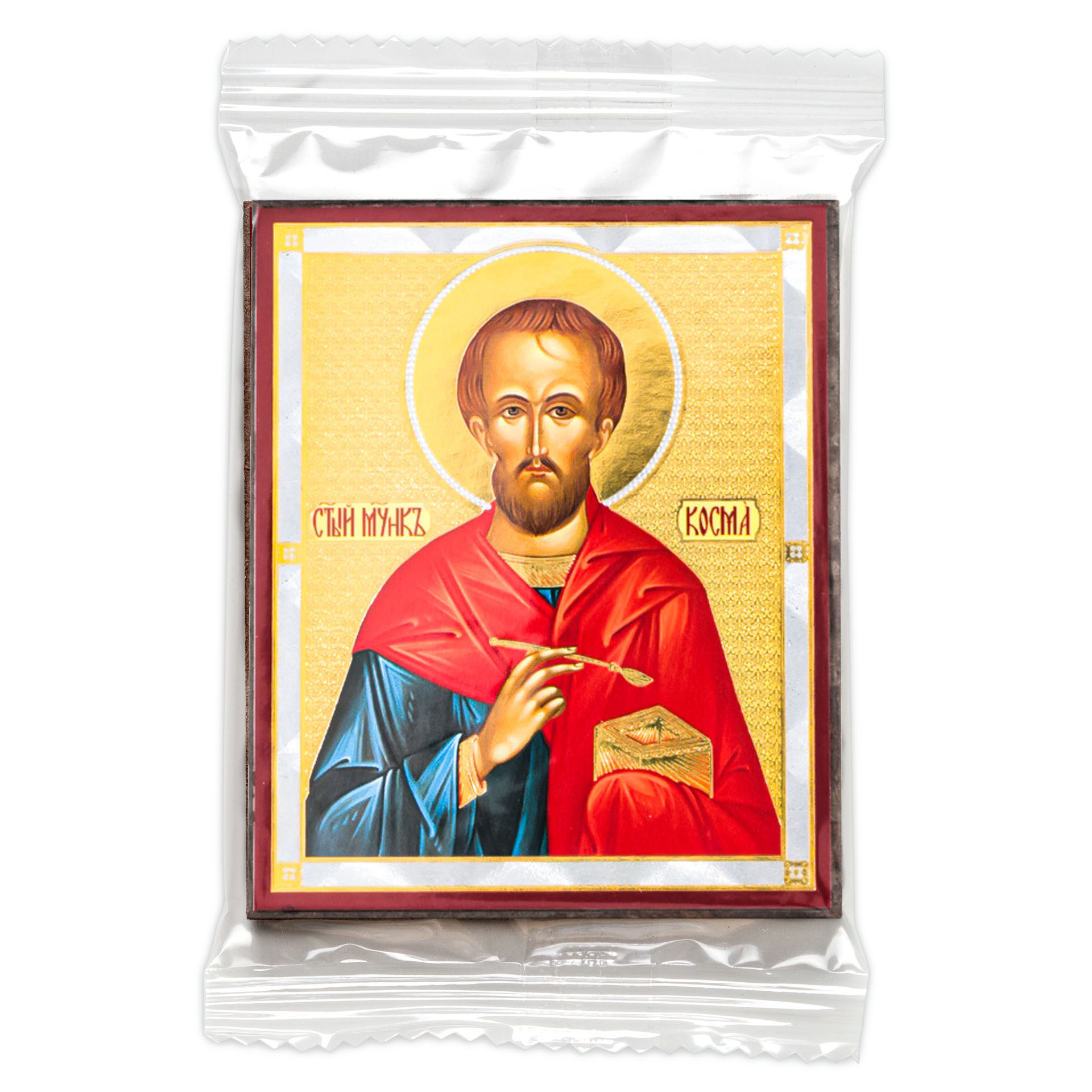 Икона на деревянном планшете 6х9 двойное тиснение, аннотация, упаковка Косма
