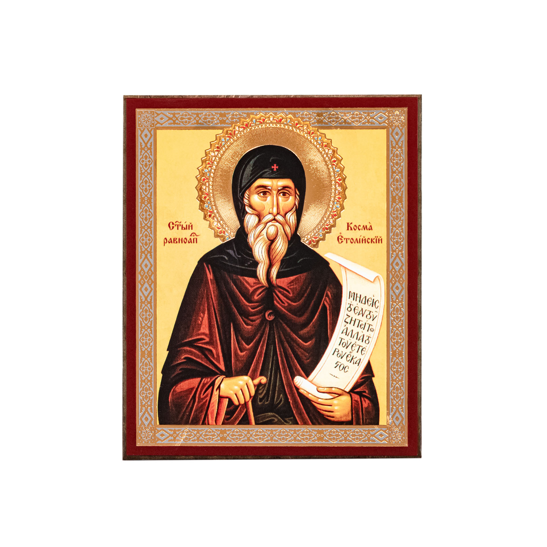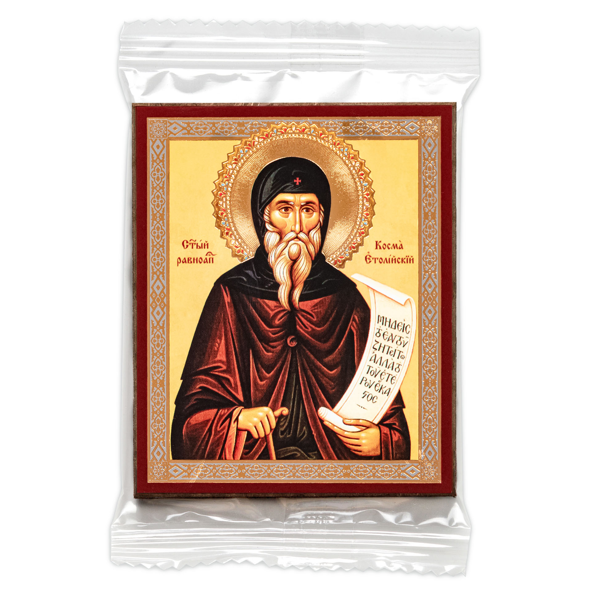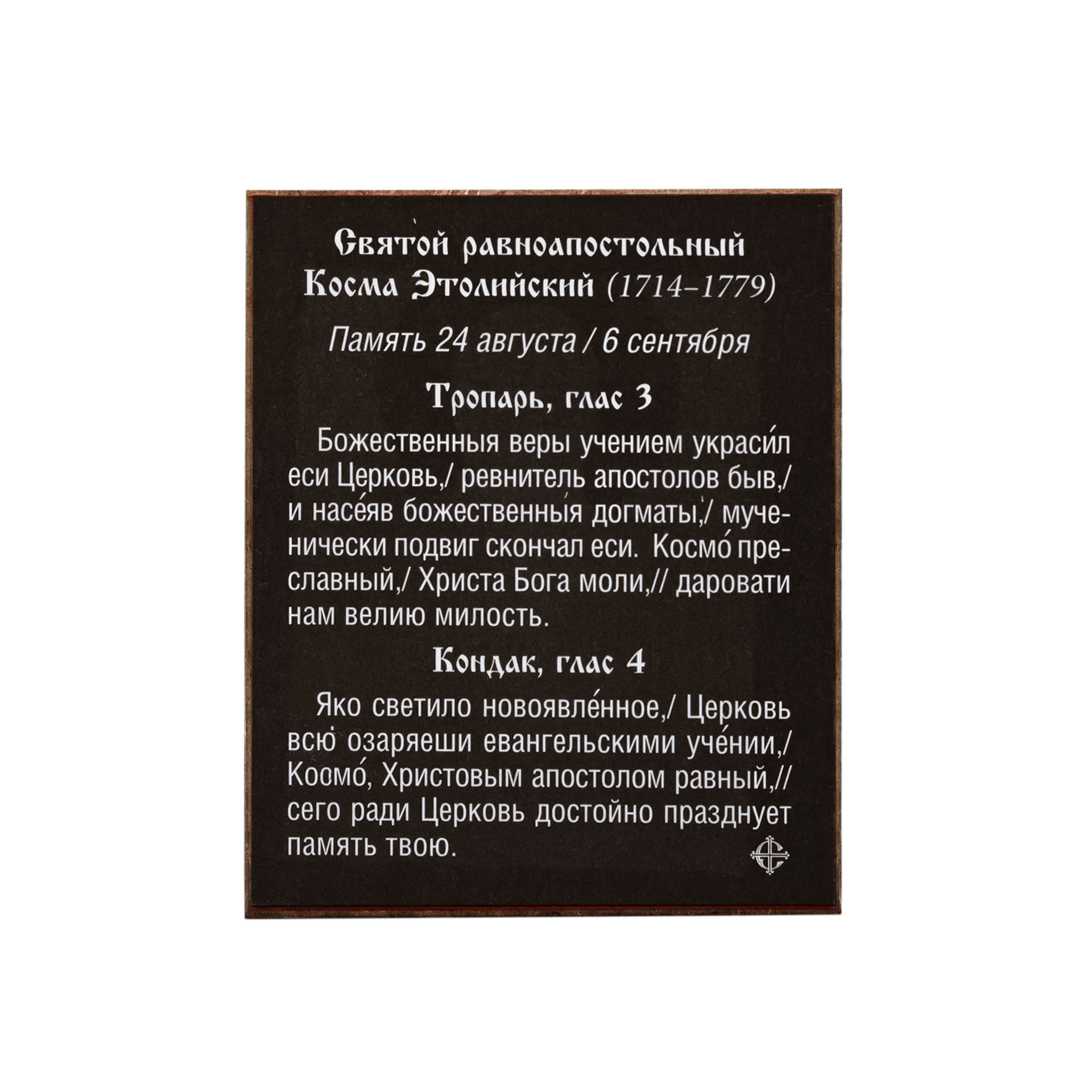 Икона на деревянном планшете 6х9 двойное тиснение, аннотация, упаковка Косма Этолийский