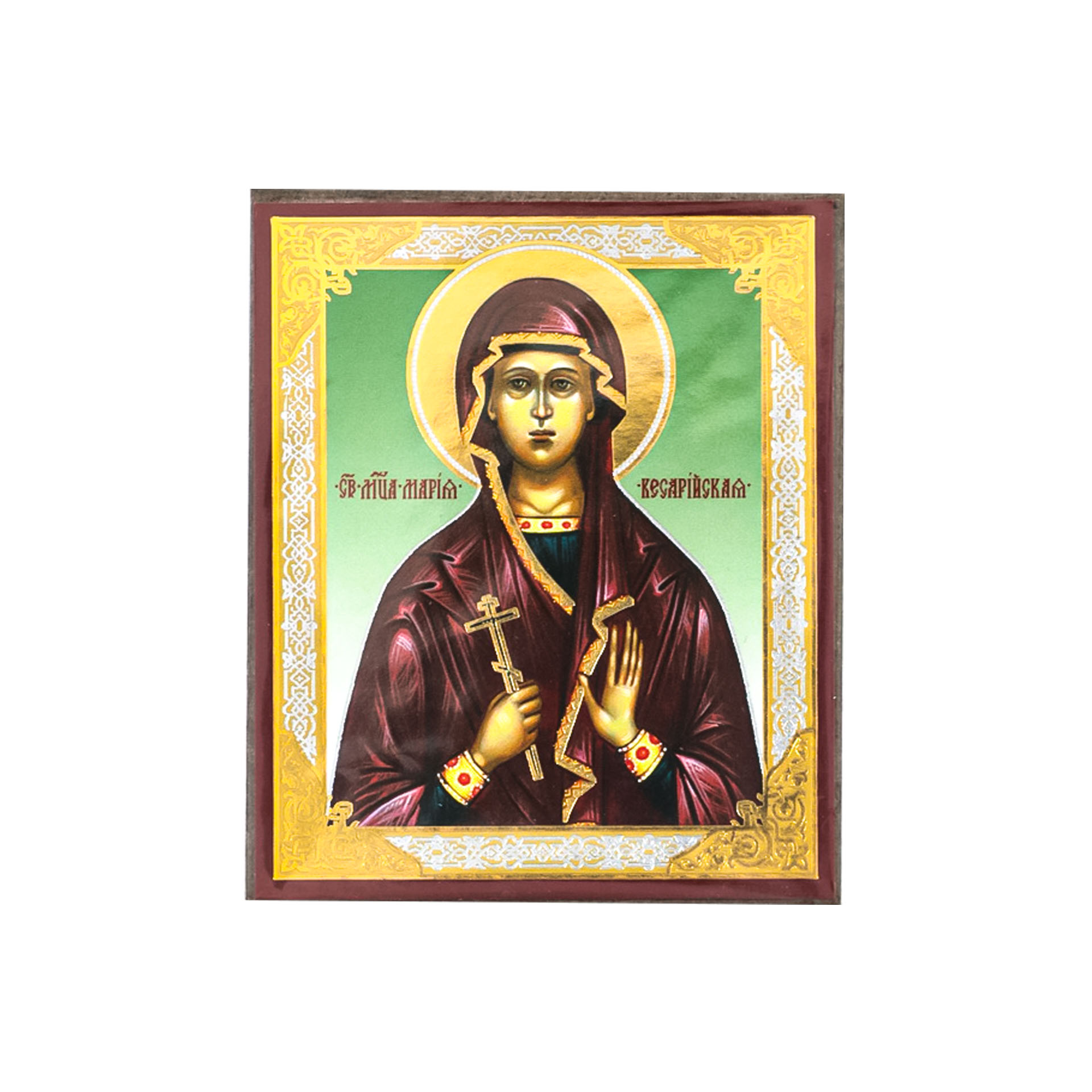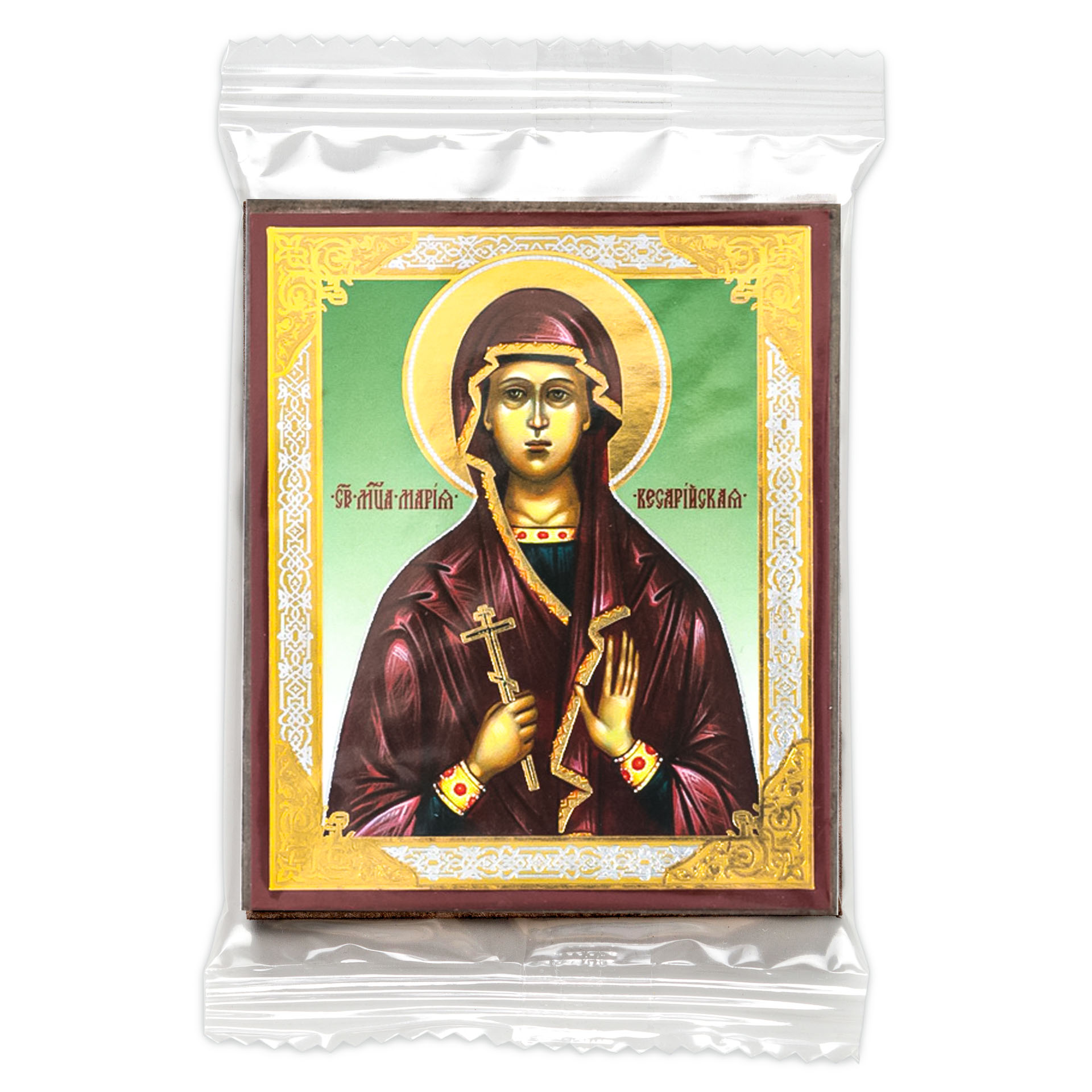Икона на деревянном планшете 6х9 двойное тиснение, аннотация, упаковка Мария Кесарийская, мц. (2)