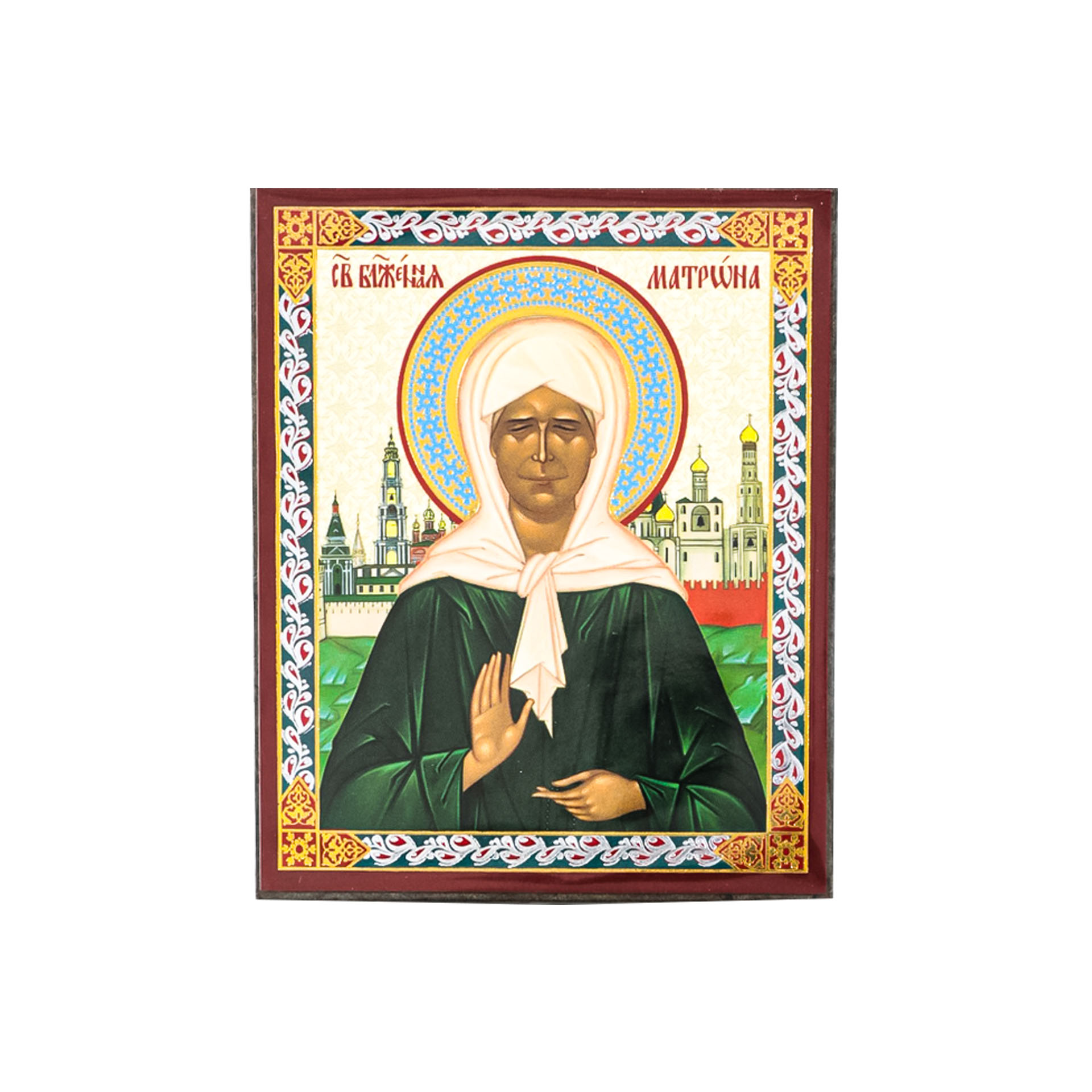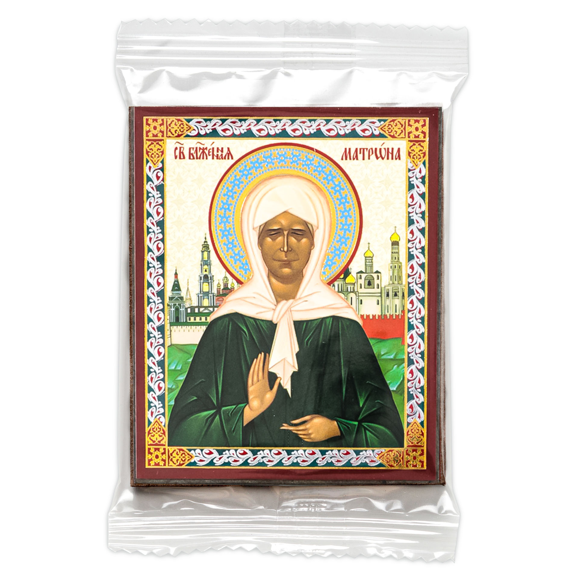 Икона на деревянном планшете 6х9 двойное тиснение, аннотация, упаковка Матрона Московская (6)