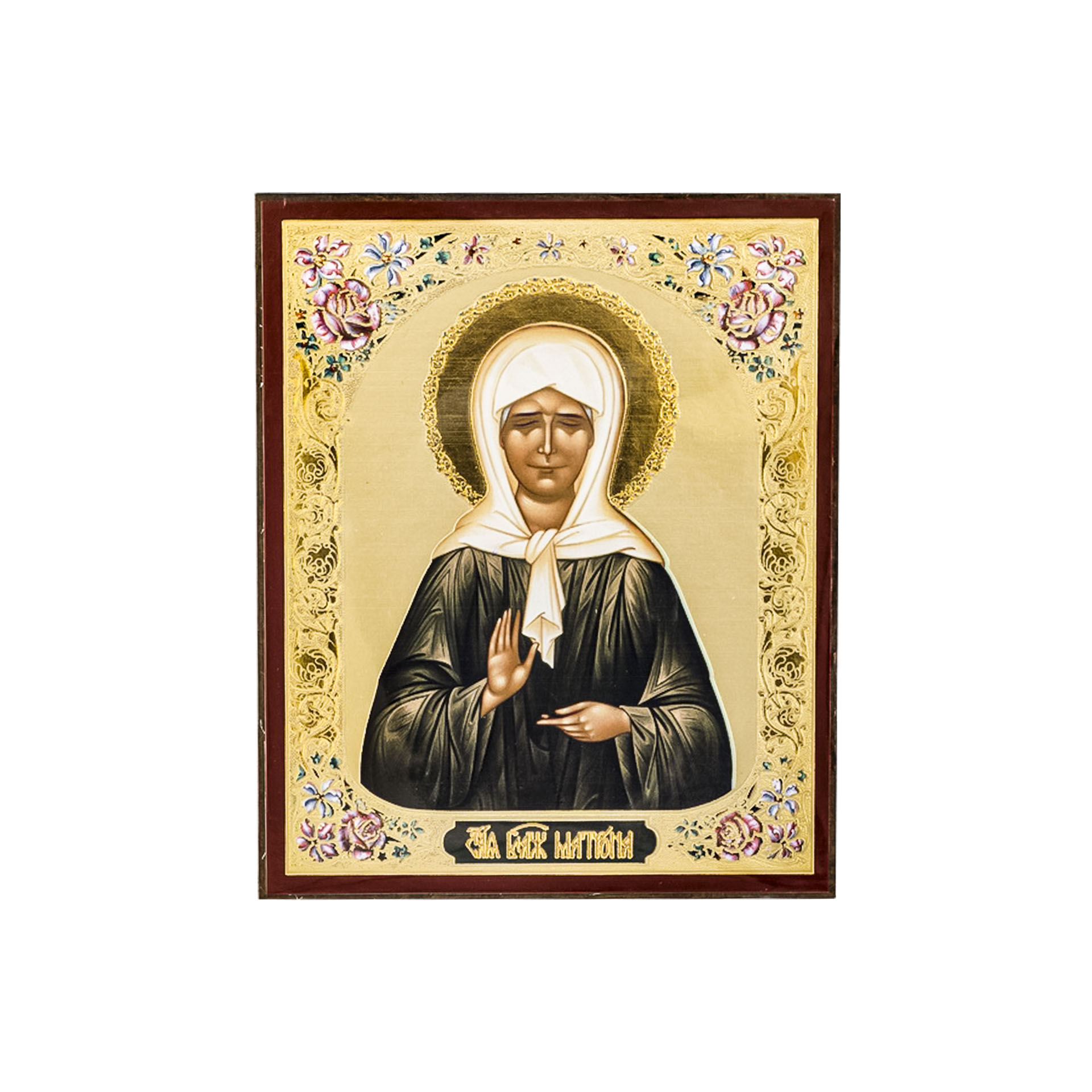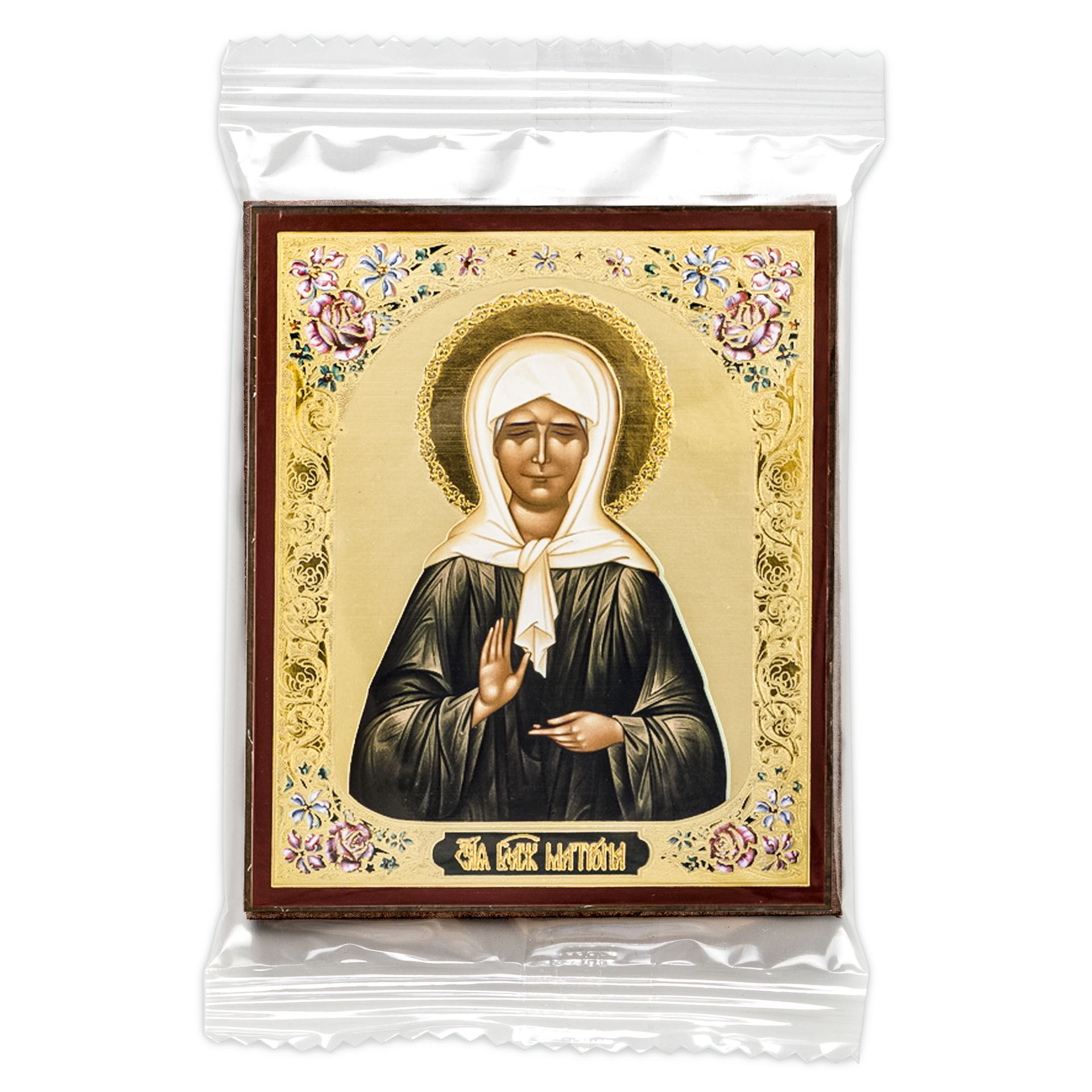 Икона на деревянном планшете 6х9 двойное тиснение, аннотация, упаковка Матрона Московская (рамка с цветами) 2