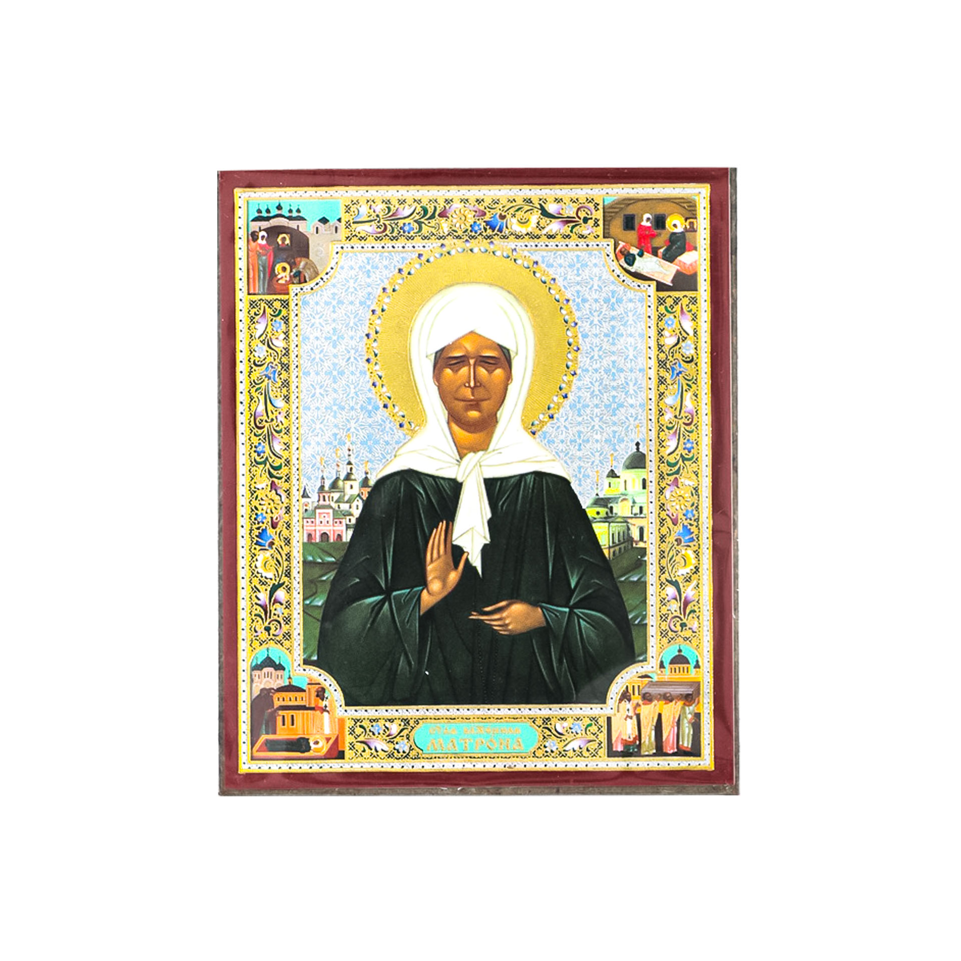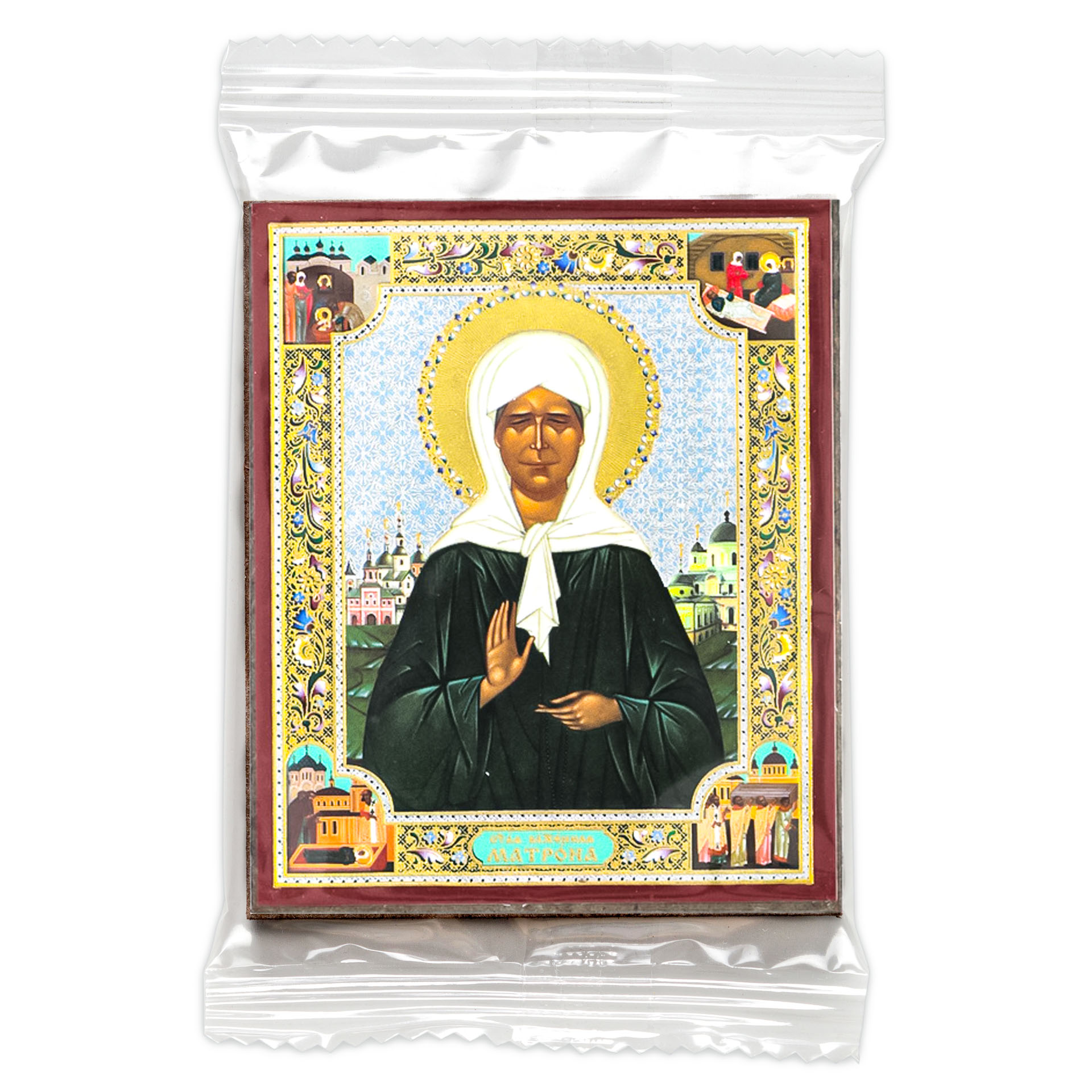 Икона на деревянном планшете 6х9 двойное тиснение, аннотация, упаковка Матрона Московская (с клеймами)