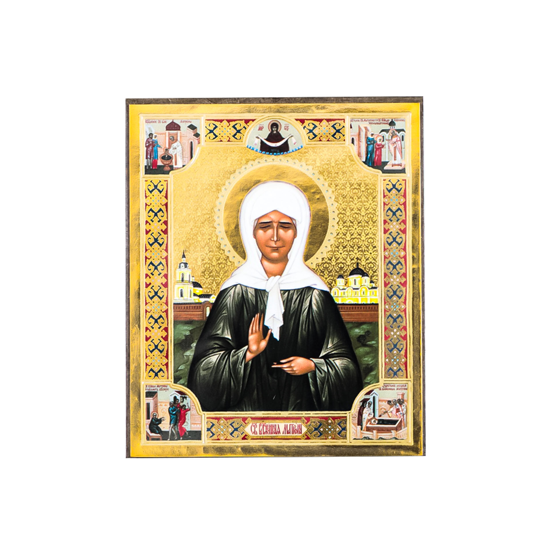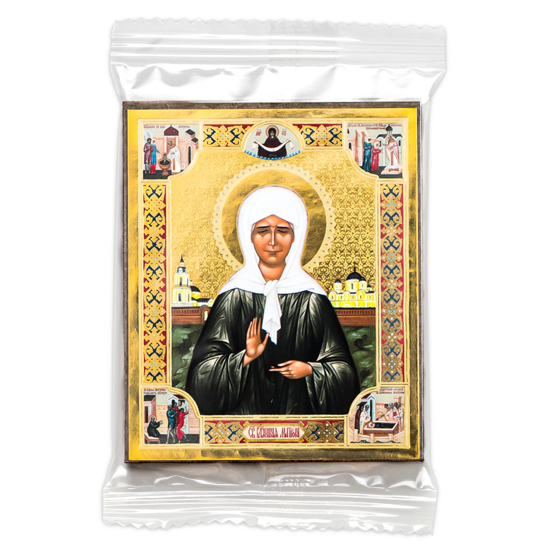 Икона на деревянном планшете 6х9 двойное тиснение, аннотация, упаковка Матрона Московская (с клеймами) (2)