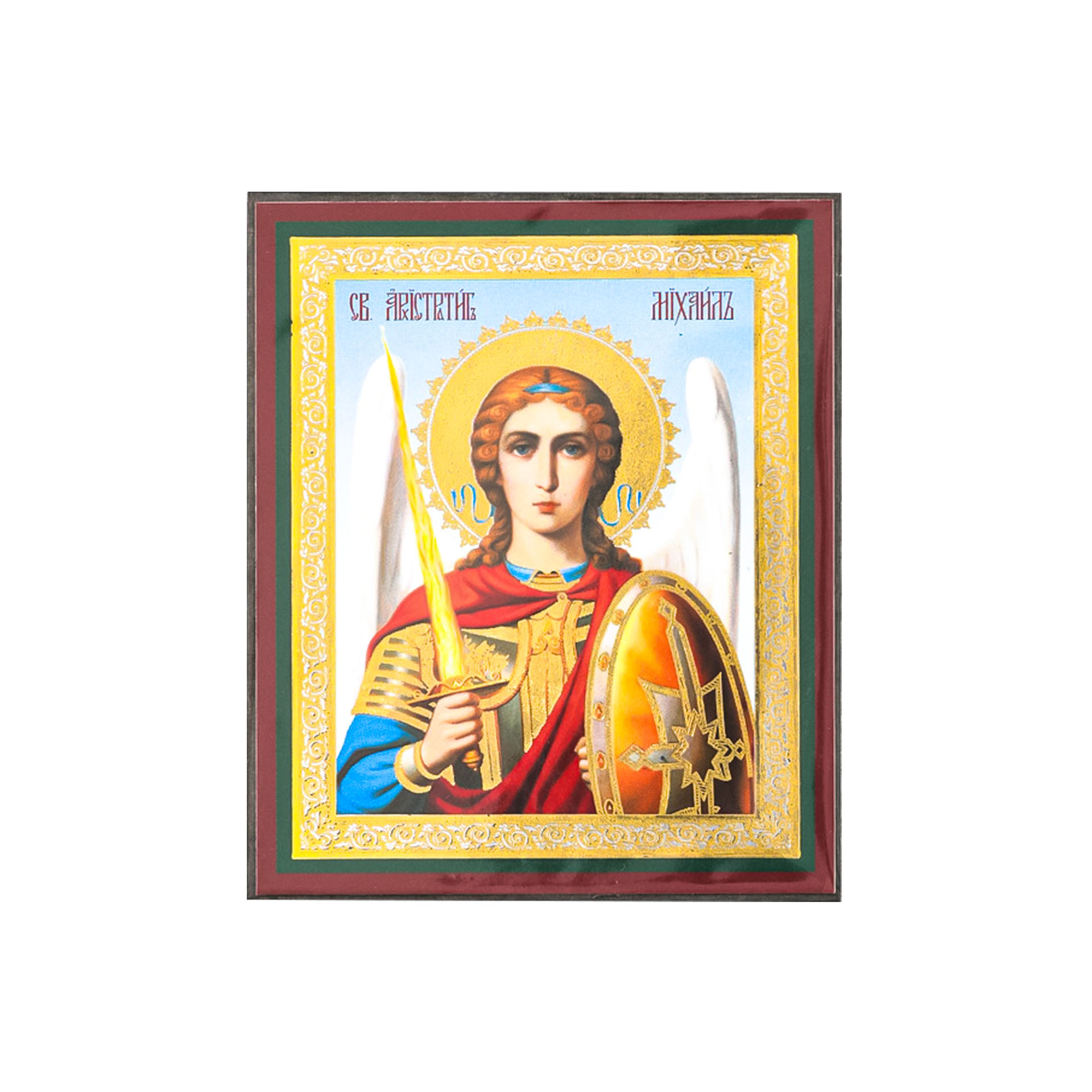 Икона на деревянном планшете 6х9 двойное тиснение, аннотация, упаковка Михаил Архангел (поясной)