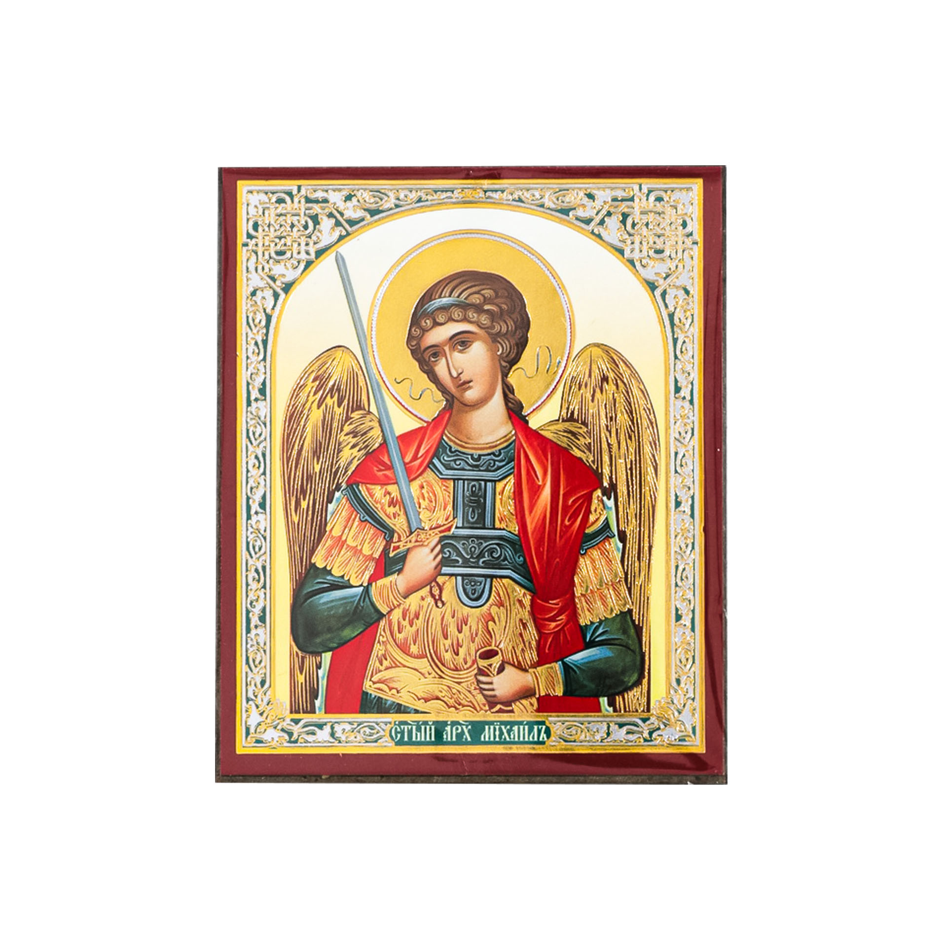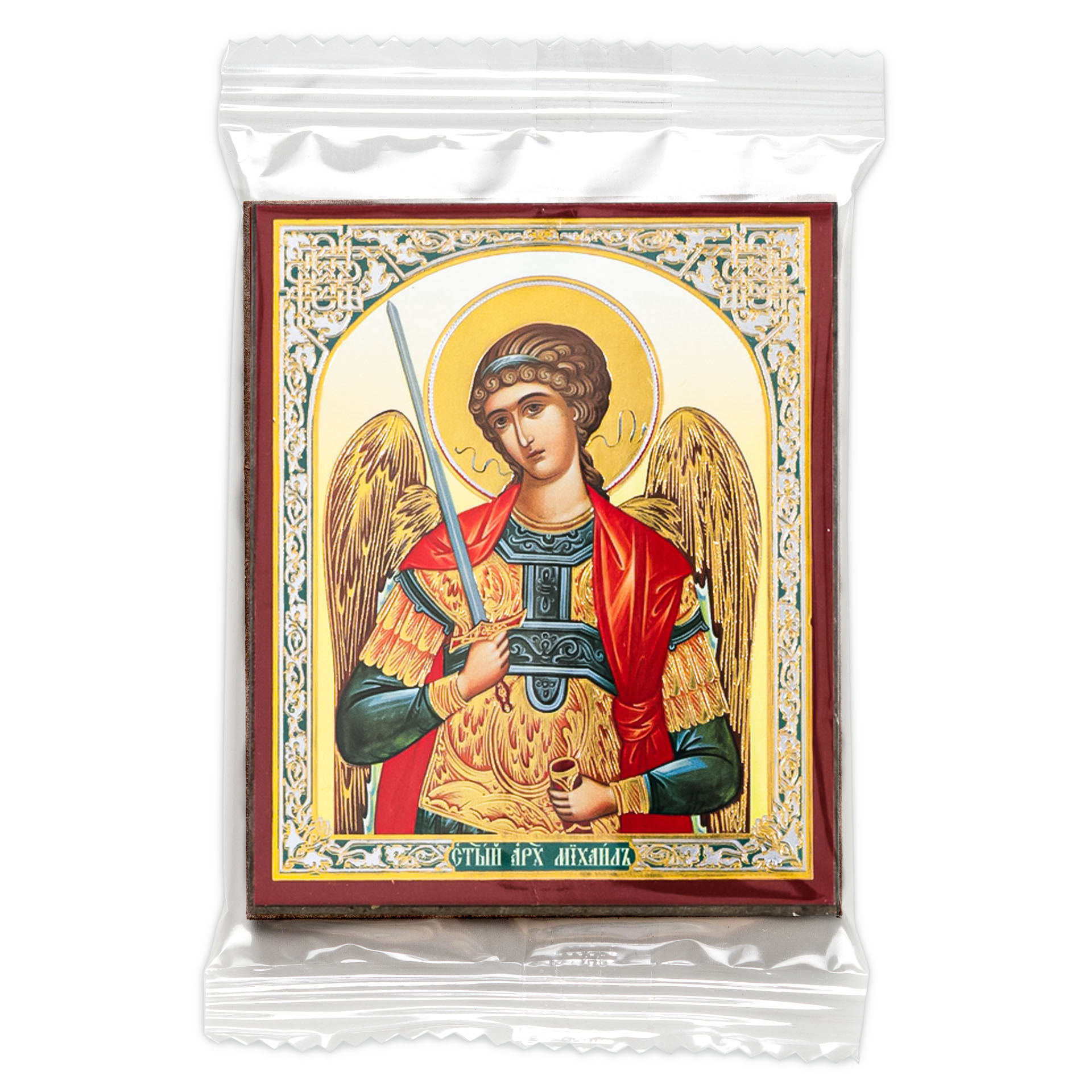 Икона на деревянном планшете 6х9 двойное тиснение, аннотация, упаковка Михаил Архангел (поясной) 4
