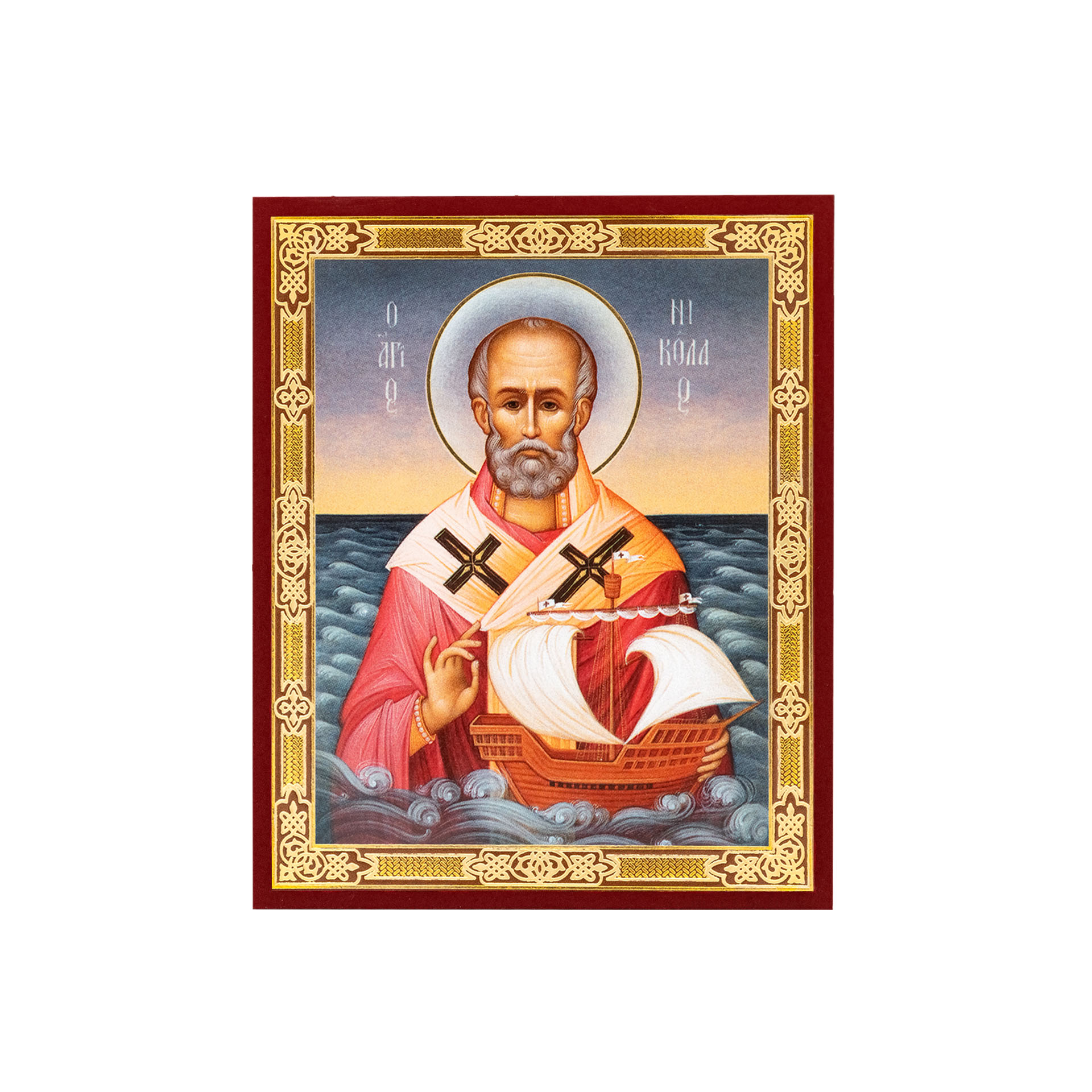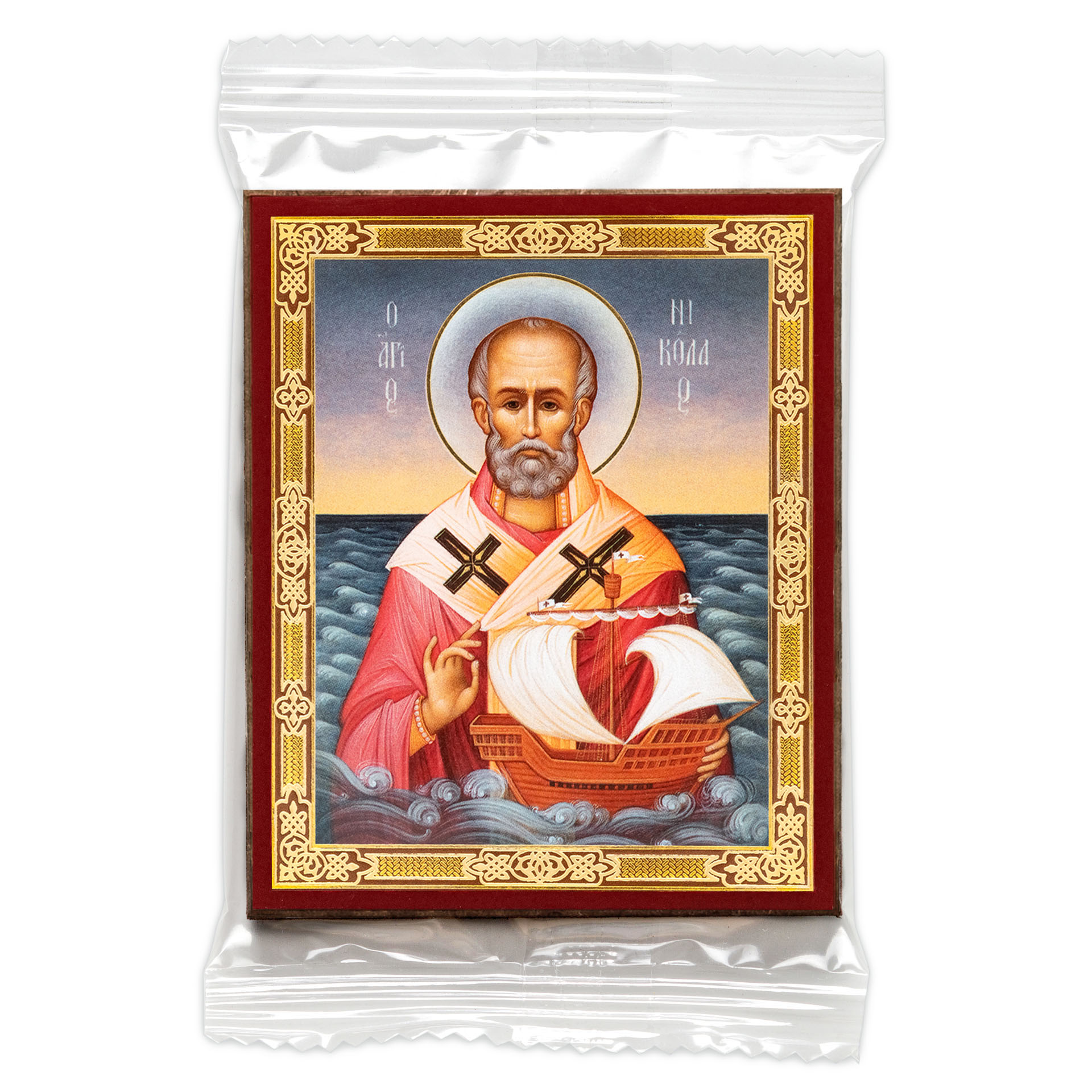 Икона на деревянном планшете 6х9 двойное тиснение, аннотация, упаковка Николай Чудотворец 19
